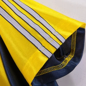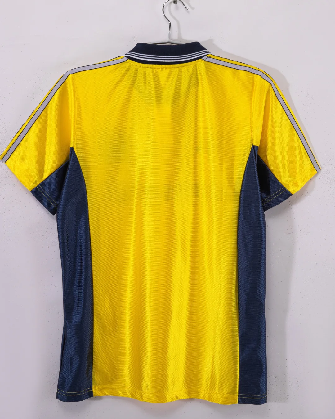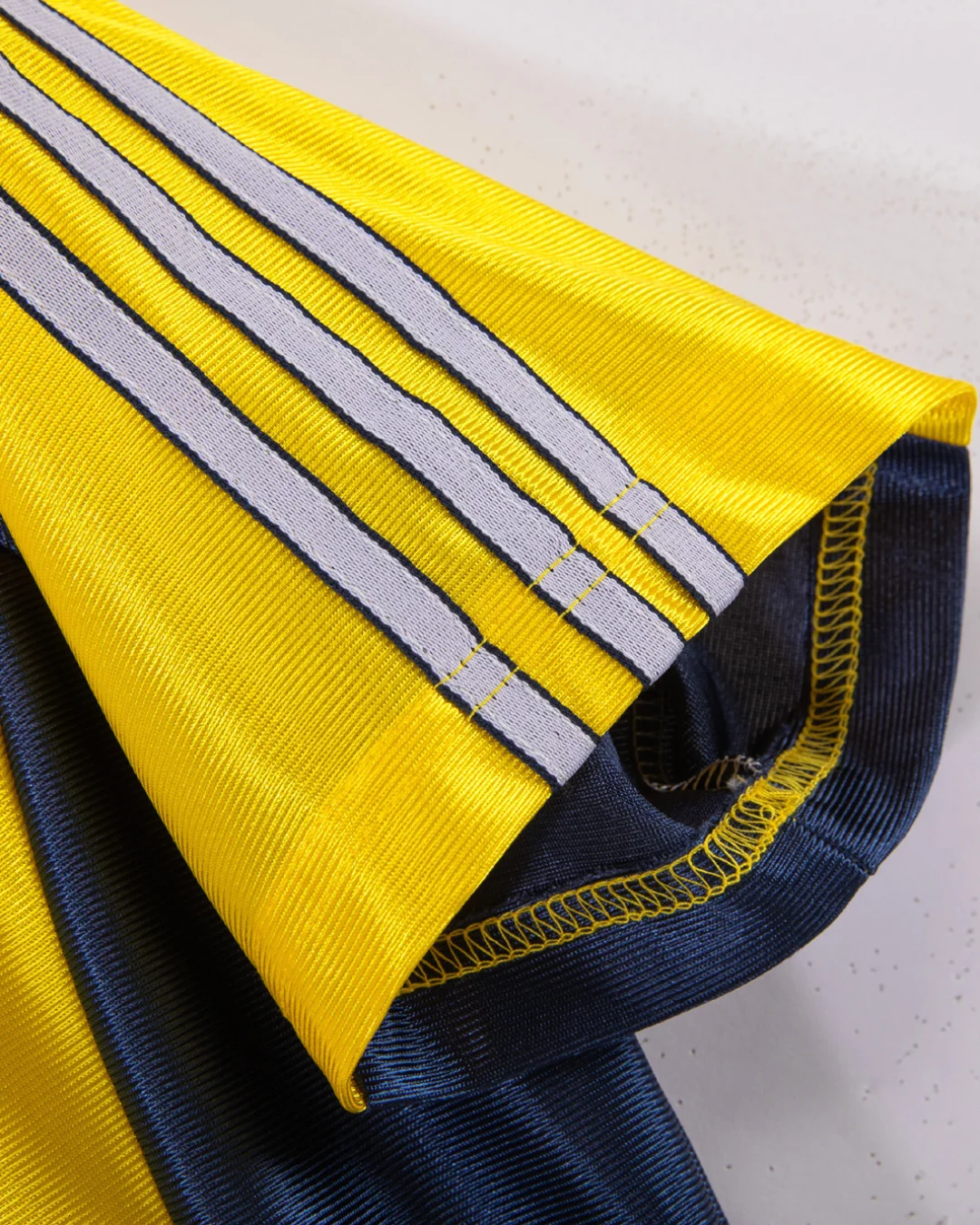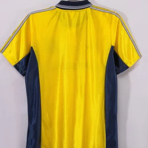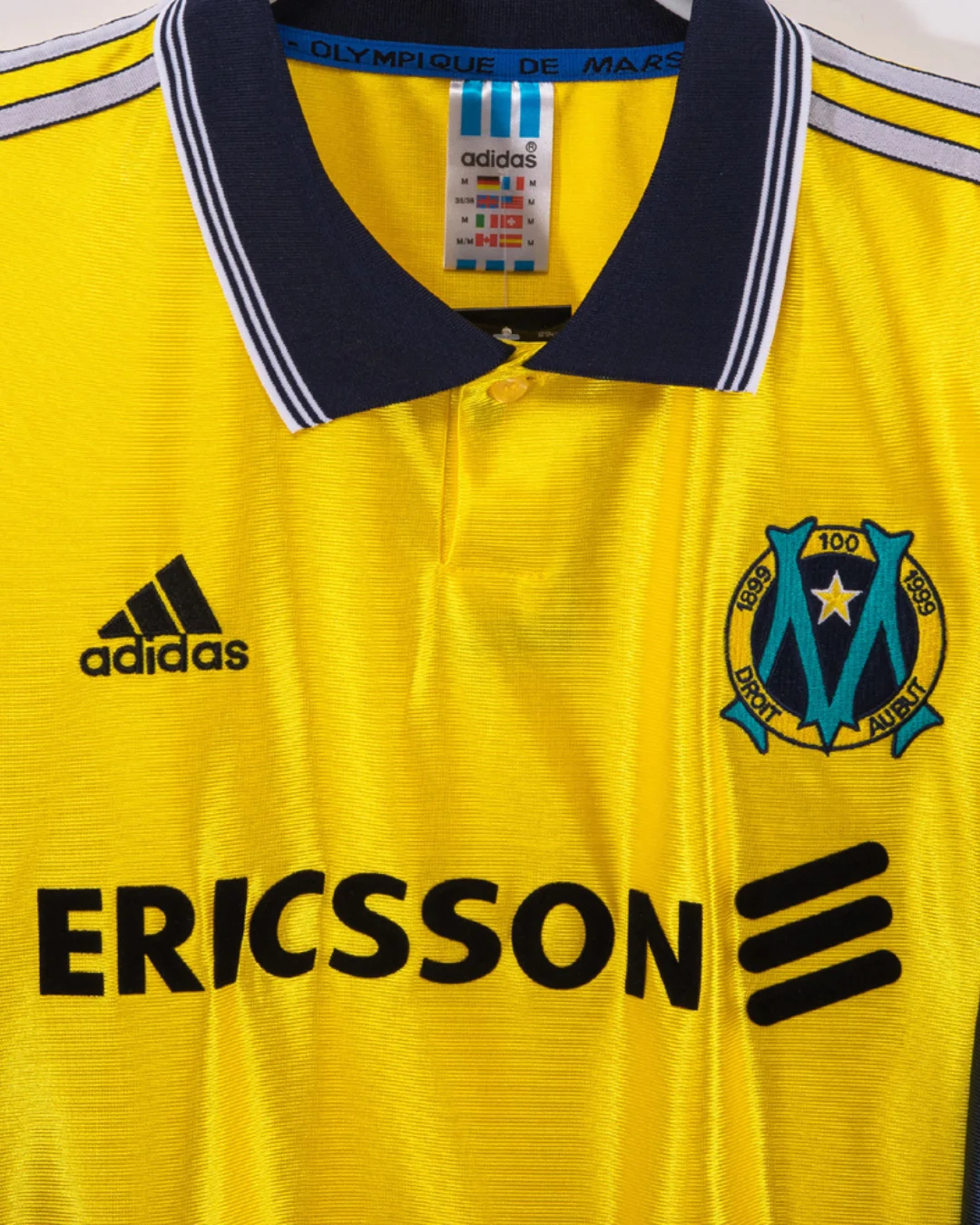 Celebrate the bold style and rich football heritage of Olympique de Marseille with the 1998/99 Third Jersey, a striking Adidas classic that stands out for its dynamic design and historical significance. This jersey features a vibrant yellow base color contrasted with navy blue details on the sides and sleeves, creating a visually striking and energetic look that captures the club’s resilient spirit.
