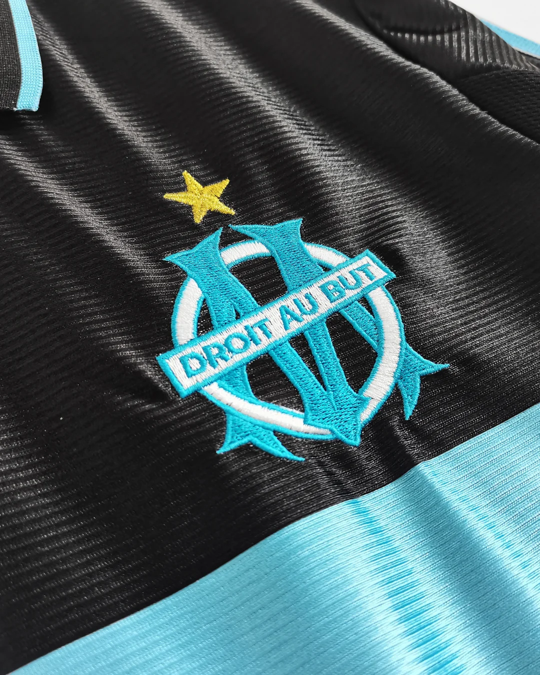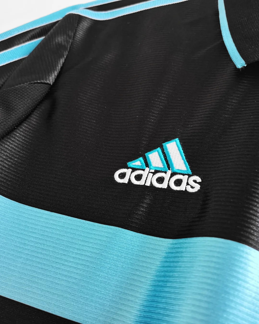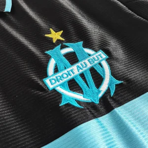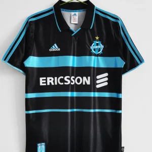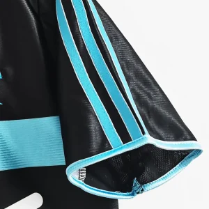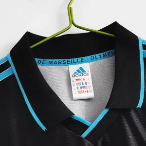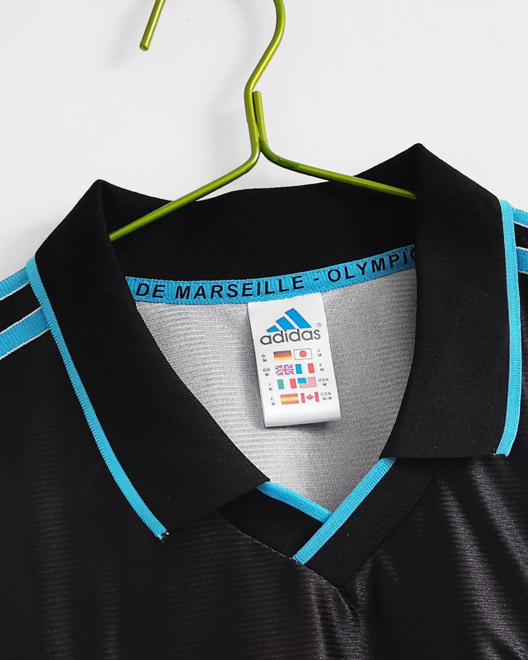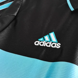 Step into a unique chapter of Olympique de Marseille’s history with the 1999/00 Third Jersey, a striking kit worn during a challenging yet defining season for the French club. This Adidas manufactured third shirt is distinctive with its sleek black base complemented by light blue trim, embodying both style and resilience.