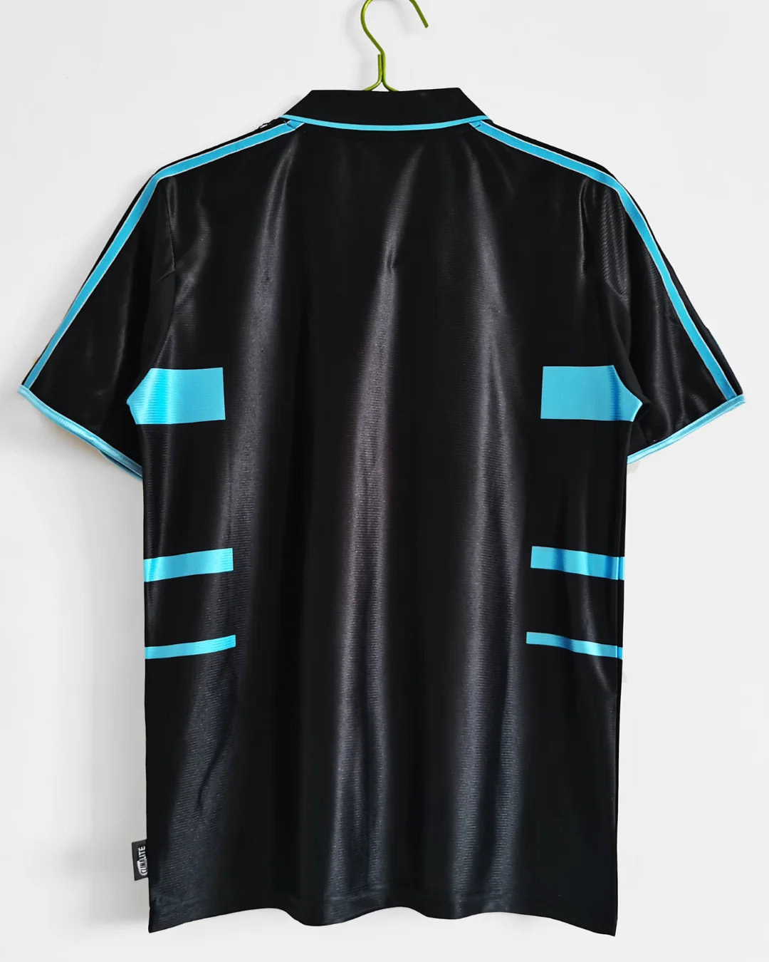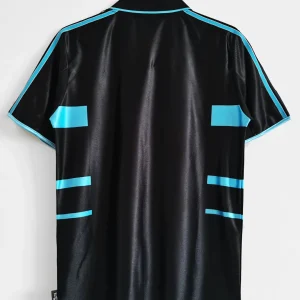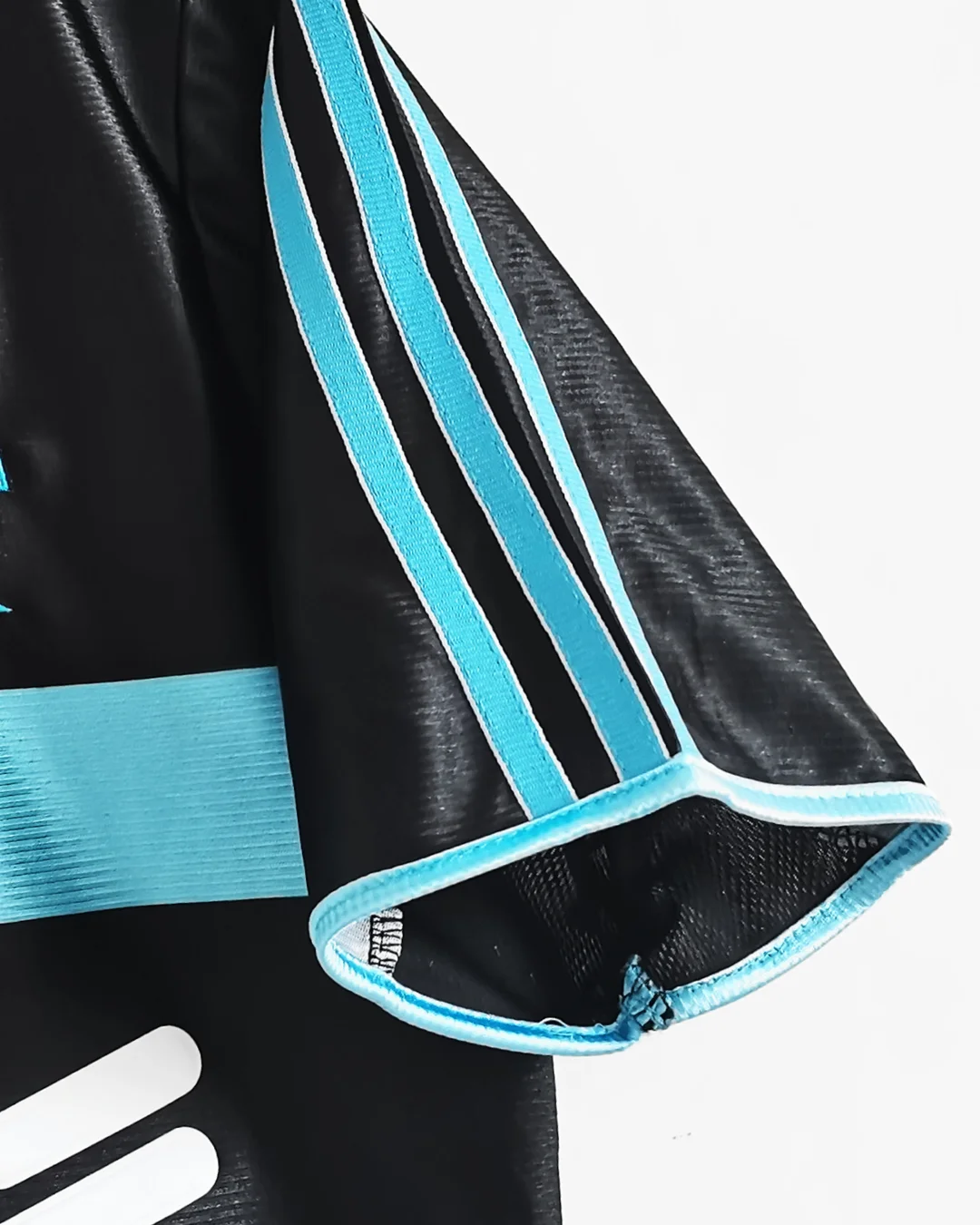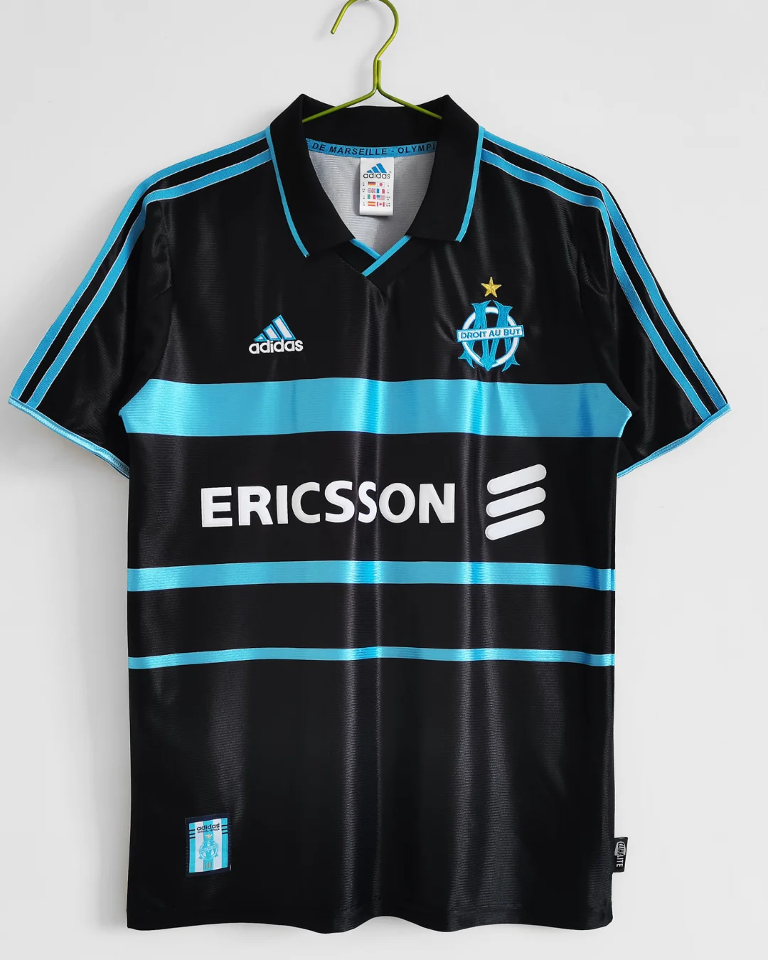 Step into a unique chapter of Olympique de Marseille’s history with the 1999/00 Third Jersey, a striking kit worn during a challenging yet defining season for the French club. This Adidas manufactured third shirt is distinctive with its sleek black base complemented by light blue trim, embodying both style and resilience.
