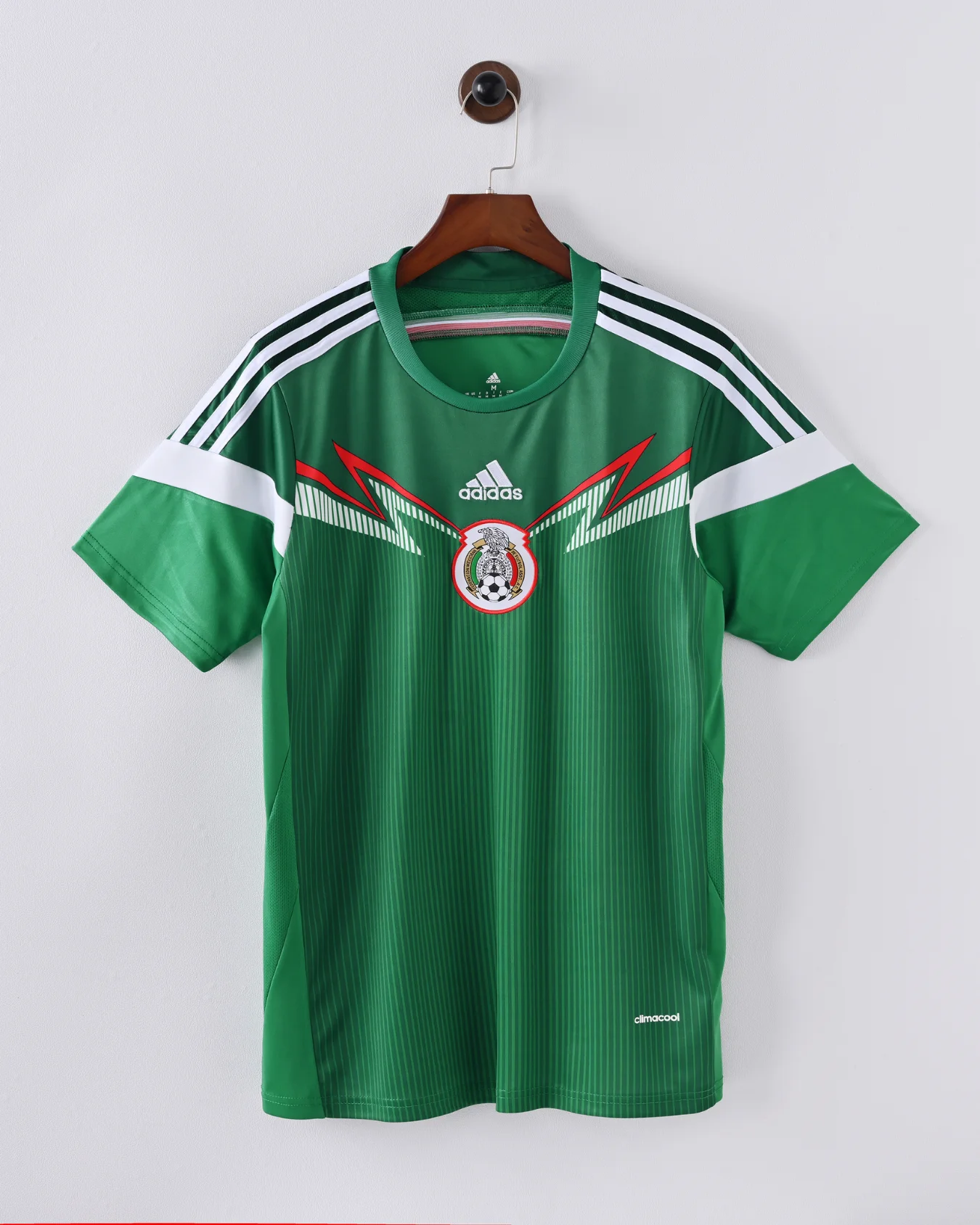 The Mexico 2014 Home Jersey is a striking celebration of national pride, heritage, and fearless design. Worn during an unforgettable World Cup campaign, this vibrant green kit turned heads not only for its electric performance on the pitch but also for its audacious aesthetic—marked by the dynamic thunderbolt chest graphic and deep red accents that broke from tradition while honoring it.