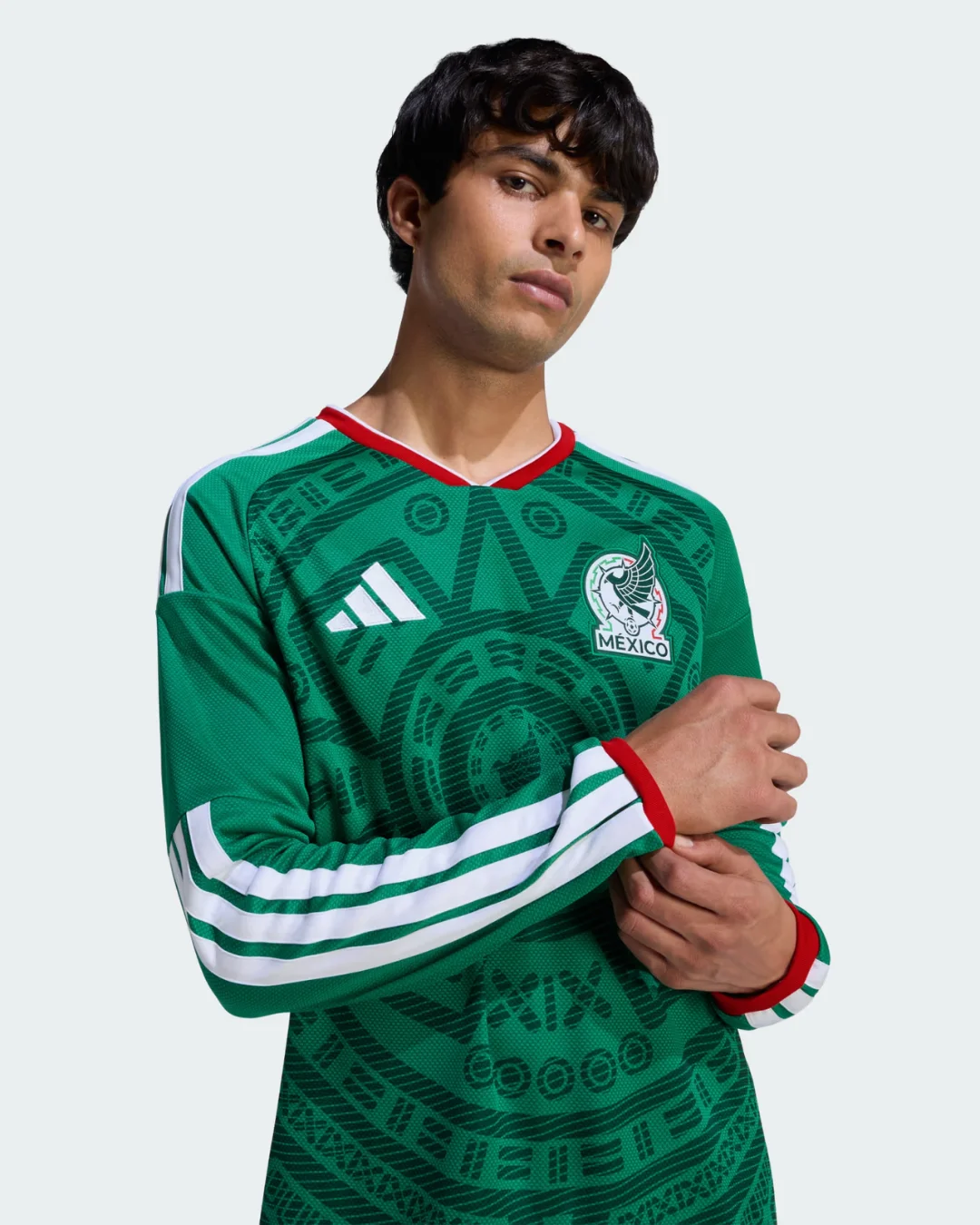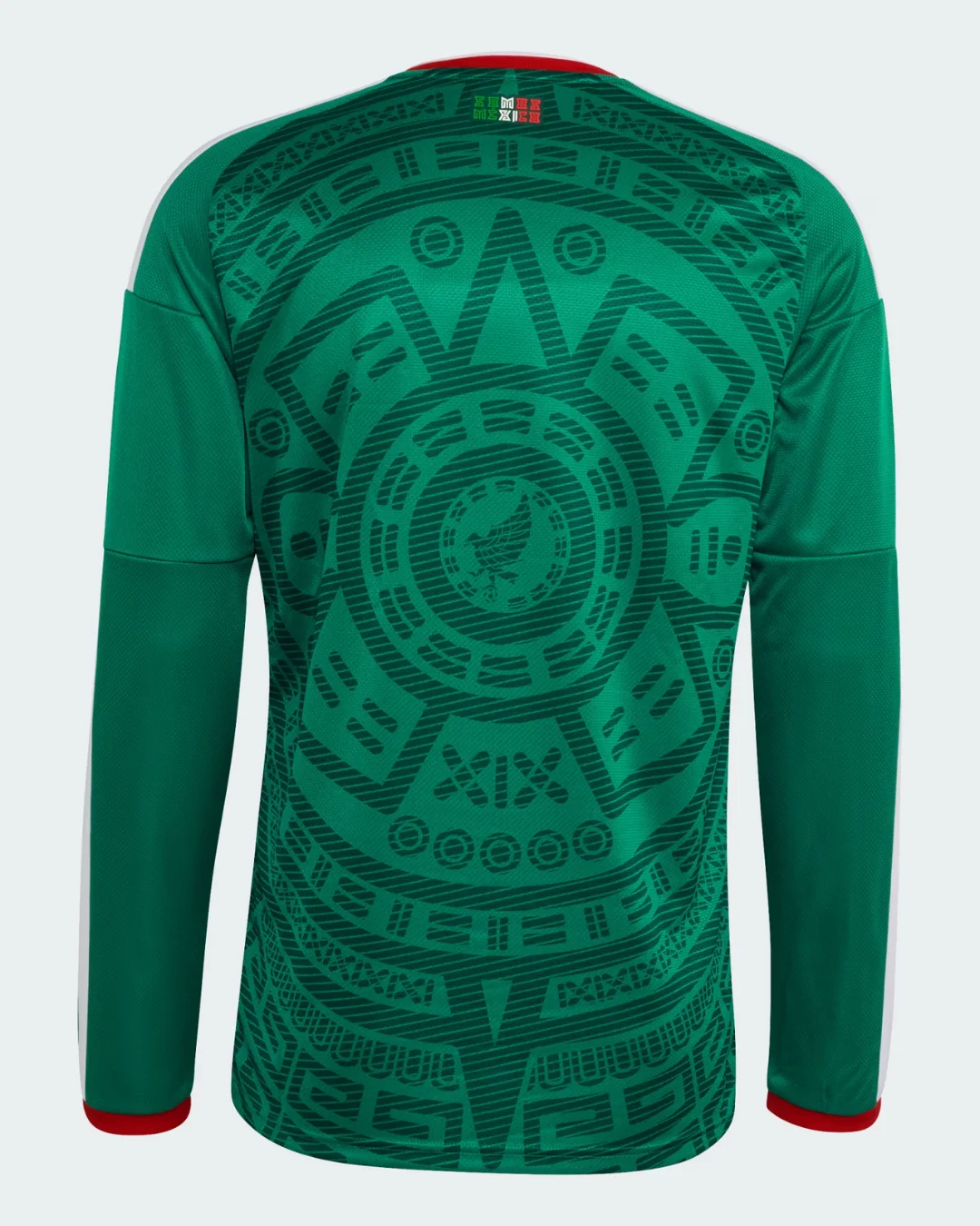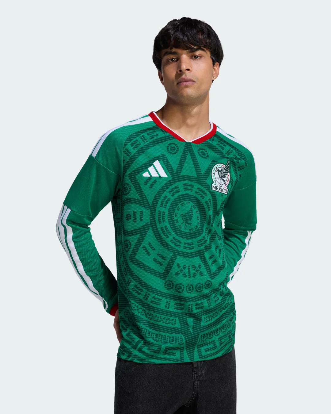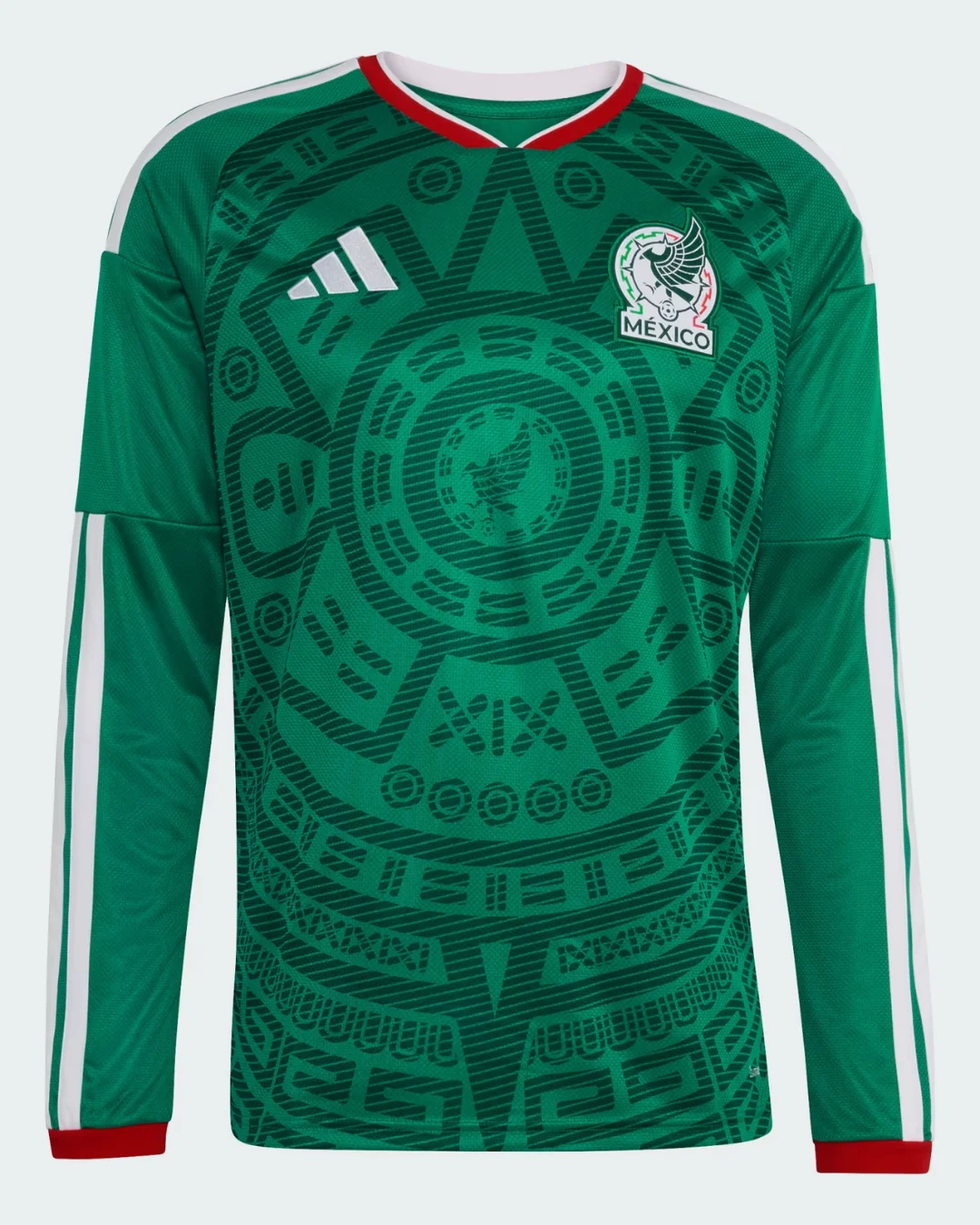Power El Tri’s co-hosting World Cup mission with the Mexico 2026 WC Home Stadium Long Sleeve Jersey from Adidas, celebrating iconic heritage. Rich green base inspired by the legendary 1998 World Cup jersey features intricate Aztec geometric patterns forming a central emblem, two-tone red and white collar, thicker white Adidas 3-Stripes on shoulders, stitched FMF eagle crest, “SOMOS MÉXICO” detail under back collar, long ribbed cuffs, and modern EQT neck debuted in CONCACAF qualifiers.