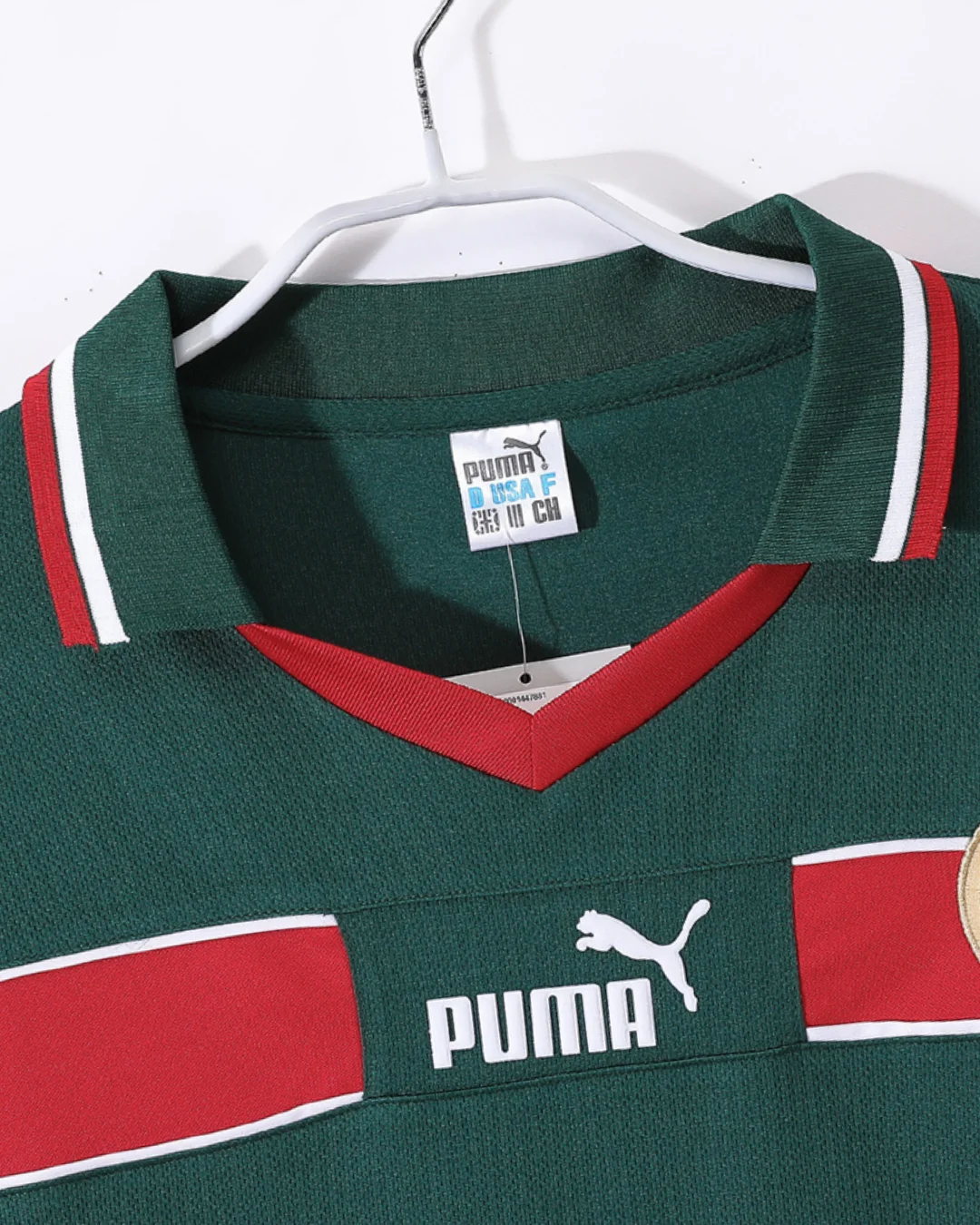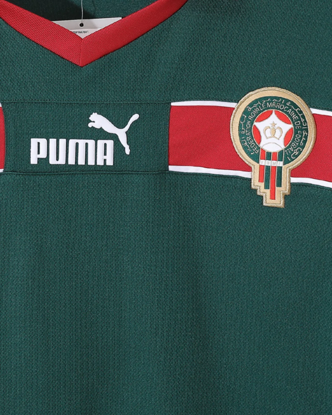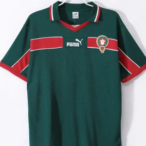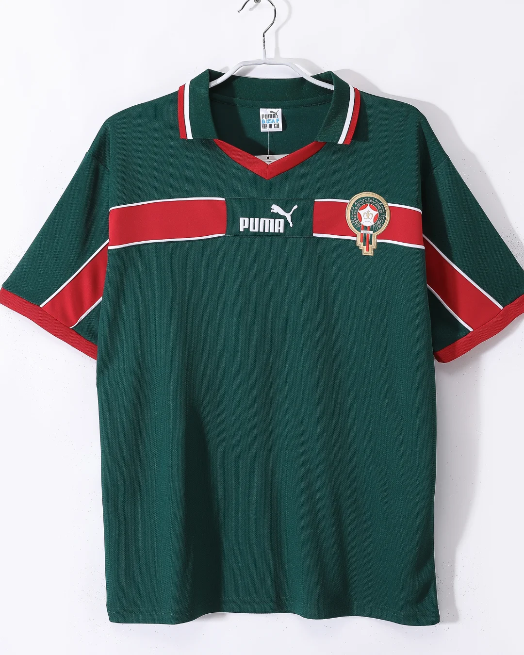 Show your support for Moroccan football with the 1998 Morocco Home Jersey, a striking and authentic retro kit worn during the 1998 FIFA World Cup. This jersey features a bold green base and a red stripe outlined by white encircling the chest, reflecting the colors and spirit of the Moroccan national team.