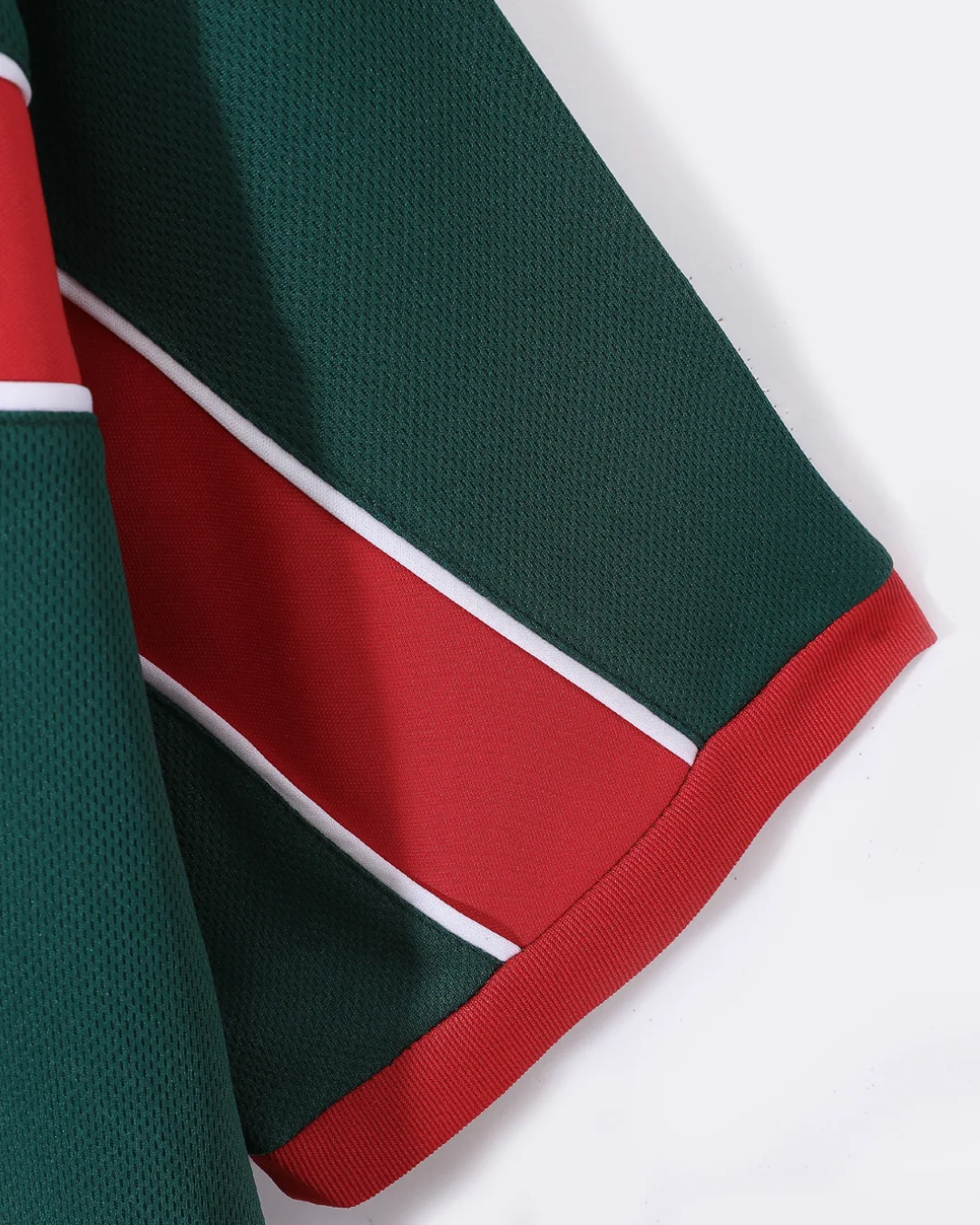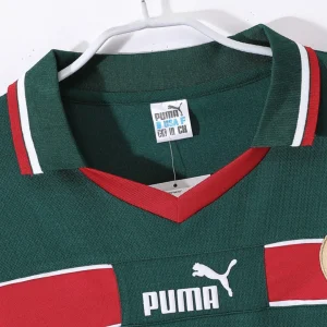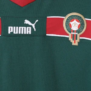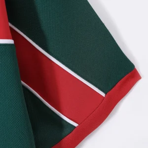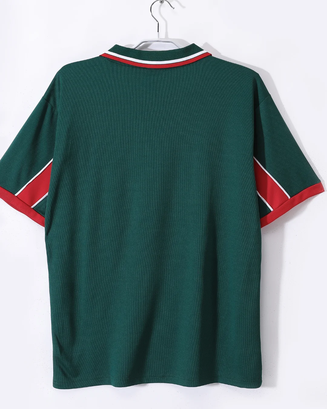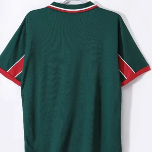 Show your support for Moroccan football with the 1998 Morocco Home Jersey, a striking and authentic retro kit worn during the 1998 FIFA World Cup. This jersey features a bold green base and a red stripe outlined by white encircling the chest, reflecting the colors and spirit of the Moroccan national team.