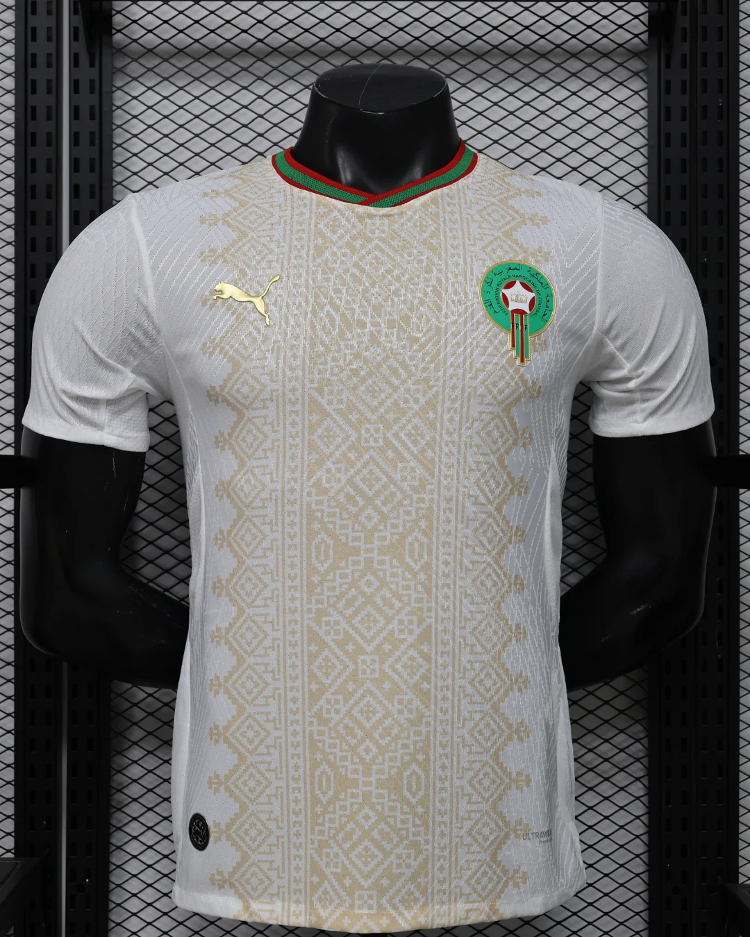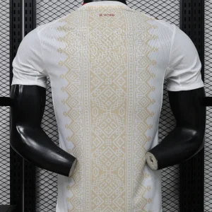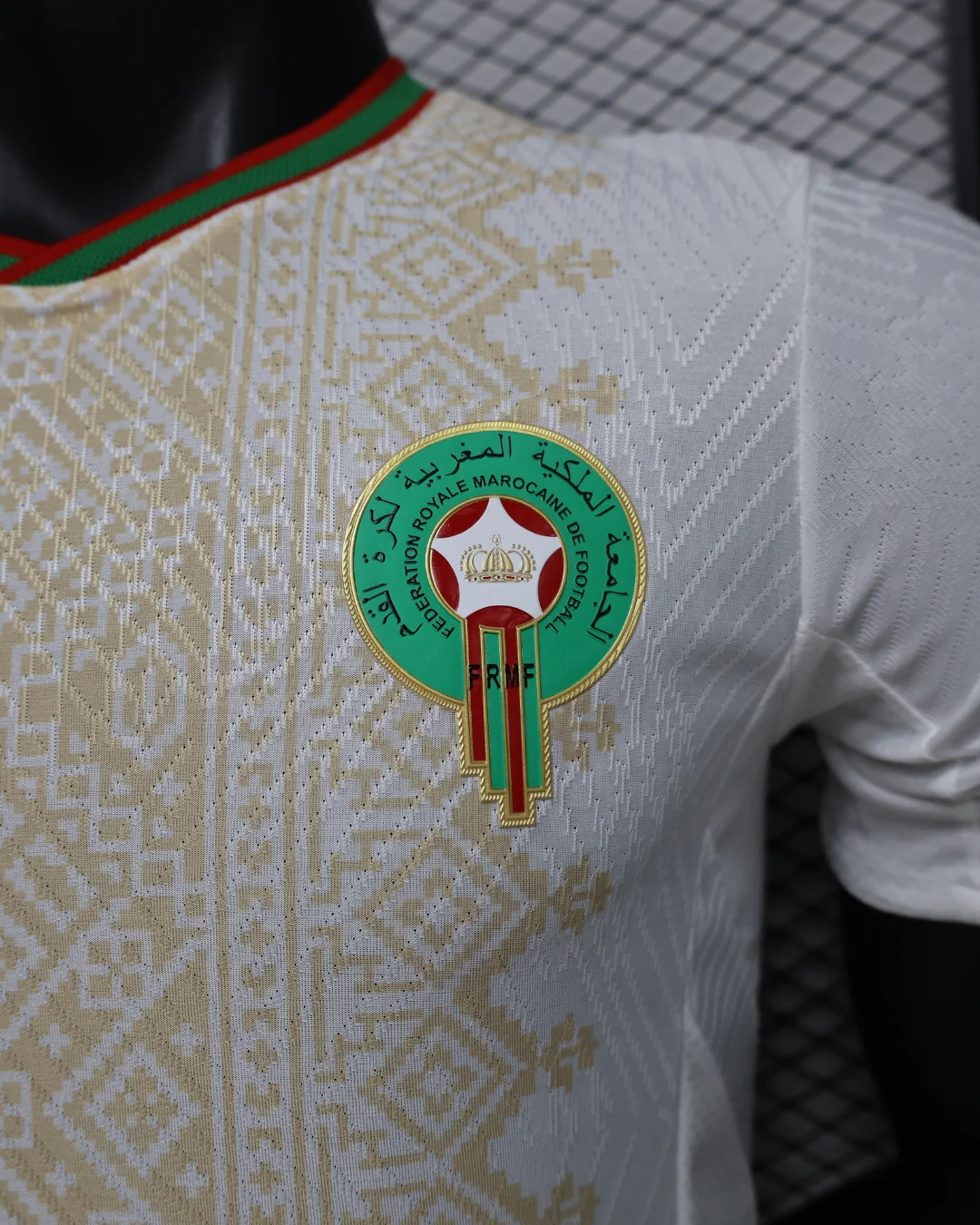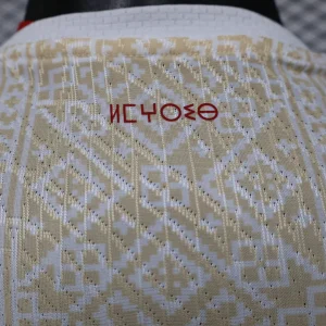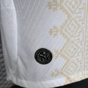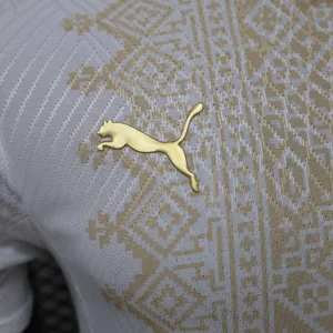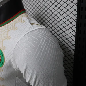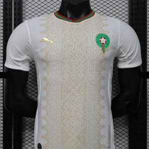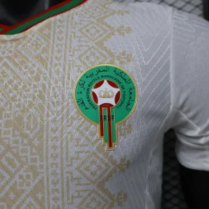 The Morocco 2026 WC Away Authentic Jersey brings a refined, cultural look to the Atlas Lions’ World Cup campaign. The shirt is built on a clean white base with a light gold geometric pattern across the front, inspired by traditional Moroccan tiles, rugs, and textiles, while the collar and sleeve cuffs add red and green trim to reflect the colors of the Moroccan flag. Designed for elite performance, the authentic version uses a slim match fit and lightweight performance polyester, giving it the same streamlined feel worn on the pitch.