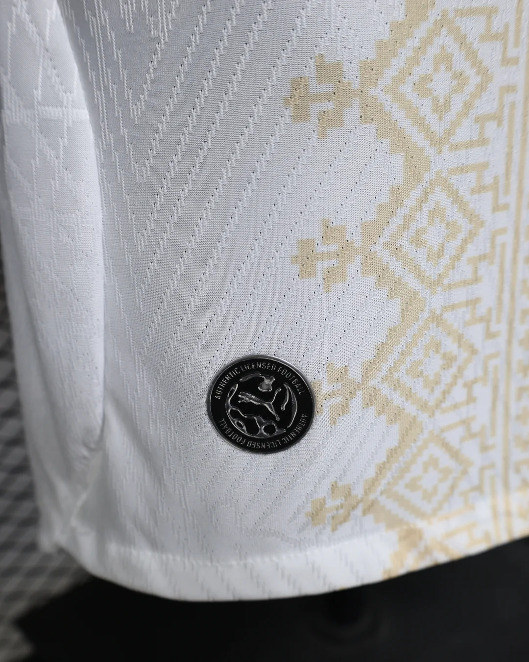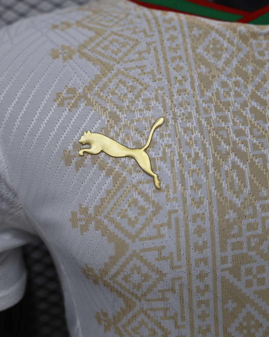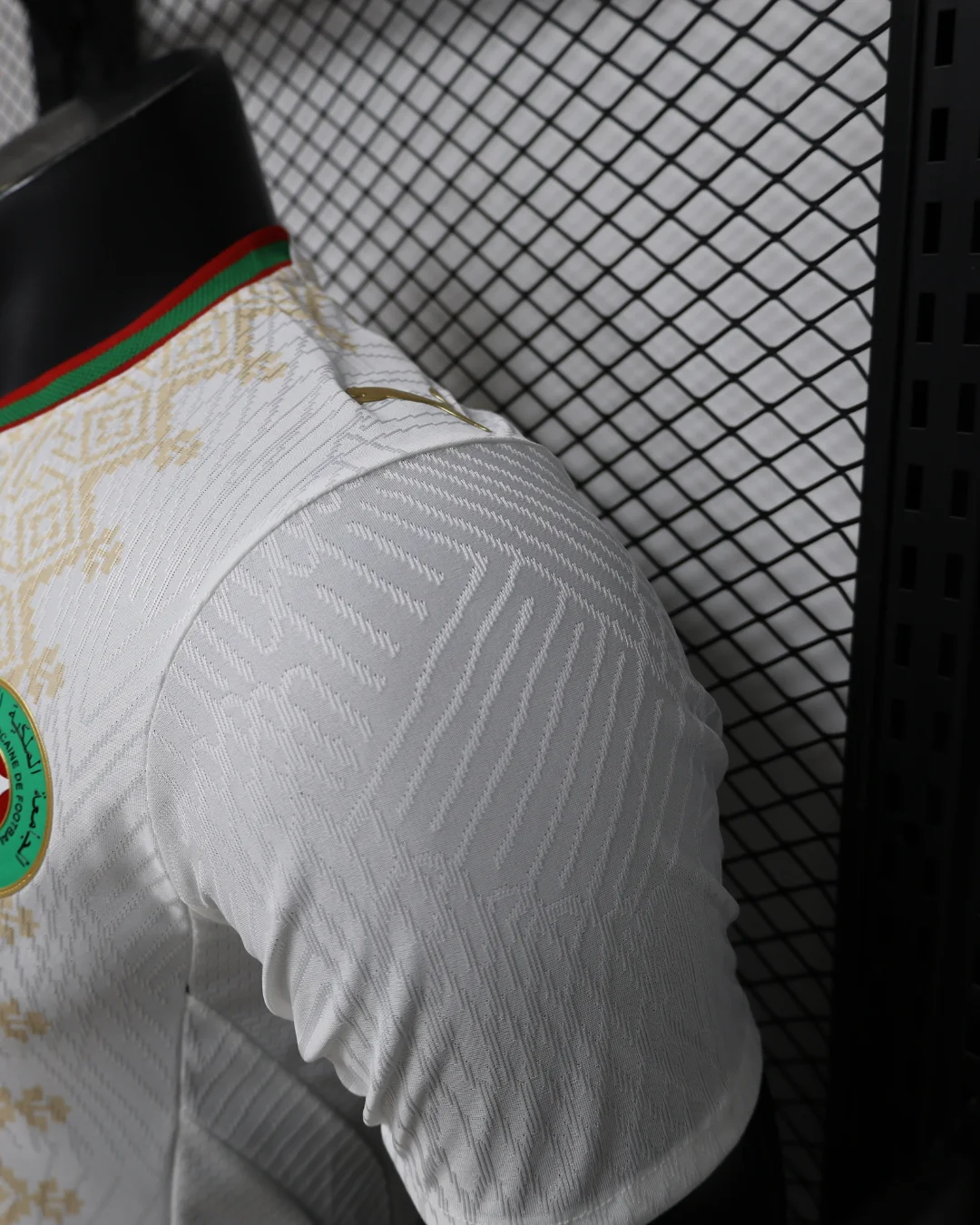 The Morocco 2026 WC Away Authentic Jersey brings a refined, cultural look to the Atlas Lions’ World Cup campaign. The shirt is built on a clean white base with a light gold geometric pattern across the front, inspired by traditional Moroccan tiles, rugs, and textiles, while the collar and sleeve cuffs add red and green trim to reflect the colors of the Moroccan flag. Designed for elite performance, the authentic version uses a slim match fit and lightweight performance polyester, giving it the same streamlined feel worn on the pitch.