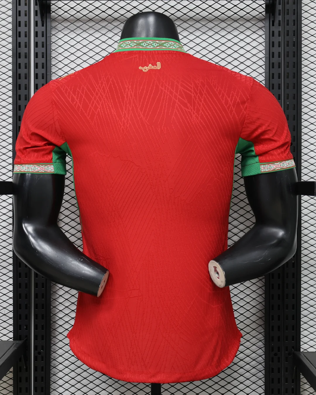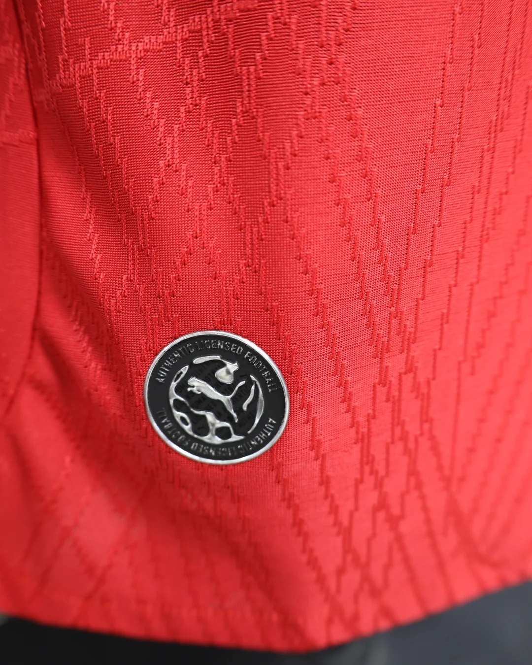 Fuel the Atlas Lions’ fearless World Cup charge with the Morocco 2026 Home Authentic Jersey from Puma. Featuring a vibrant red base blending traditional Moroccan zellij mosaic patterns with subtle Tamazight (Amazigh) lettering celebrating cultural heritage, it incorporates green accents on collar and cuffs plus white detailing evoking national pride and the 2022 semi-final legacy. Engineered from 100% recycled polyester with ULTRAWEAVE fabric and dryCELL moisture-wicking technology, this jersey delivers elite breathability, lightweight agility, and a slim authentic match fit identical to what stars wear on global stages.