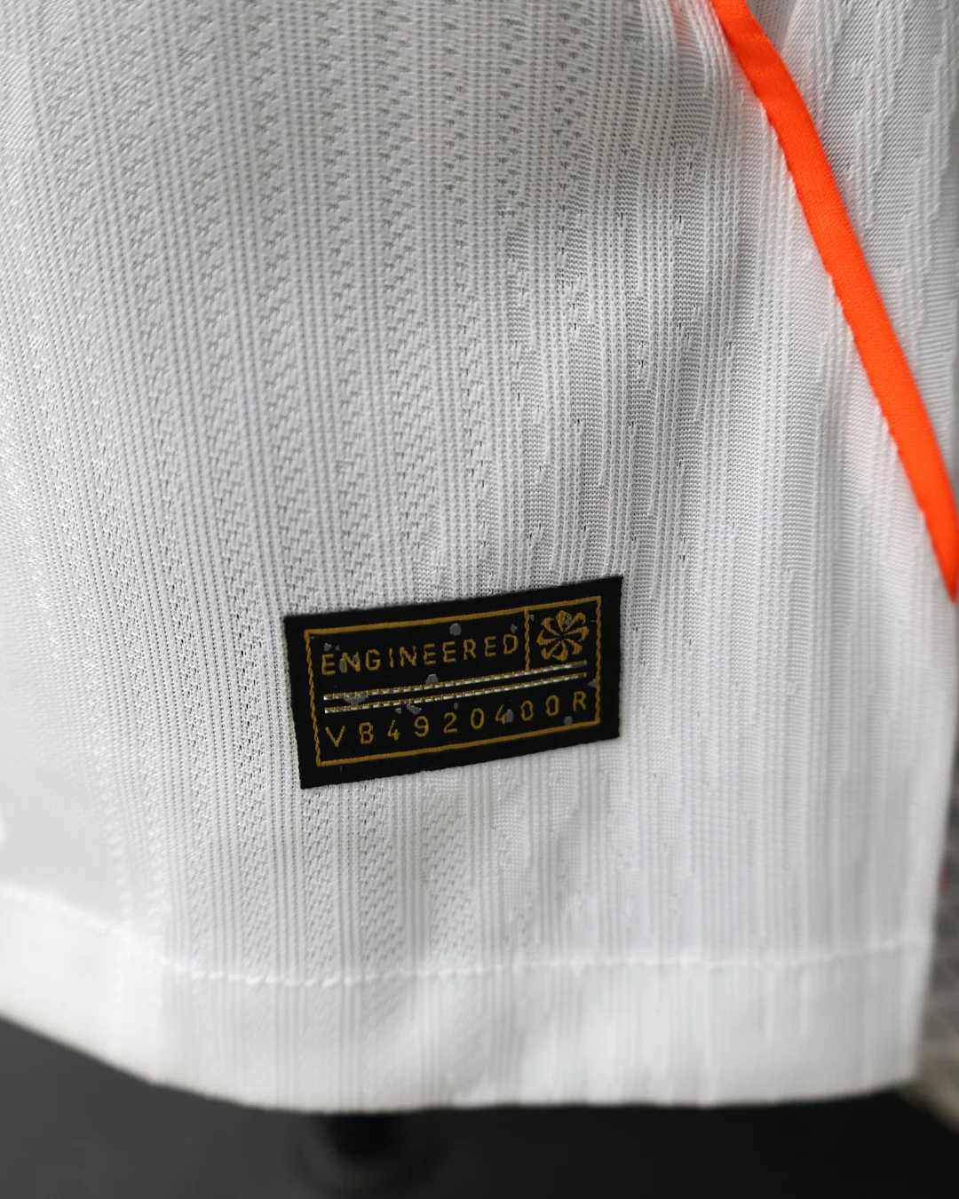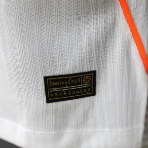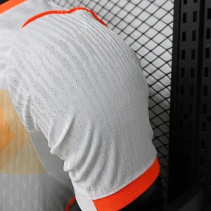 The Netherlands 2026 WC Away Authentic Jersey comes in a clean white base with vivid orange detailing across the chest, giving the shirt a sharp and modern away look for the World Cup. The design features a horizontal chest band in layered orange gradients, with the KNVB crest positioned centrally inside the band and a matching Nike Swoosh on the right chest.