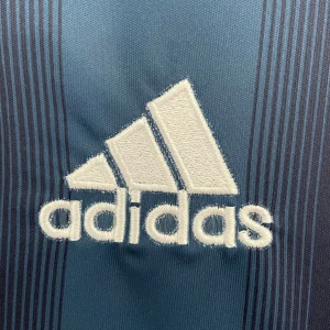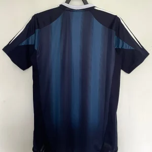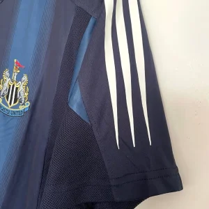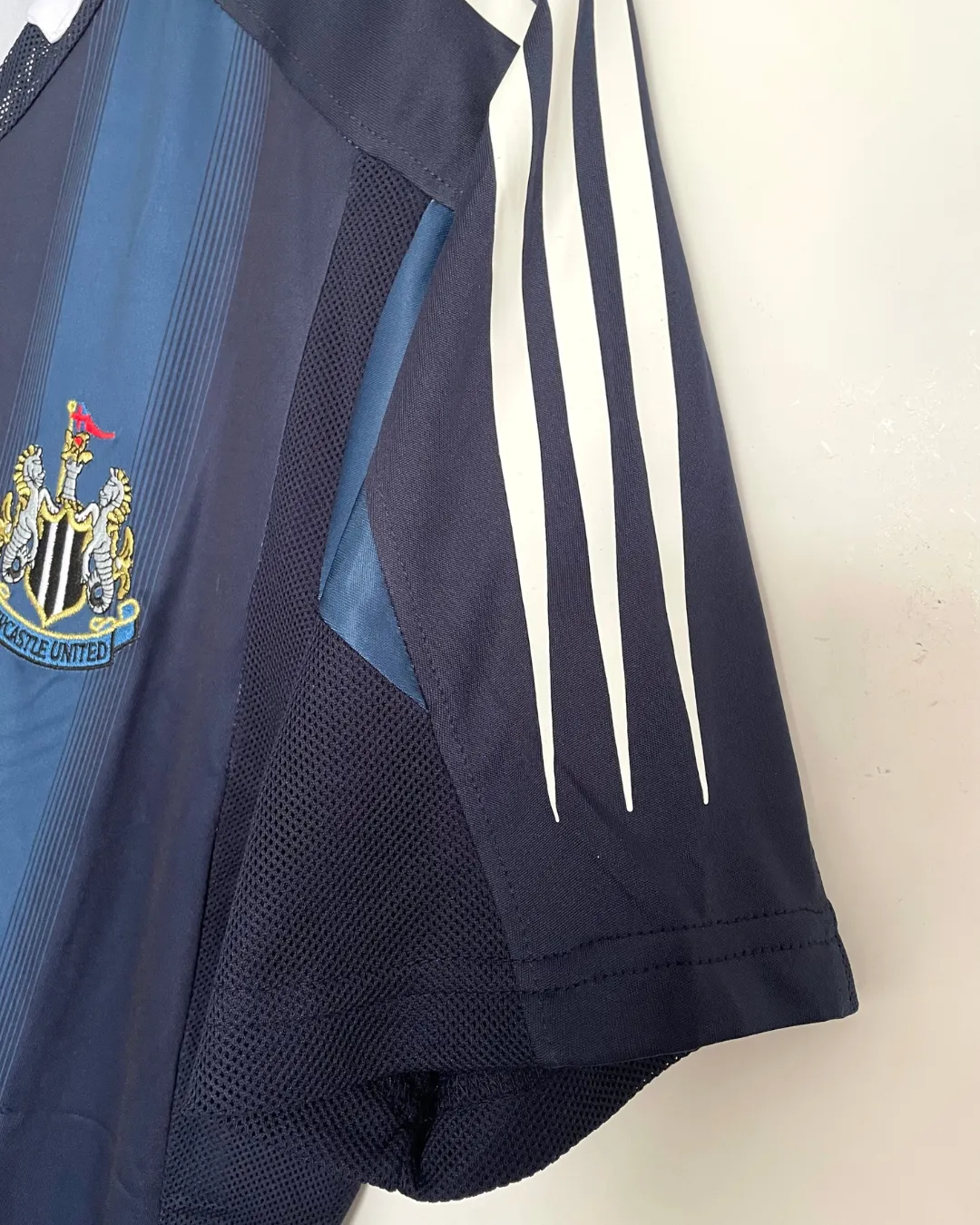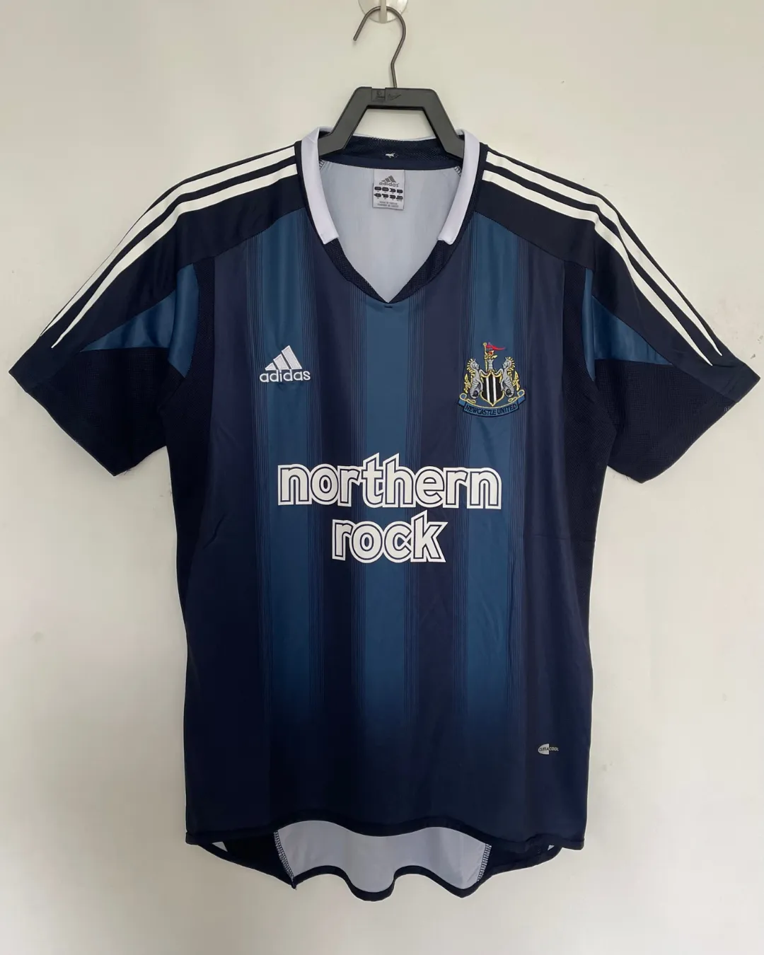 Power through Tyneside with Newcastle United’s striking 2004/05 Away Jersey from Adidas, worn by Alan Shearer, Craig Bellamy, Patrick Kluivert, and Nicky Butt during a gritty Premier League survival campaign. The bold dark blue base features navy stripes with crisp white trim on the V-neck collar and sleeve cuffs, accented by the embroidered black and white Newcastle crest on the left chest and Adidas three stripes on the right shoulder.