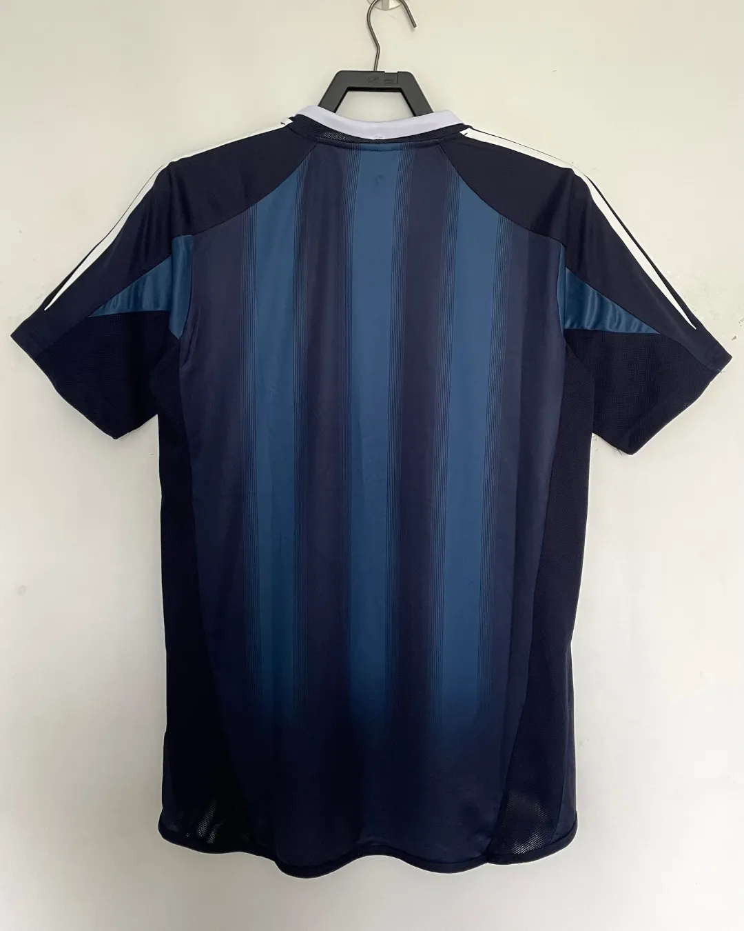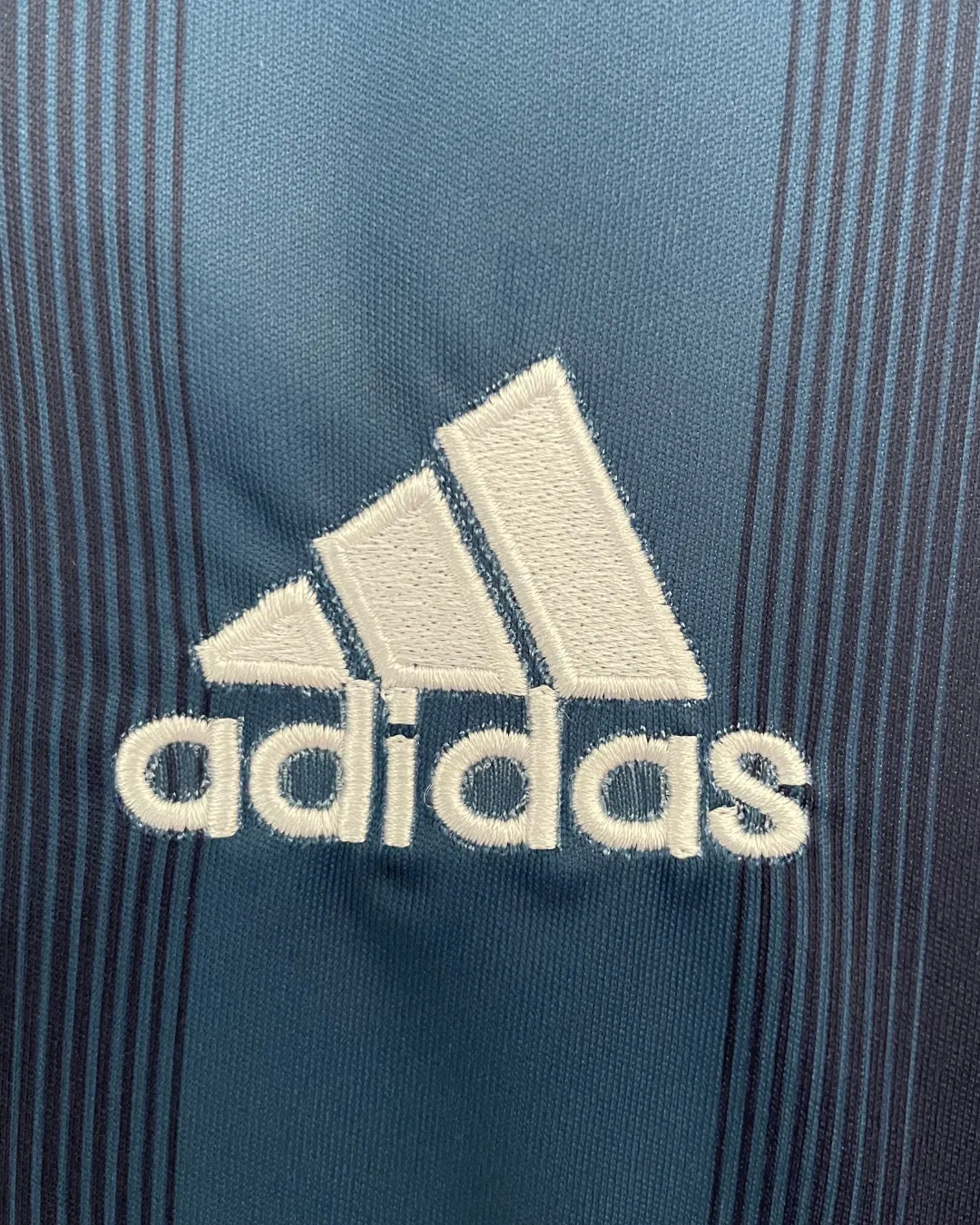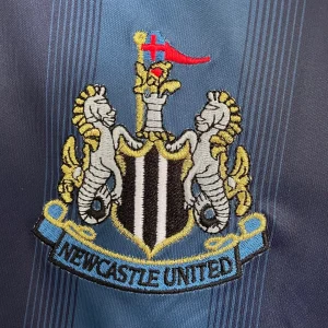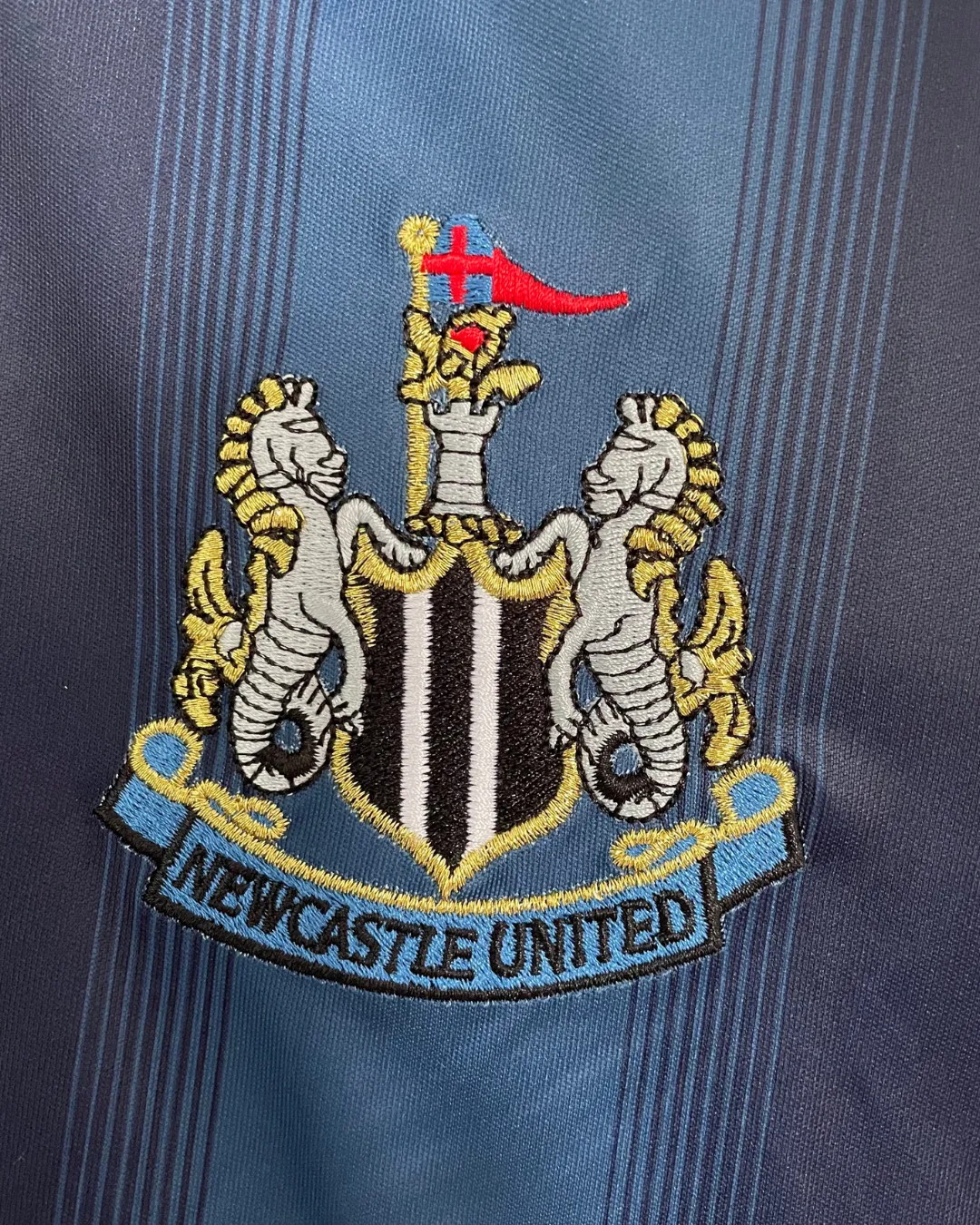 Power through Tyneside with Newcastle United’s striking 2004/05 Away Jersey from Adidas, worn by Alan Shearer, Craig Bellamy, Patrick Kluivert, and Nicky Butt during a gritty Premier League survival campaign. The bold dark blue base features navy stripes with crisp white trim on the V-neck collar and sleeve cuffs, accented by the embroidered black and white Newcastle crest on the left chest and Adidas three stripes on the right shoulder.
