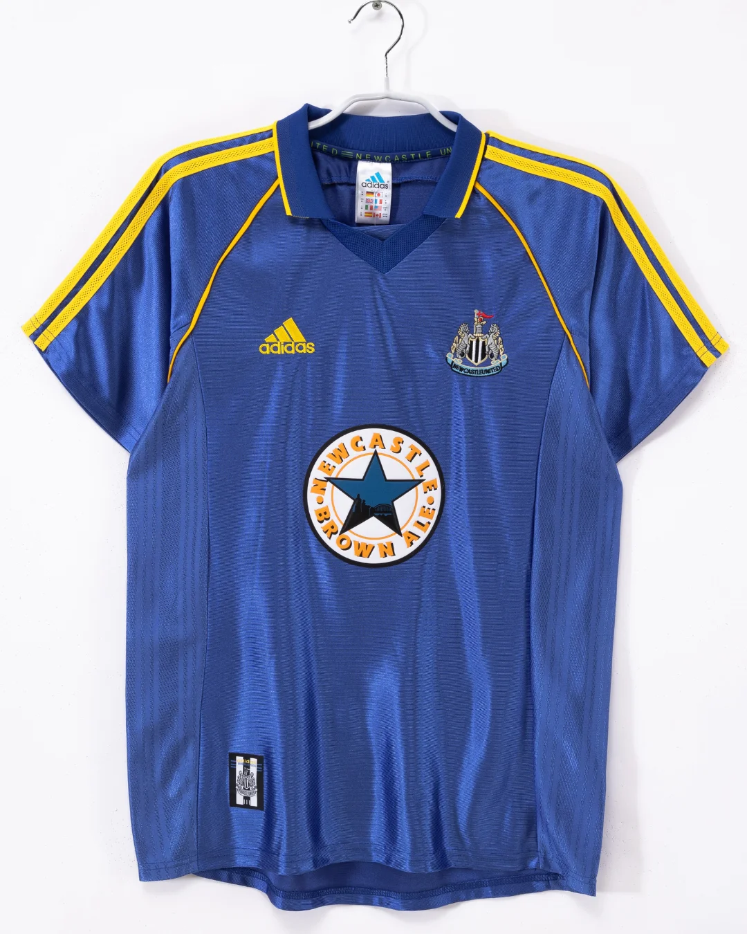 Step back into a dramatic season with the Newcastle United 1998/99 Away Jersey, a navy blue classic adorned with vibrant gold detailing, reflecting the bold style of the Magpies in an era of highs and lows. This Adidas-designed kit features a streamlined V-neck collar and the iconic Newcastle Brown Ale sponsor logo, which became synonymous with the club during this period.