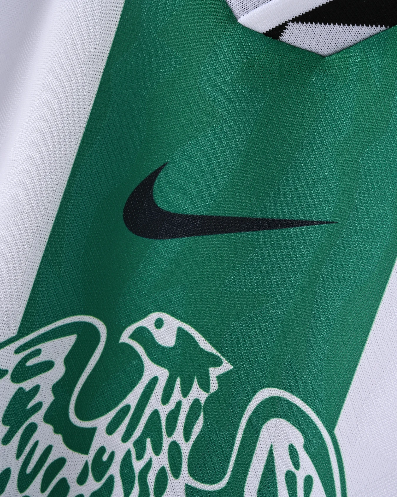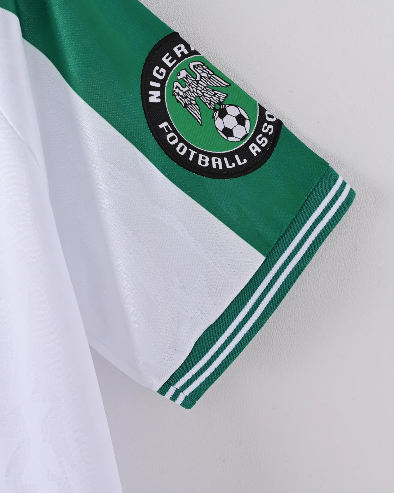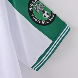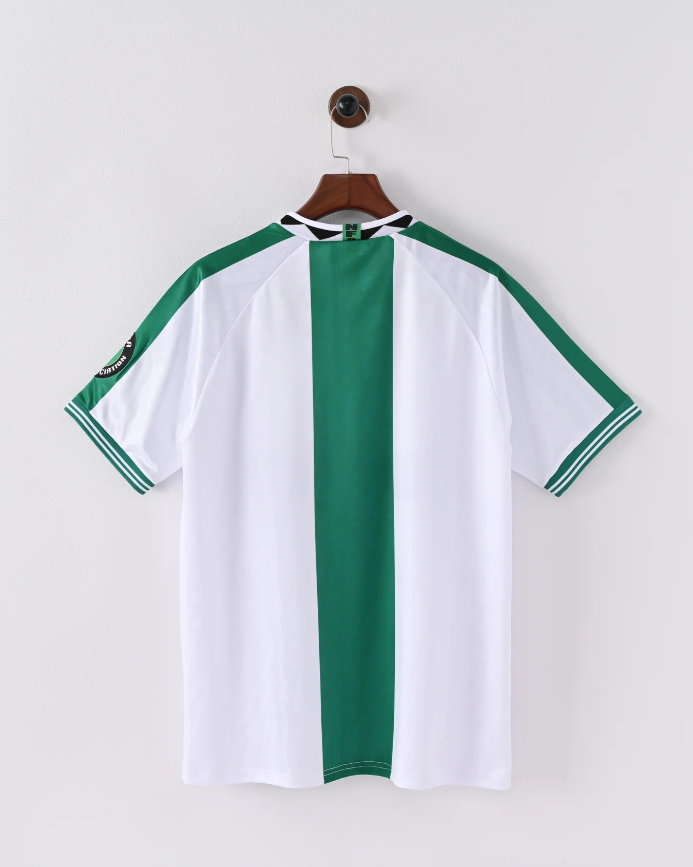 Featuring the striking deep green palette accented with crisp white details, the design channels the dynamic flair and fearless style that defined Nigeria’s football in the ’90s. With premium materials and era-specific craftsmanship, every stitch carries the legacy of legends like Jay-Jay Okocha and Nwankwo Kanu.