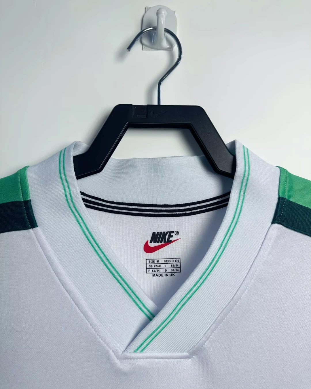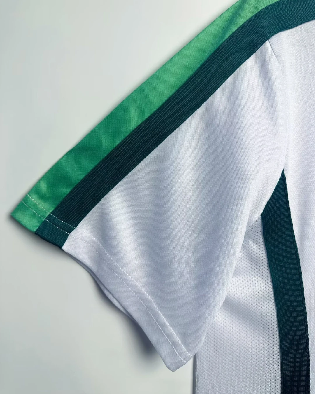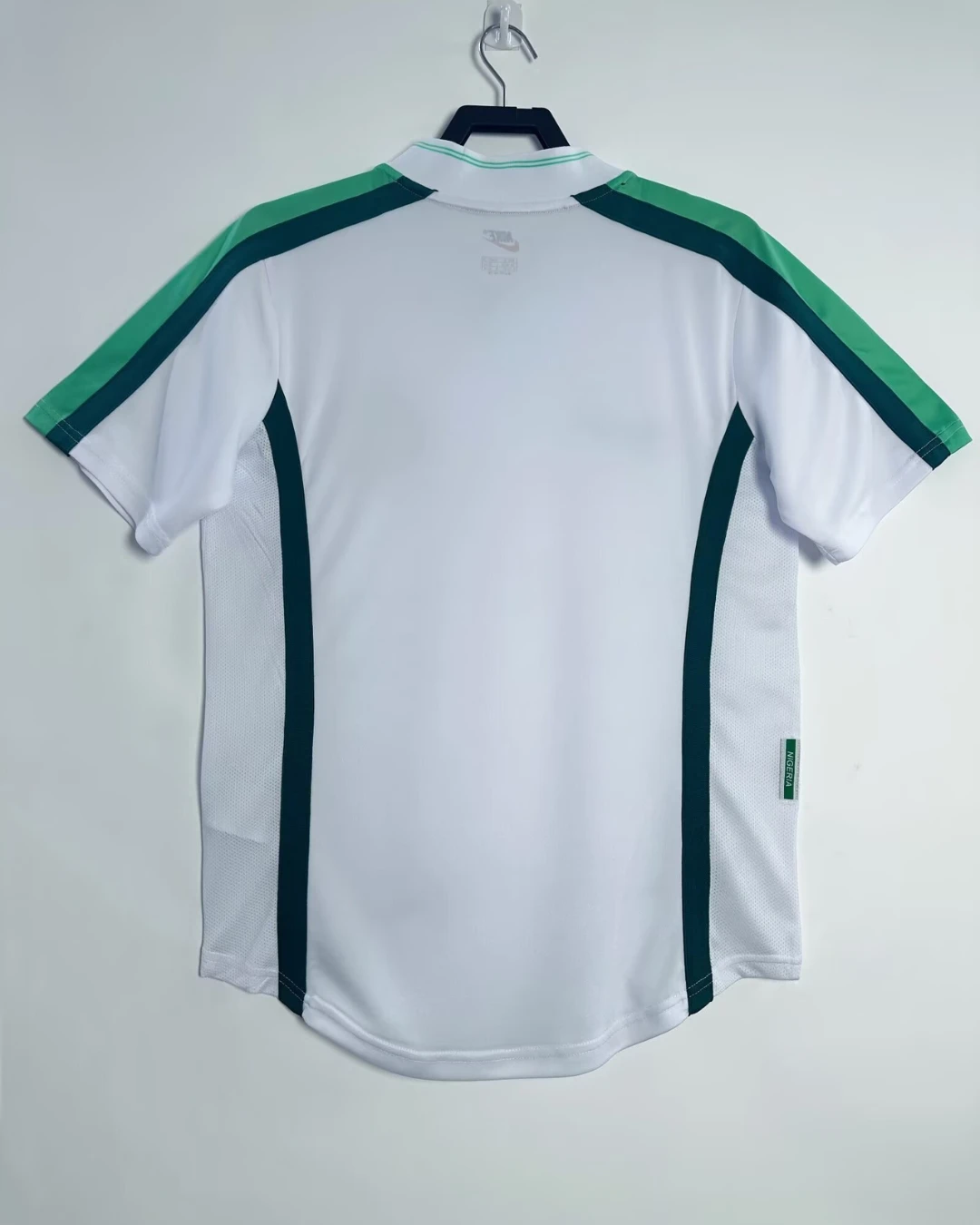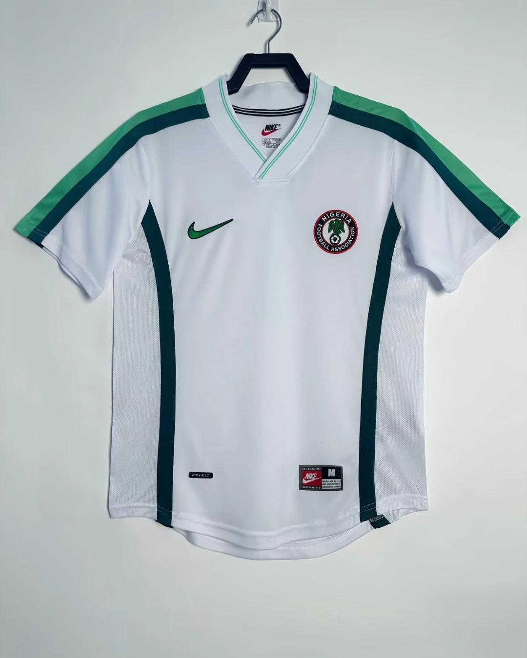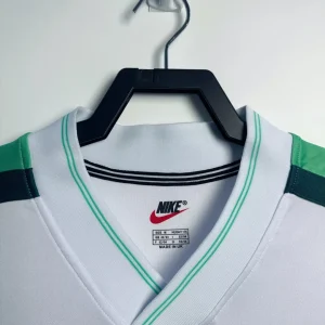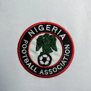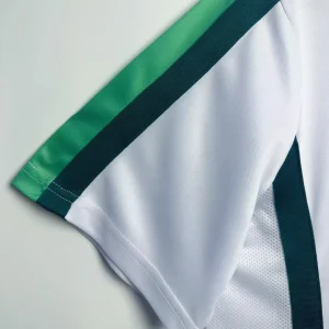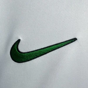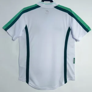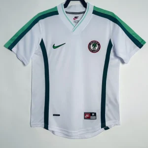 Nigeria’s stylish 1998 World Cup Away Jersey from Nike powered their memorable Round of 16 campaign in France, worn by Super Eagles legends Jay-Jay Okocha, Nwankwo Kanu, Sunday Oliseh, and Rashidi Yekini during group stage triumphs over Spain and Bulgaria. The clean white base with green stripes on the side inspired by the national flag features the Nigerian eagle prominently printed on the chest and classic green Nike Swoosh, iconic 90s design blending African pride with minimalist sophistication.