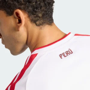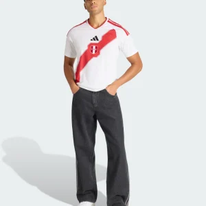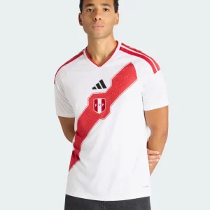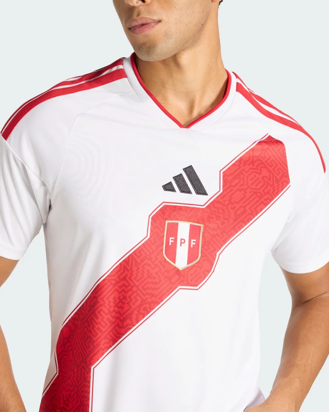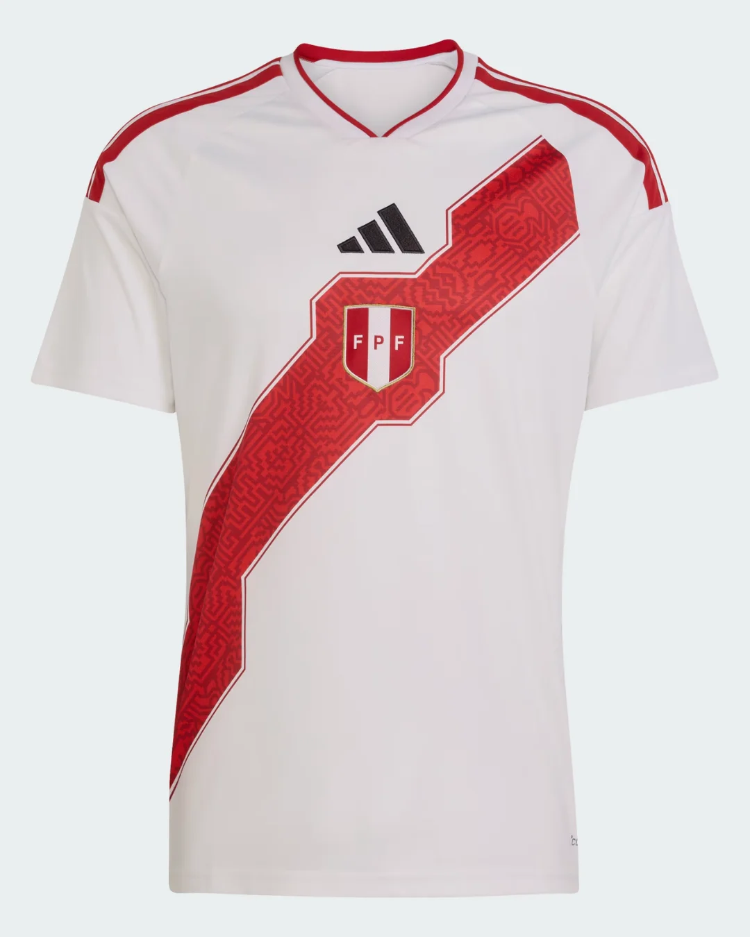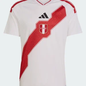 Ignite La Blanquirroja’s World Cup passion with the Peru 2026 WC Home Stadium Jersey from Adidas, celebrating Peru’s diverse landscapes and indigenous heritage. Predominantly crisp white base honoring national tradition, it features a modern twisted red sash design with angular edges symbolizing courage, intricate kene art patterns inspired by Shipibo-Conibo community textiles representing Andes mountains, coastline, highlands, and rainforest, EQT collar, bold 3-Stripes shoulders, embroidered FPF crest, Adidas logo, and lightweight jacquard debuted in South American qualifiers.