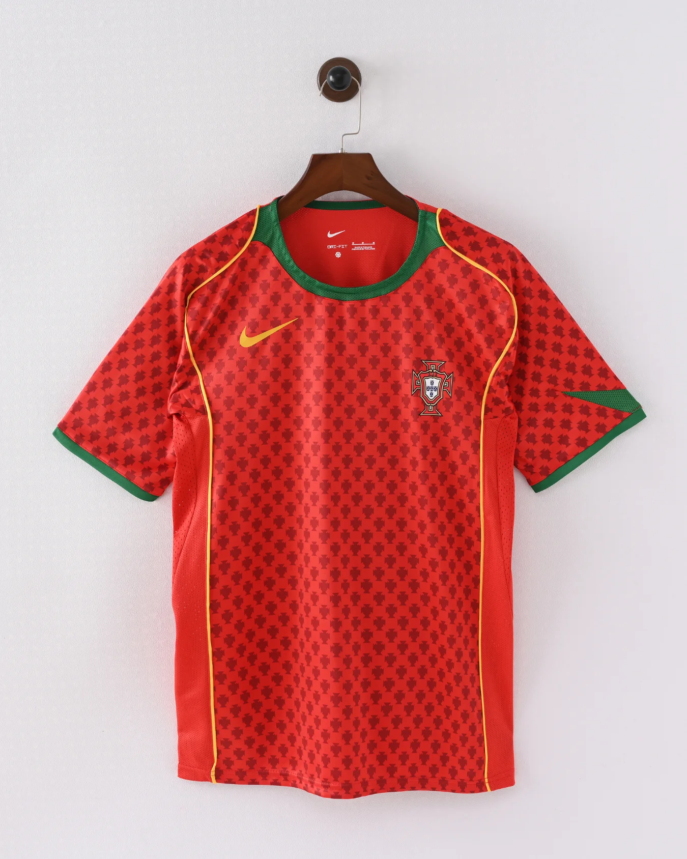 Draped in a deep crimson red with striking gold trim, this jersey is a masterpiece of early-2000s design—bold, elegant, and unmistakably Portuguese. The classic Nike template, combined with rich detailing and premium construction, makes this shirt a timeless celebration of both style and substance.