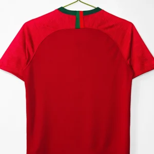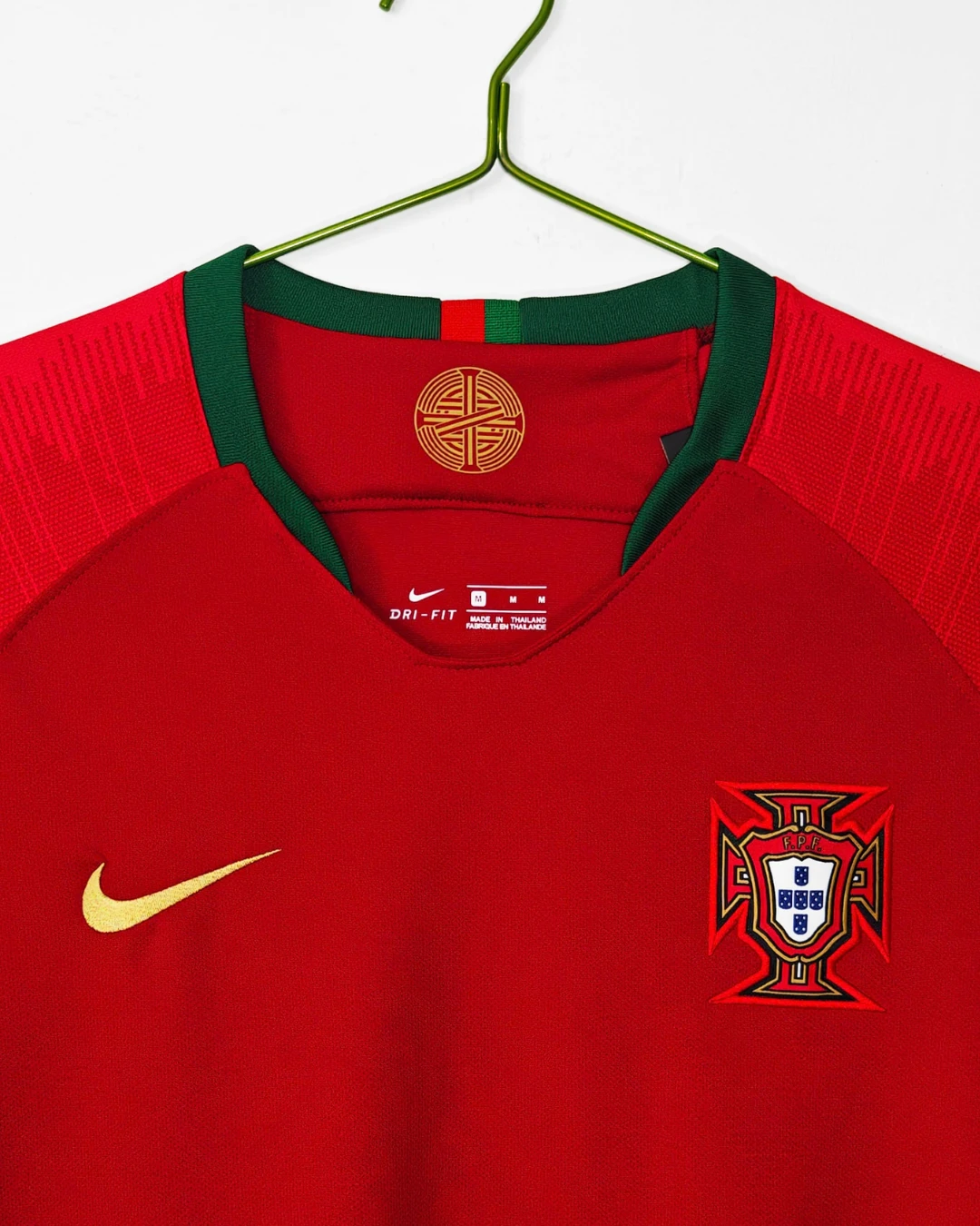 Portugal’s 2018 World Cup Home Jersey from Nike became legendary for Cristiano Ronaldo’s hat-trick in the 3-3 thriller against Spain, featuring a vibrant Gym Red base with gold accents celebrating their Euro 2016 triumph, green collar trim and woven stripes at the neck back inspired by Portugal’s naval history, armillary sphere pride graphic inside collar, Vaporknit technology with engineered mesh for breathability and speed appearance on sleeves, worn during their Round of 16 campaign in Russia. Perfect for young Seleção fans, this retro replica uses 100% polyester Dri-FIT fabric that wicks sweat and dries quickly, embroidered FPF crest on left chest, short sleeves with contoured fit and regular relaxed fit.