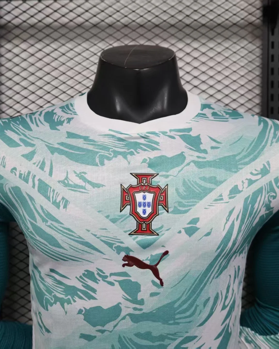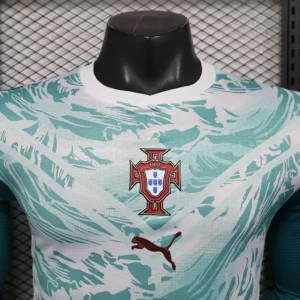 Fuel Portugal’s heroic World Cup charge with the Portugal 2026 Away Authentic Jersey – Long Sleeve from Puma. Predominantly aquamarine with dynamic graphic patterns and V-shaped cuts blending shades of aquamarine and white across the chest and abdomen, it draws from superhero suits and oceanic waves symbolizing “Connecting Heroes” and Portugal’s fearless maritime spirit. Engineered from Puma’s ULTRAWEAVE fabric in 100% recycled polyester, this long-sleeve jersey offers elite breathability, lightweight mobility, and an athletic pro fit for match-level performance. Essential for fans embodying Portugal’s unyielding pride and por amor à camisola passion.