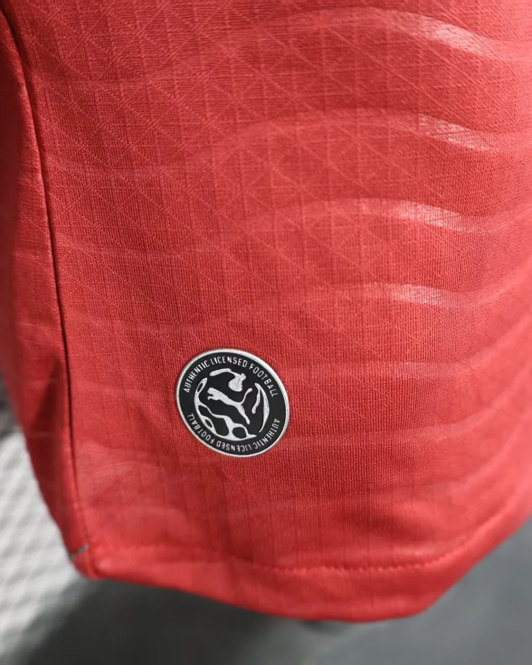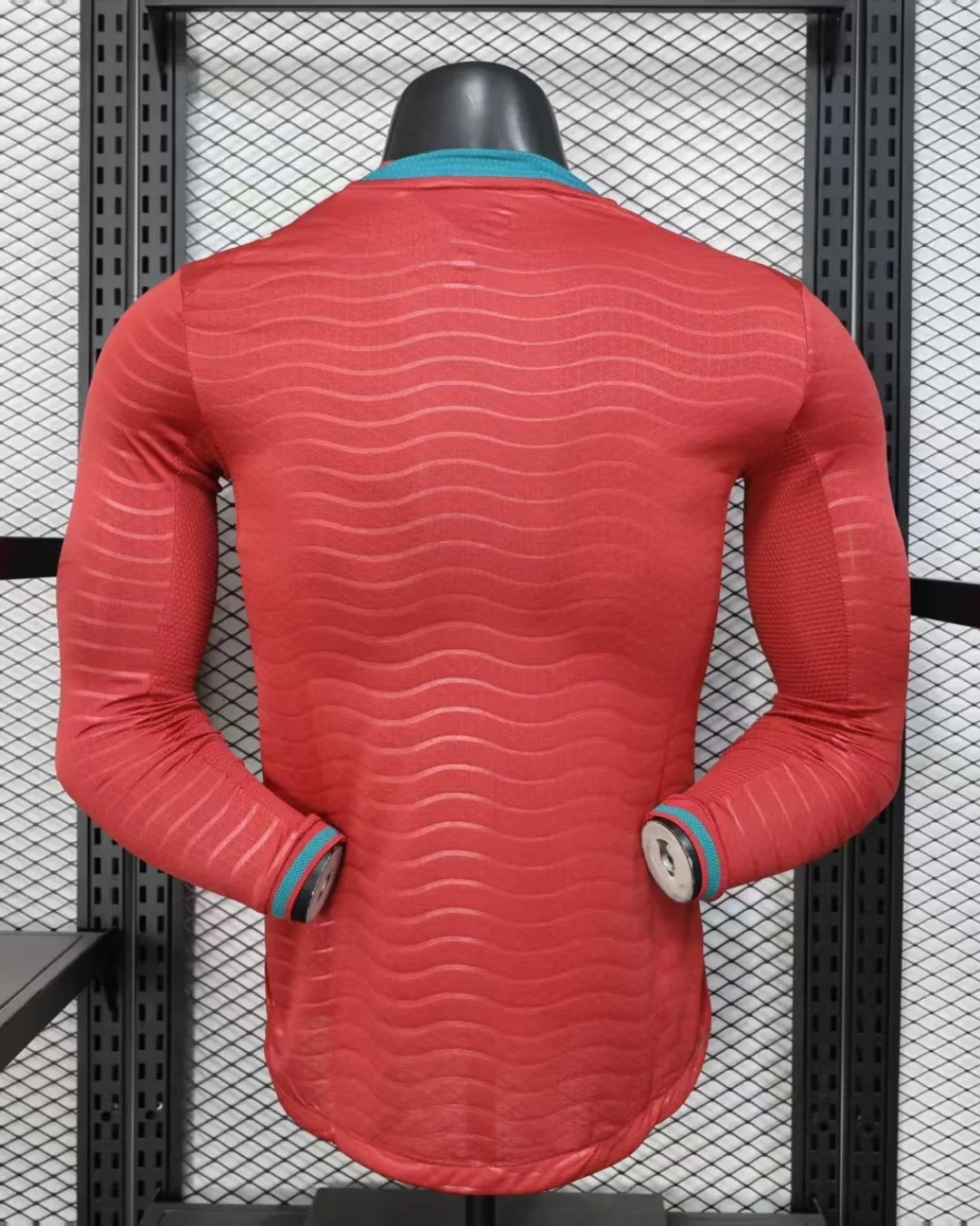 The Puma Portugal 2026 World Cup Home Authentic Long Sleeve Jersey captures the ocean’s energy with a deep club red base layered in subtle wave jacquard patterns and green accents on the V-neck, cuffs, and trim, honoring Portugal’s maritime heritage and dynamic playing style.