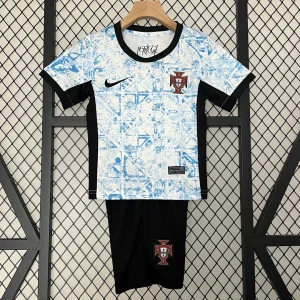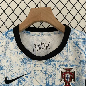 Portugal’s 2024 Away Kids Jersey from Nike draws inspiration from the nation’s iconic Azulejo tiles, featuring a clean Sail (off-white) base enhanced with stylish abstract geometric patterns in University Blue and Pitch Blue accents that evoke traditional Portuguese ceramic artwork, complemented by the embroidered national crest with armillary sphere, worn during EURO 2024 and Nations League campaigns. Perfect for young Seleção supporters, this Stadium replica uses Dri-FIT moisture-wicking technology to stay dry and breathable, lightweight 100% polyester stretch weave for unrestricted movement, crewneck collar with ribbed trim, short sleeves, Nike Swoosh on right chest and regular relaxed kids fit.