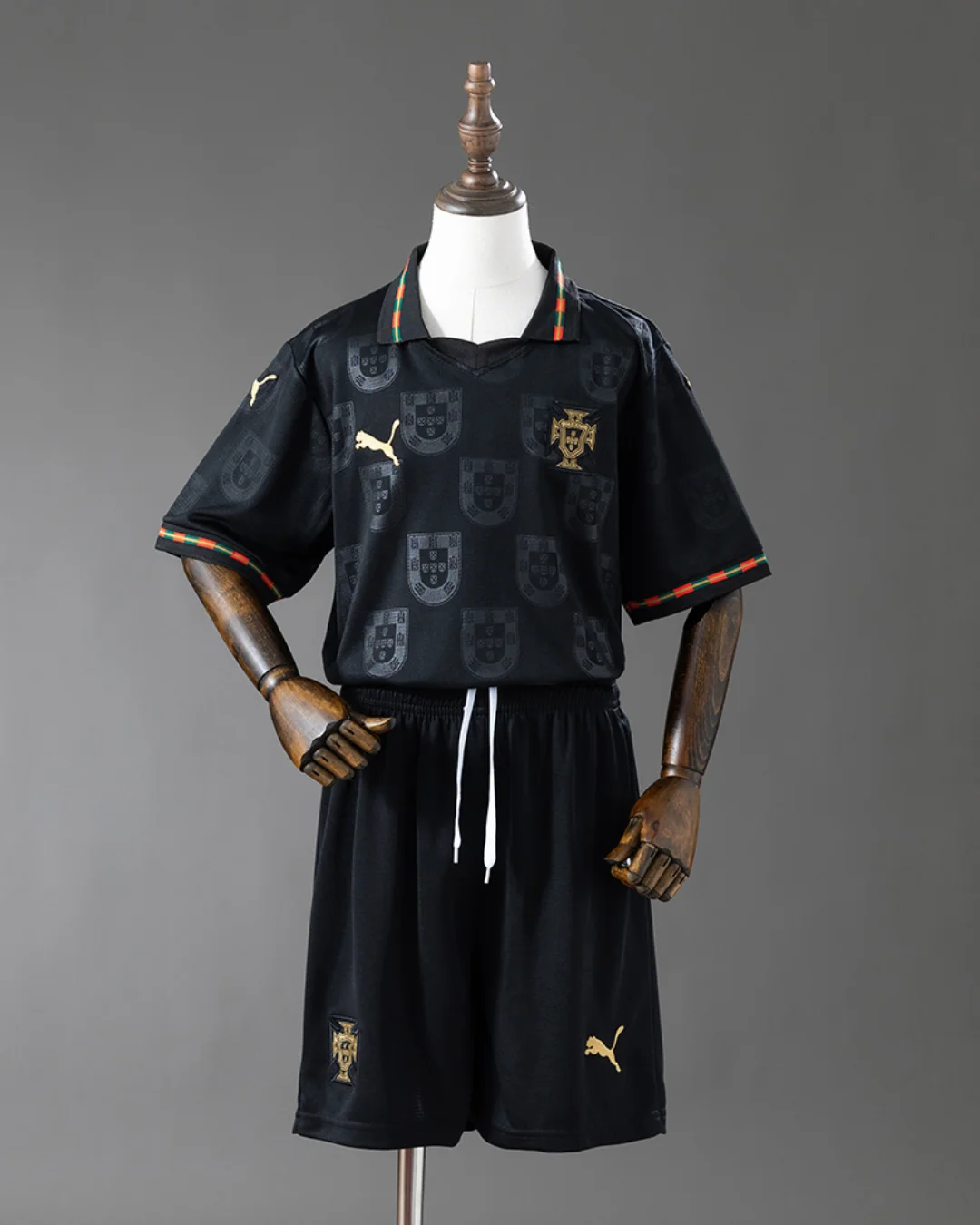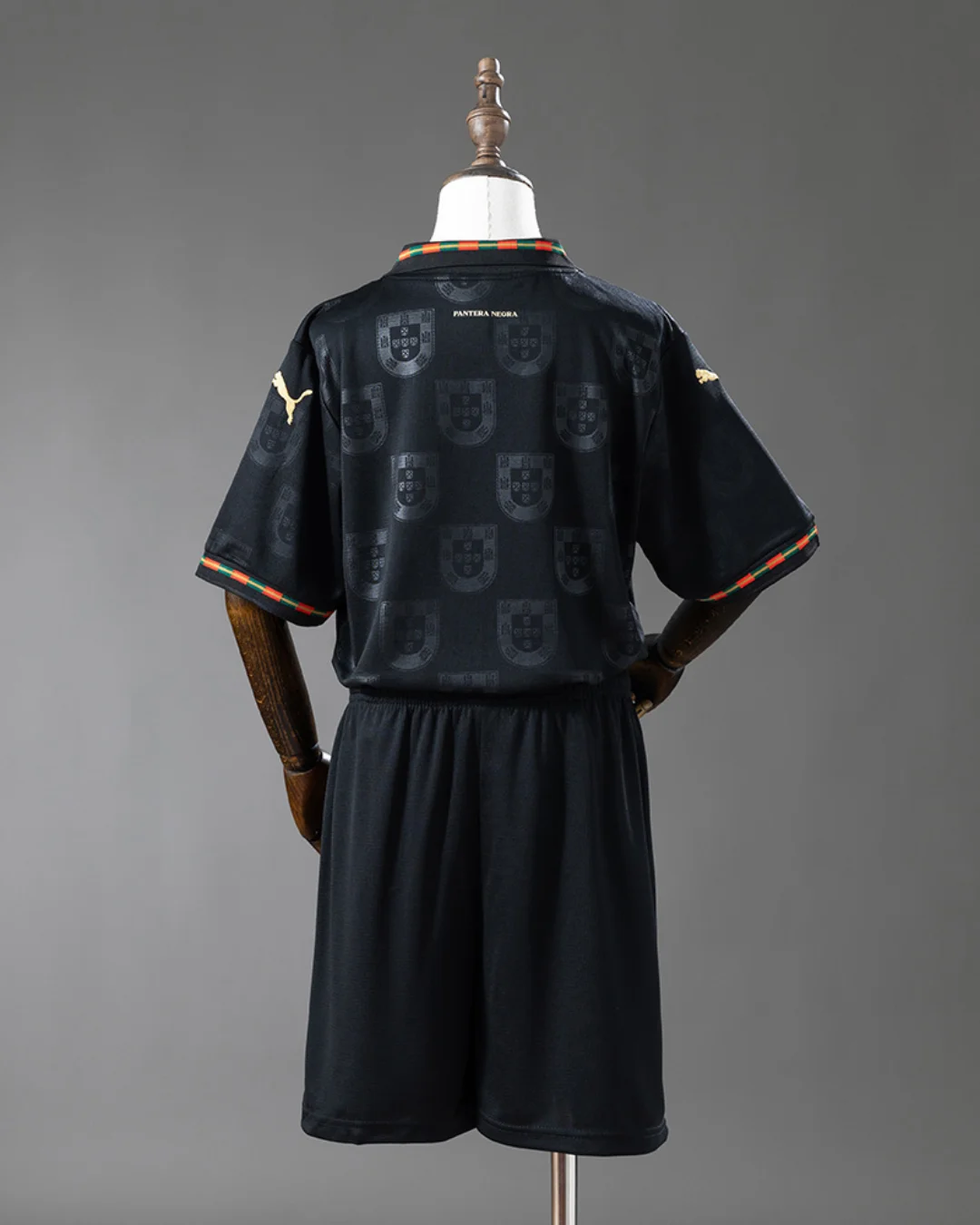 Black base with tonal historic Portuguese crest pattern from Eusébio’s era