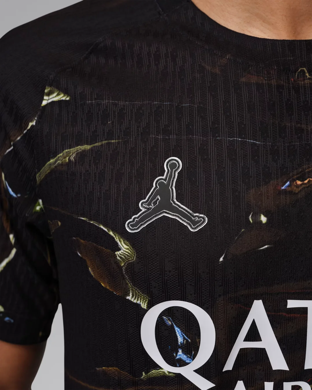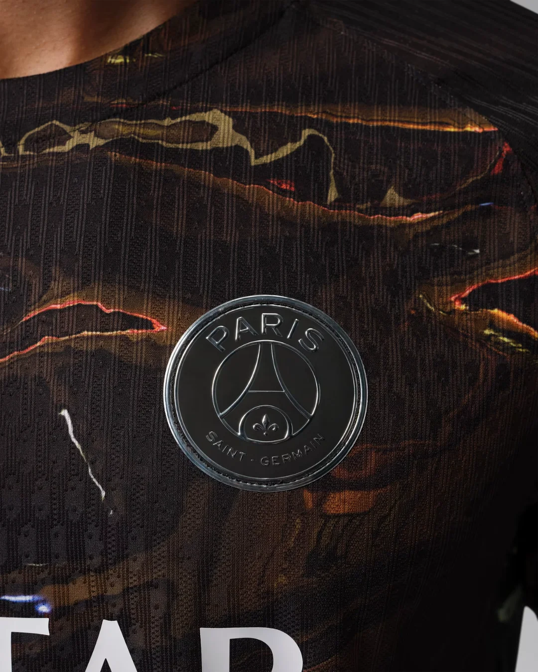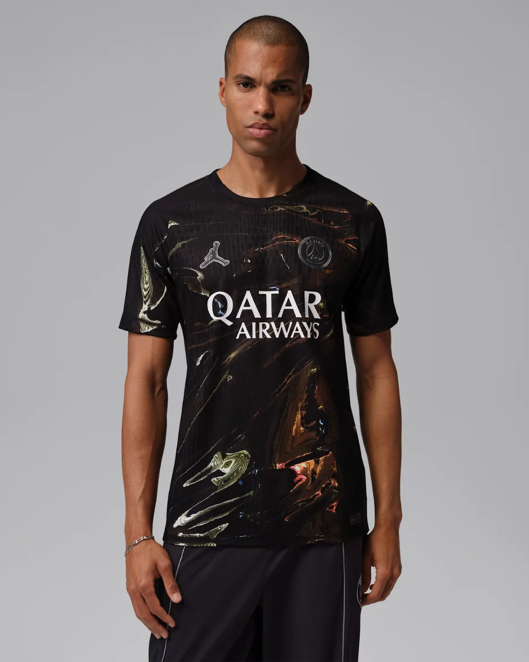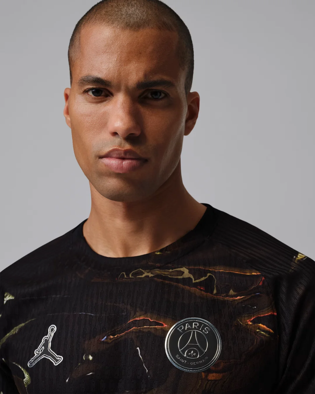 Jumpman logo, PSG crest, and fluid metallic graphics