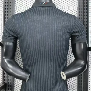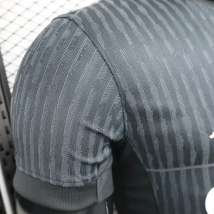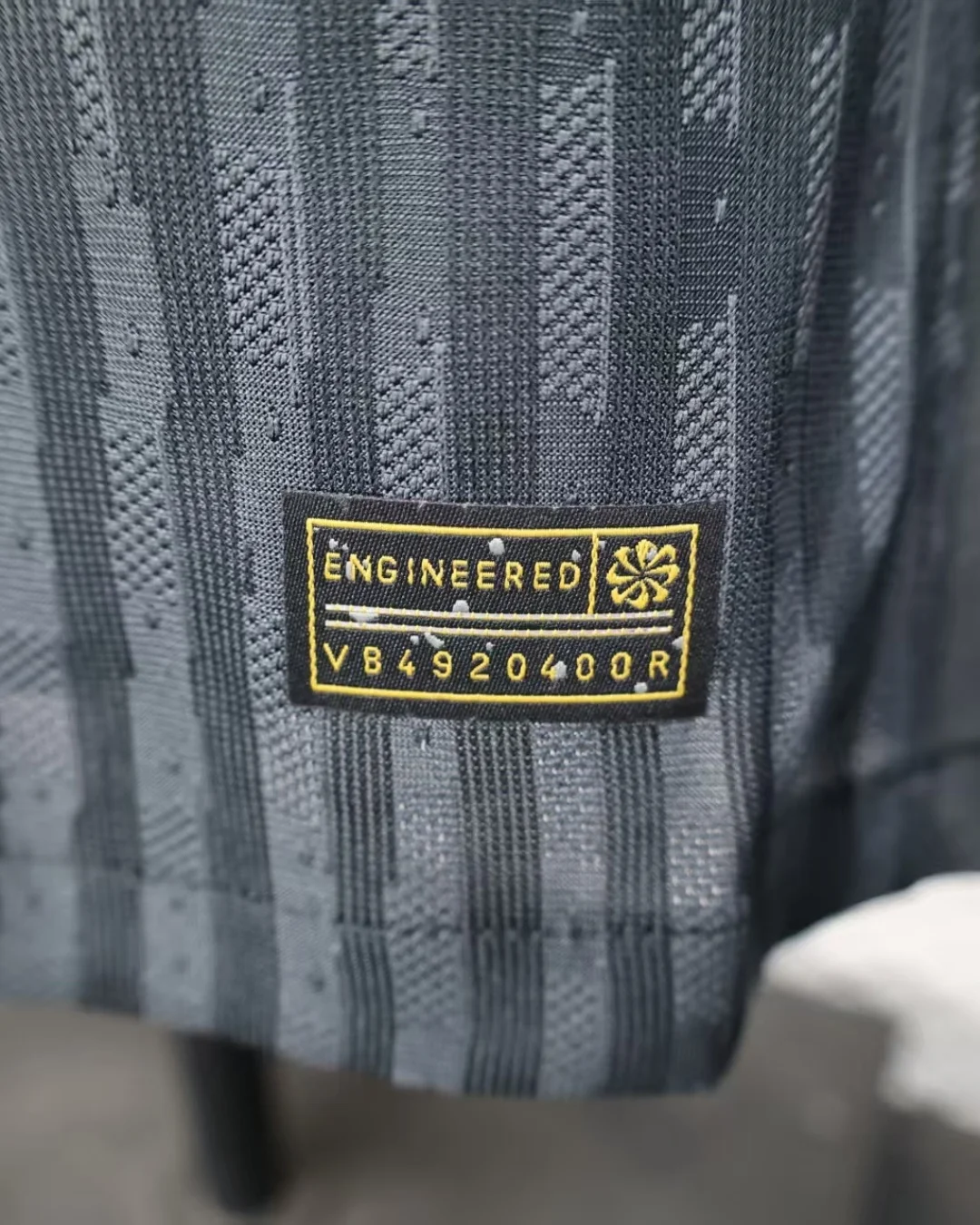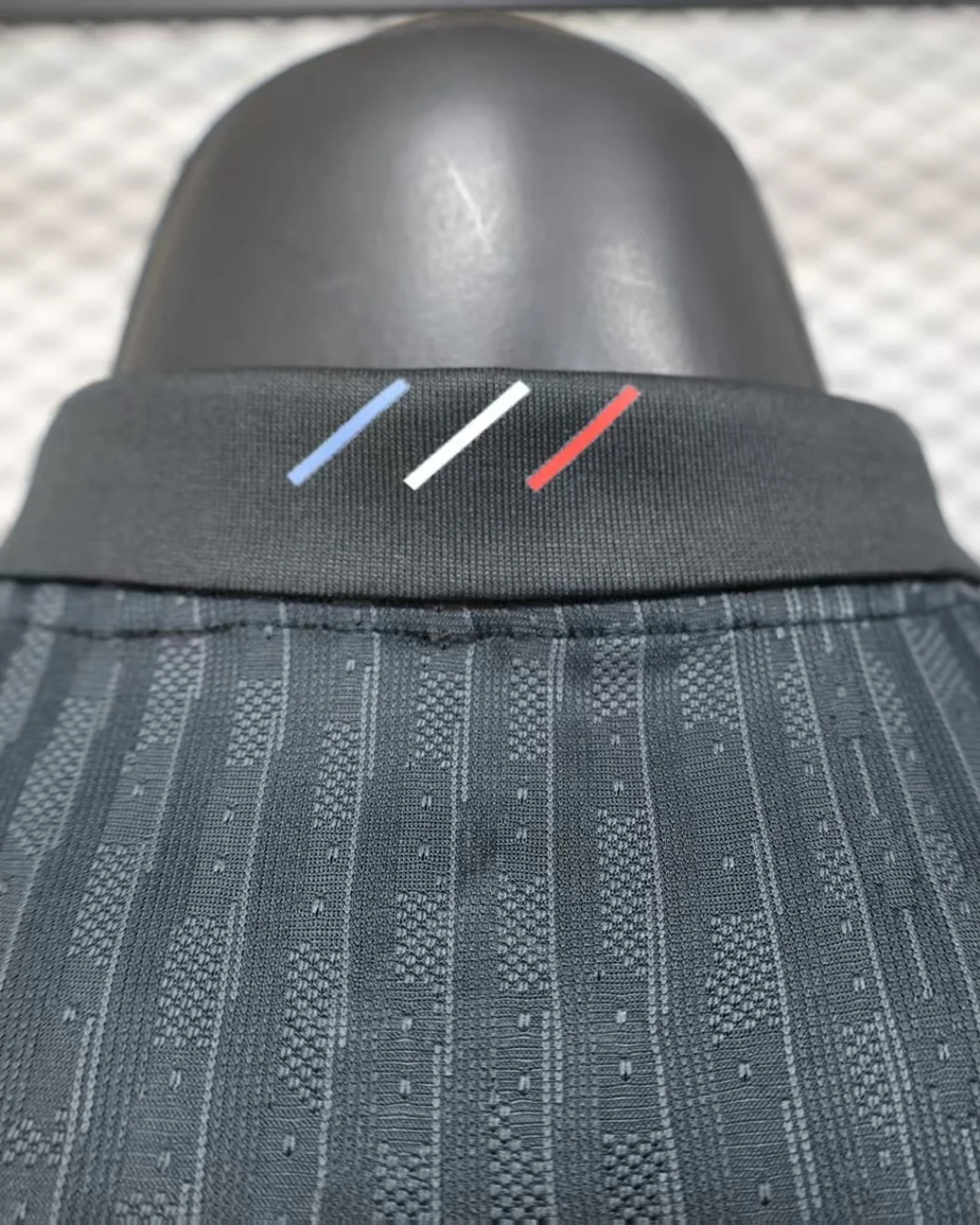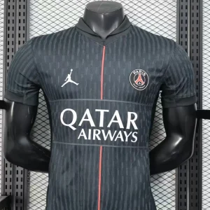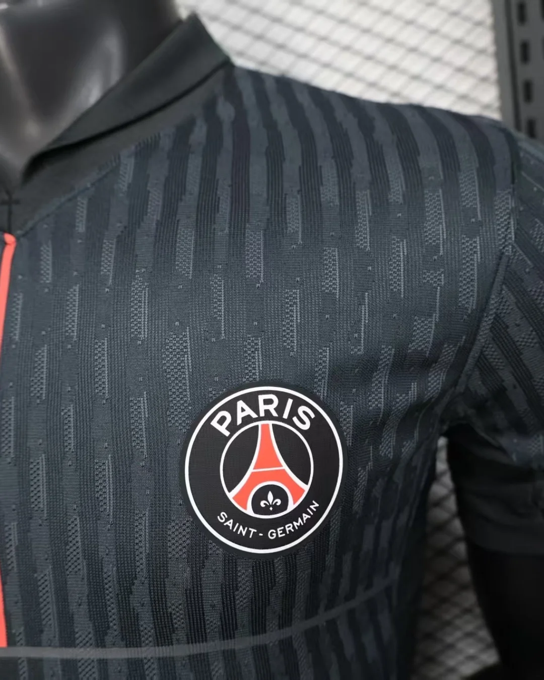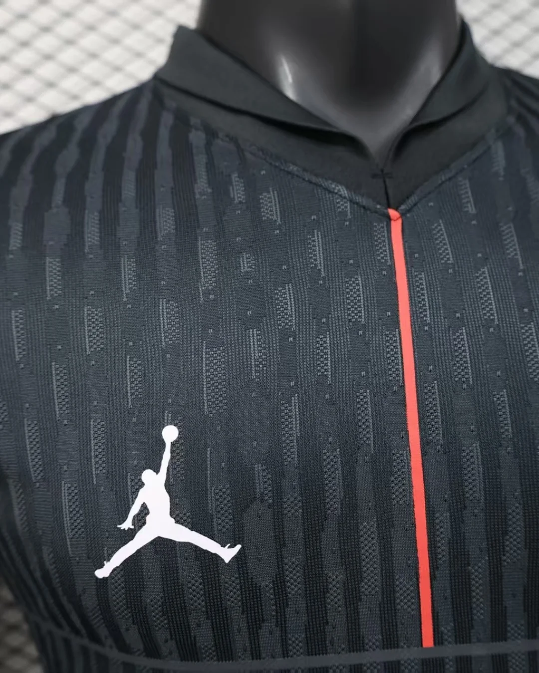 Experience the pinnacle of style and performance with the PSG x Jordan 25/26 Fourth Authentic Jersey, a masterful fusion of Parisian couture elegance and cutting-edge football technology. This jersey features a predominantly dark, almost black base (Off Noir) with undertones of brown and purple that give it a rich, sophisticated hue. Striking silver and subtle pearl pink accents highlight the jersey, including a sleek central vertical line symbolizing precision and couture craftsmanship, a nod to the markings found in Parisian fashion ateliers.