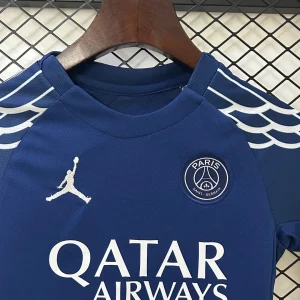 The PSG Kids 24/25 Fourth Kit is an official Paris Saint-Germain jersey designed for young fans featuring a collaboration with the Jordan Brand. The kit stands out with its unique elements inspired by the Jordan Wings logo, blending elegance with technical innovation.