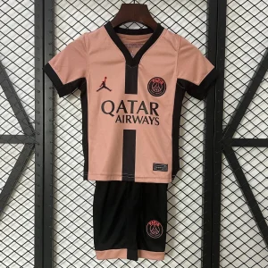 The Jordan x PSG Kids 24/25 Third Kit features a striking pale pink base with a bold black stripe, blending Parisian luxury and sporting audacity to symbolize confidence and club pride for young supporters. This third jersey showcases embroidered PSG crest, Jordan branding, and authentic sponsor details, crafted with breathable, quick-drying fabric for comfort during play.