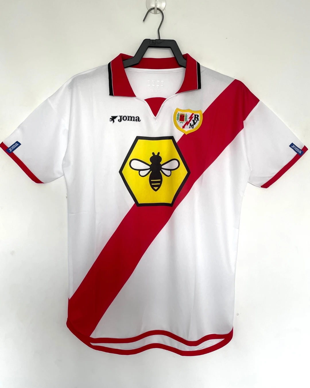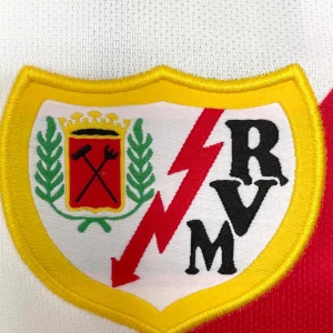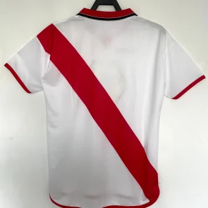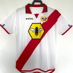 Rayo Vallecano’s memorable 2001/02 Home Jersey powered their remarkable La Liga survival campaign under coach Gregorio Manzano, finishing 11th after a dramatic late-season surge that defied relegation predictions, worn by club legend Iván Helguera, Quique Esteva, Bolic, and Michel before their eventual top-flight return struggles. The iconic white base featuring bold red sash across the chest showcases crew neck collar, embroidered Rayo Vallecano crest on left chest, prominent bumblebee Rayo sponsor prominently displayed, and Joma logo opposite, distinctive Franja Roja design embodying Madrid’s working-class passion during their third consecutive La Liga season.