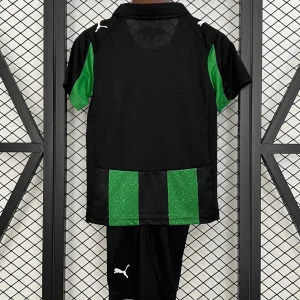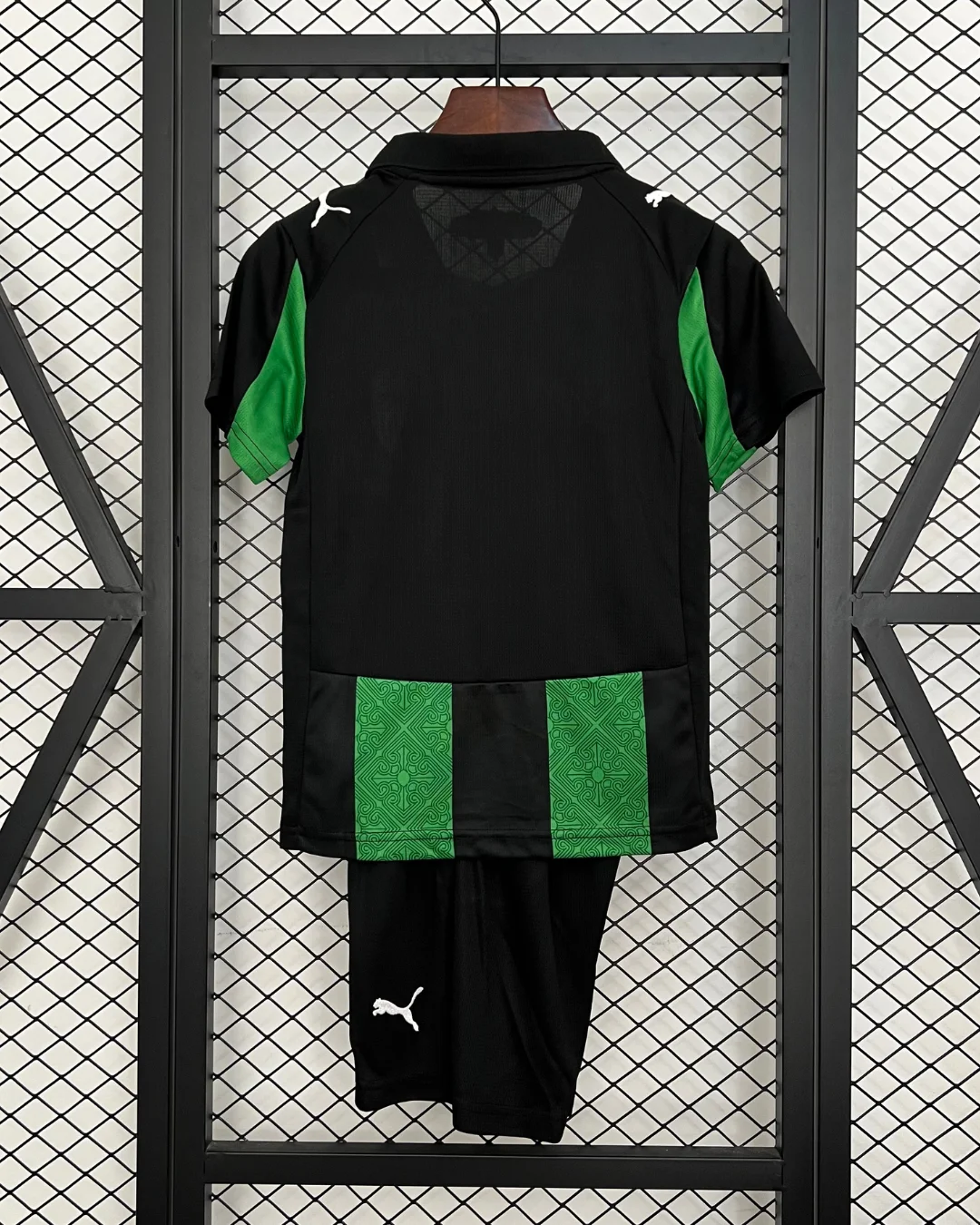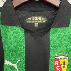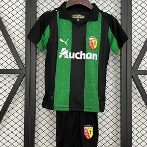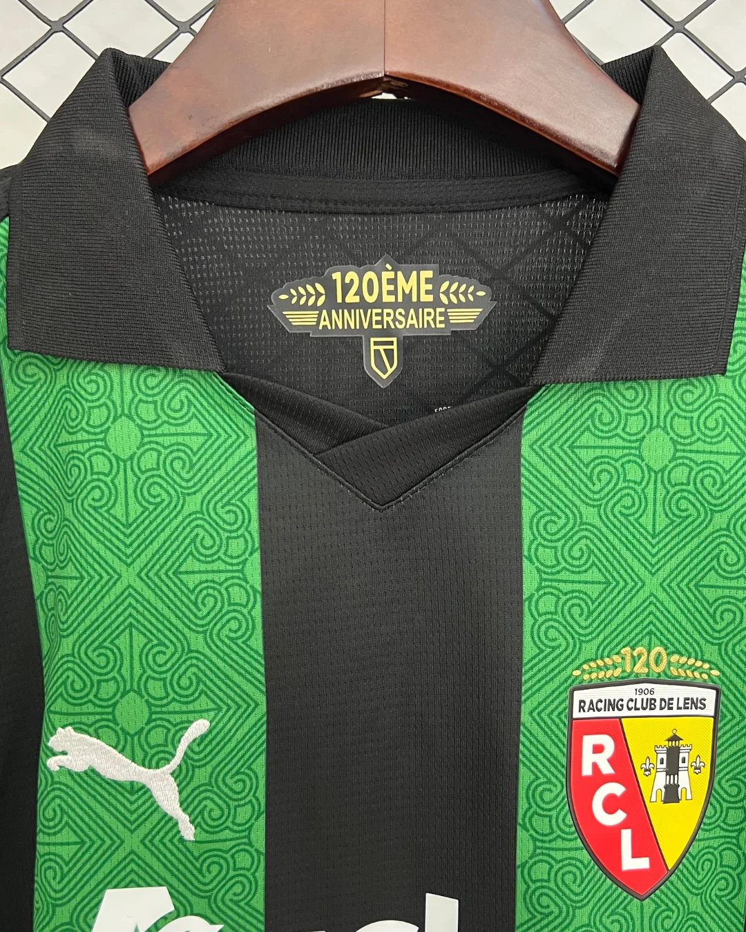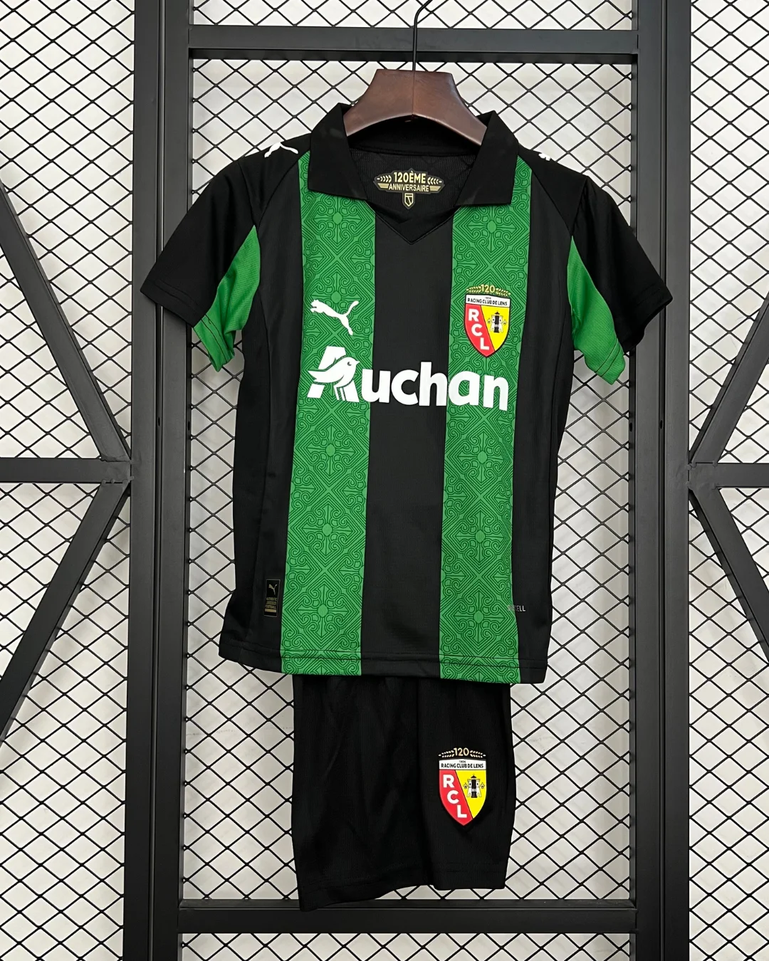 Celebrate RC Lens’ 120th anniversary with the Puma RC Lens Kids 25/26 Away Kit, Puma’s final collection for the club before Adidas takes over, designed for young fans with authentic style and performance. This kit features a sleek black base accented by bold green stripes containing geometric patterns inspired by the historic kiosk on Place Verte (now Place de la République), honoring Lens’ architectural heritage. White logos provide crisp contrast, complemented by a prominent large collar for a distinctive, modern silhouette.