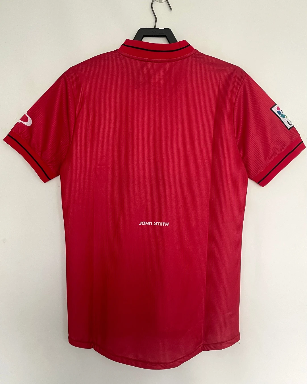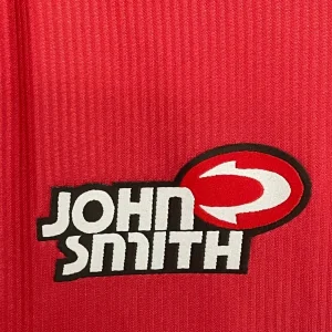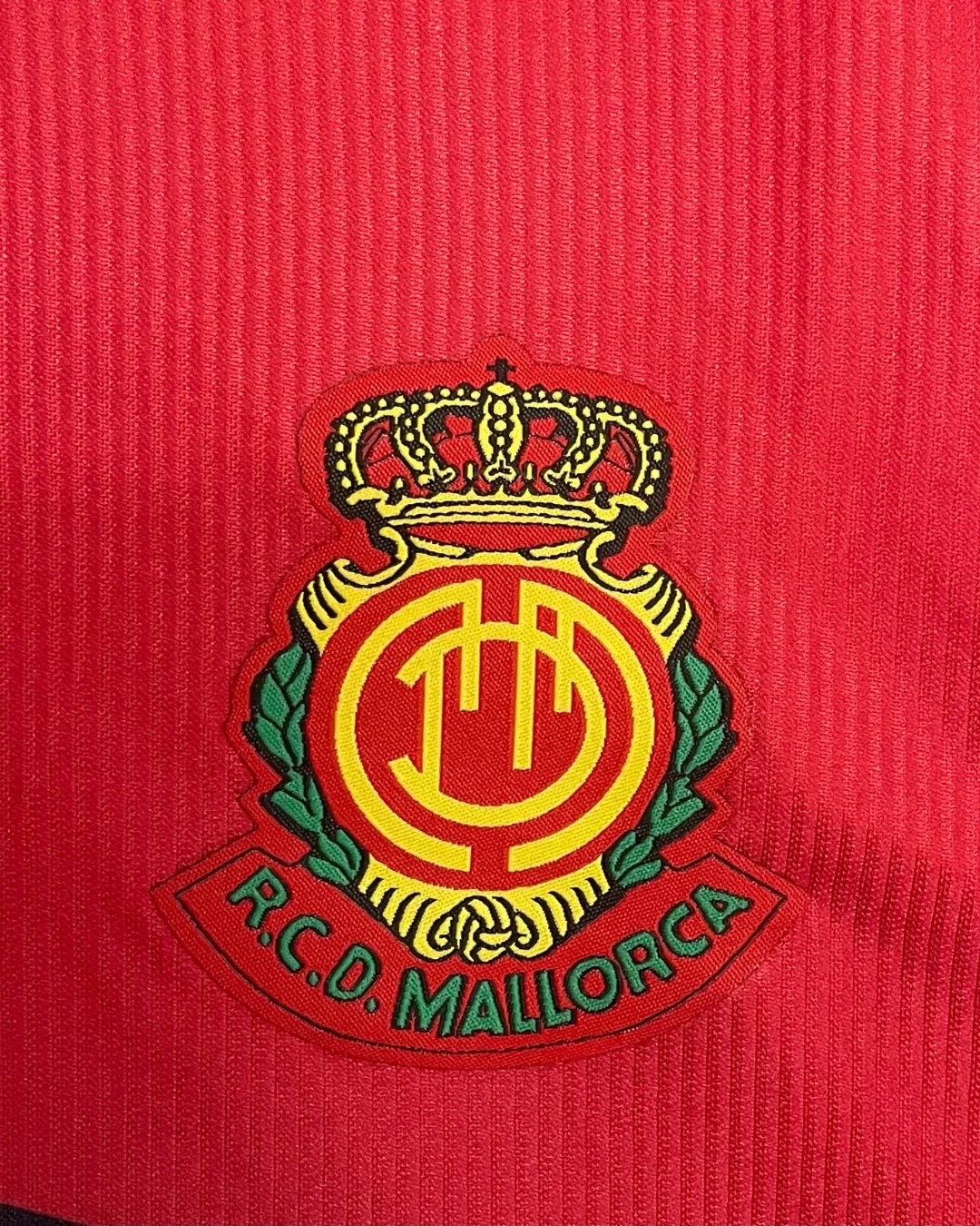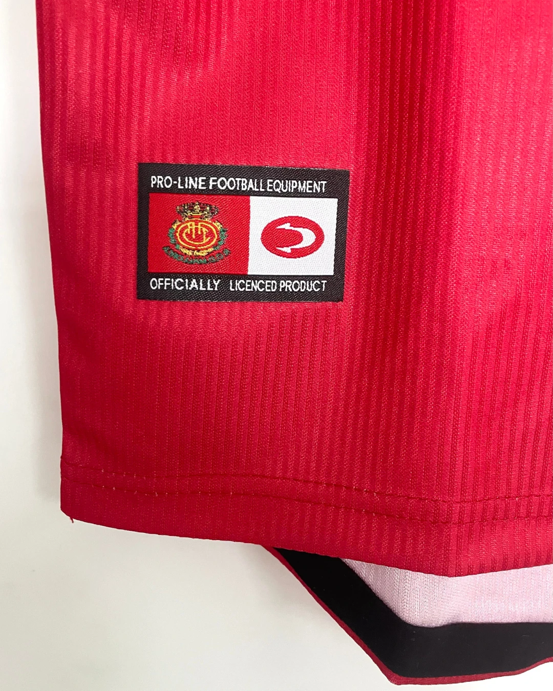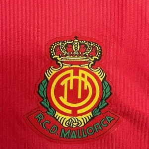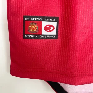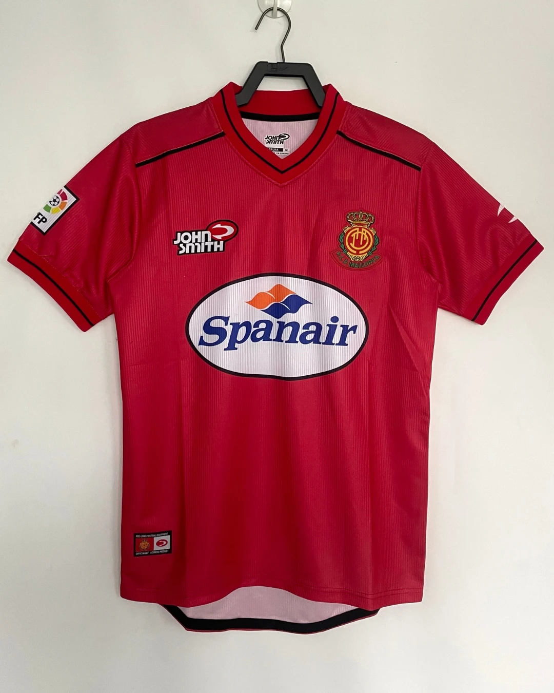 RCD Mallorca’s 2000/01 Home Jersey from John Smith powered their remarkable third-place La Liga finish at Son Moix Stadium, worn by breakout stars Samuel Eto’o, Albert Luque, Ariel Ibagaza, Finidi George, and Paco Soler during their unforgettable Champions League qualification campaign. The classic red and tonal pinstriped base features the embroidered diablo (devil) crest on the left chest, John Smith logo opposite, distinctive V-neck collar with black piping, and prominent “Spanair” sponsor across the front, quintessential Balearic elegance marking their golden era.