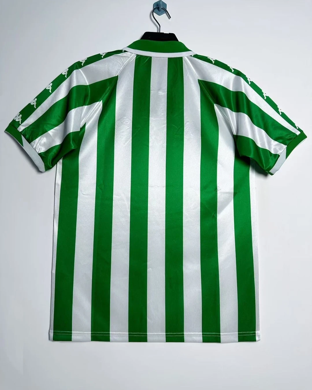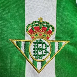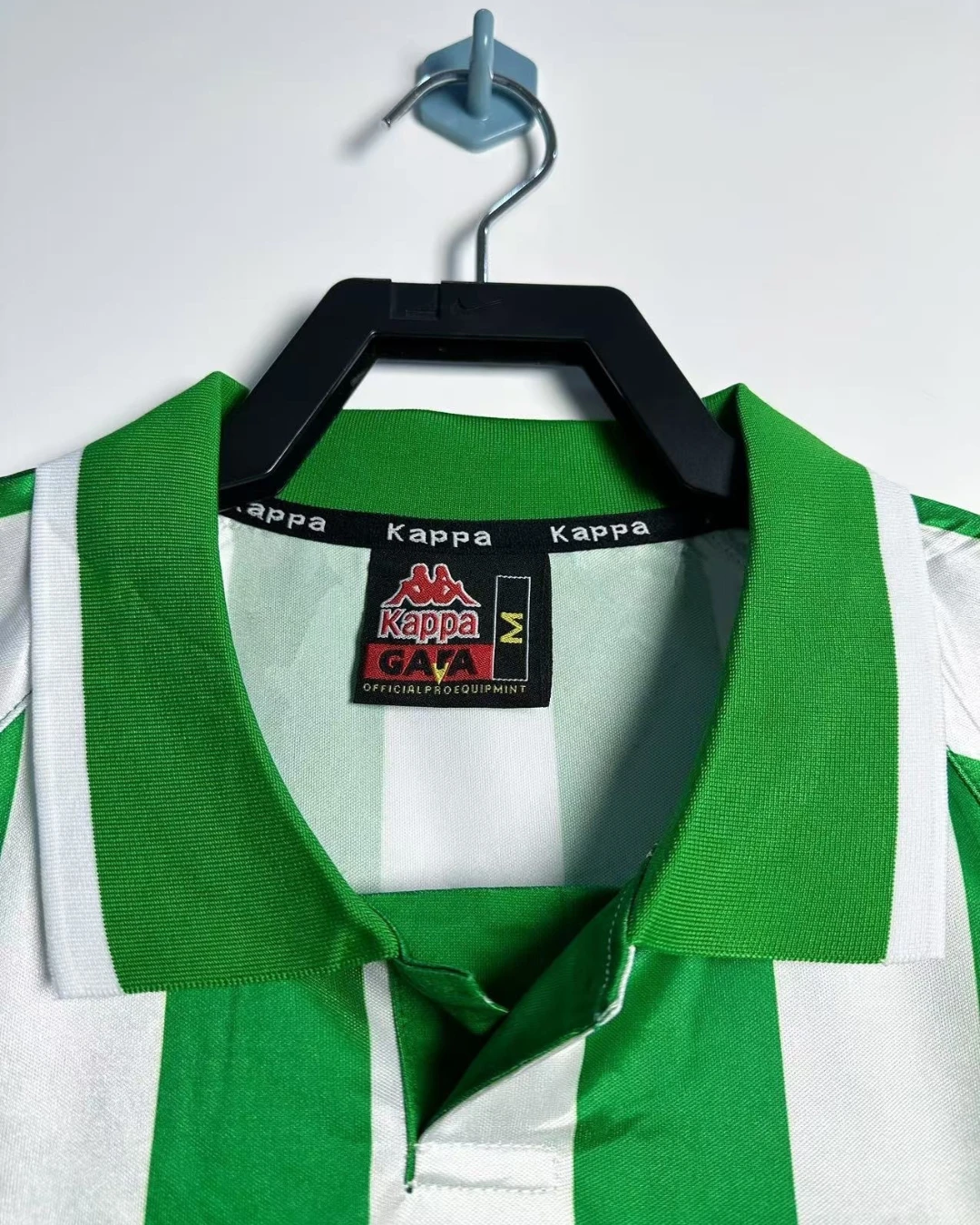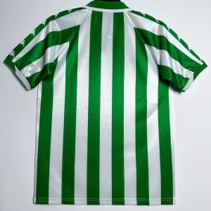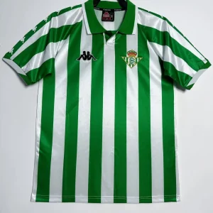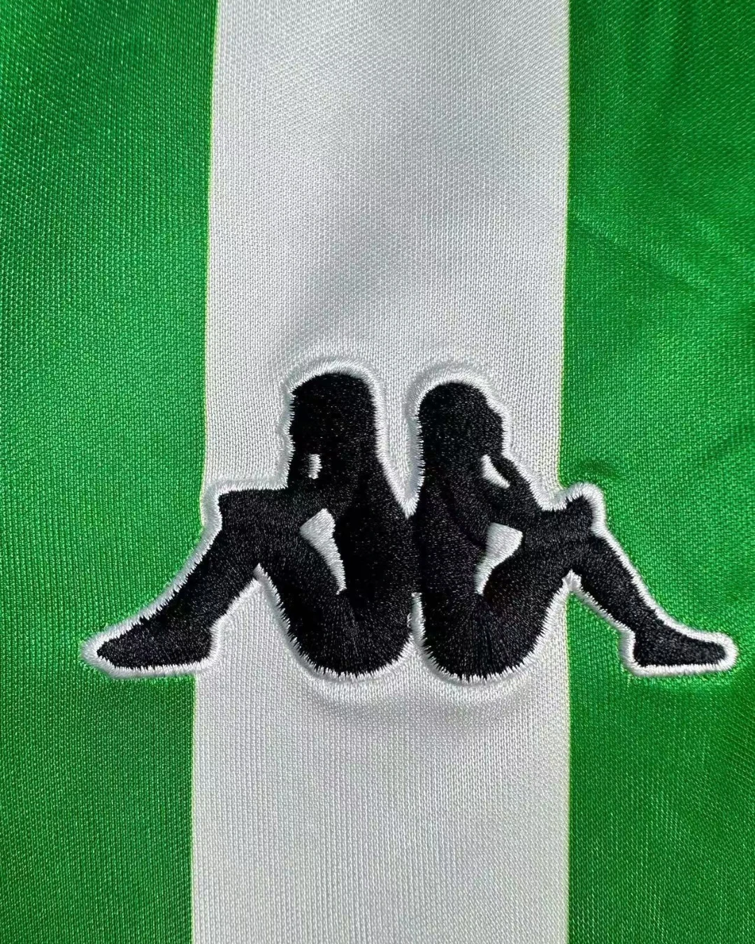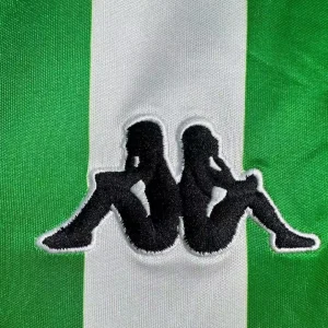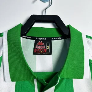 Real Betis Balompié’s classic 2000/02 Home Jersey from Kappa powered their passionate La Liga campaigns at the Estadio Benito Villamarín, worn by Sevilla derby heroes like Joaquín, Demba Savaré, and Finidi during competitive mid-table battles under coaches like Luis Oliver. The iconic green and white vertical stripes feature a distinctive polo collar with button placket, Kappa’s stylish logo on the right chest and embroidered Bético crest opposite, quintessential Andalusian design celebrating the club’s fervent thirteen stripes tradition.