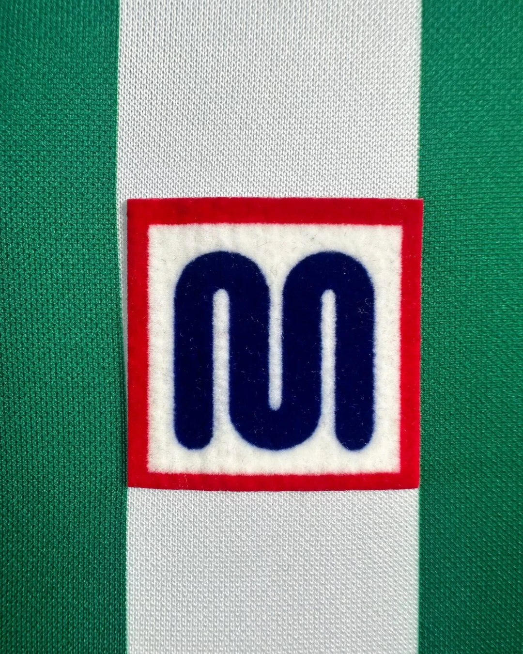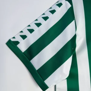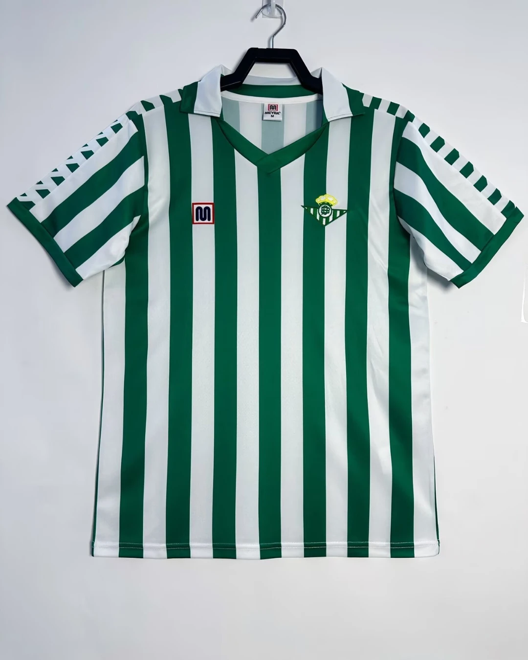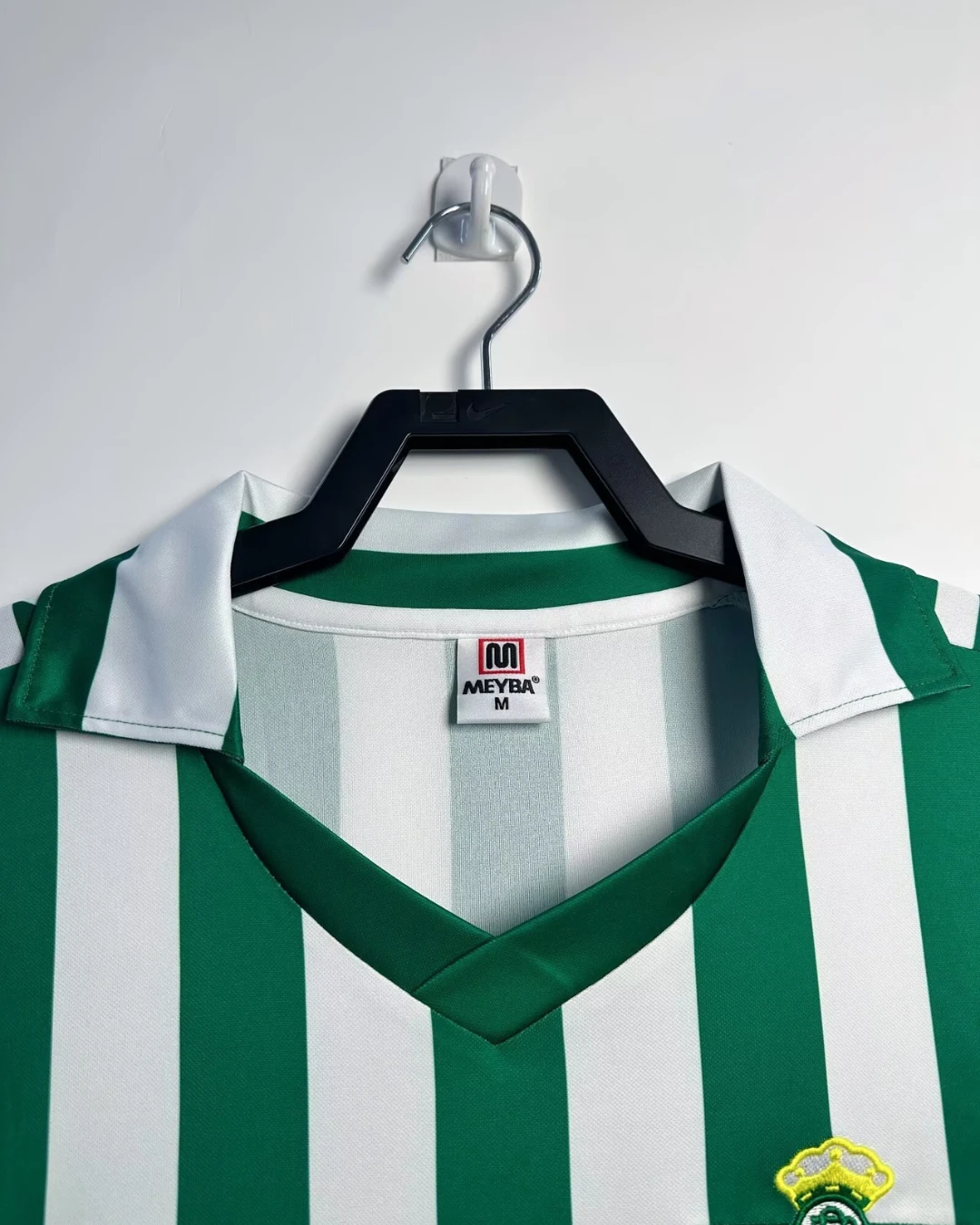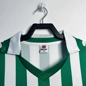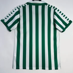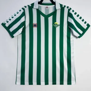 Real Betis Balompié’s classic 1982/85 Home Jersey embodies their passionate La Liga campaigns at the Estadio Benito Villamarín during a transformative era for the Verdiblancos, featuring the traditional green and white vertical stripes that define Andalusian football heritage. This iconic design showcases the embroidered Bético crest on the left chest, simple V-neck collar typical of early 1980s construction, and clean sponsor-free purity across the chest, quintessential pattern celebrating Seville’s thirteen-stripe tradition before heavy commercialization.