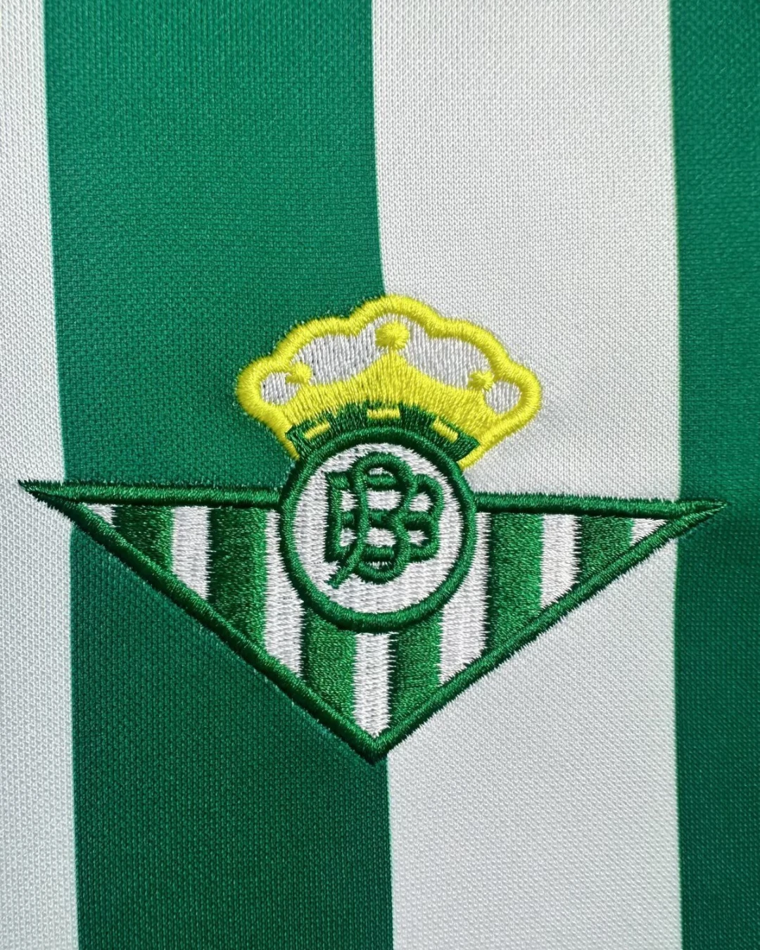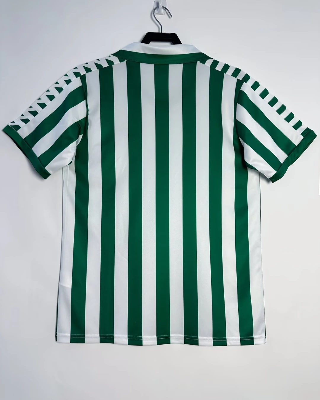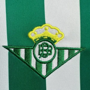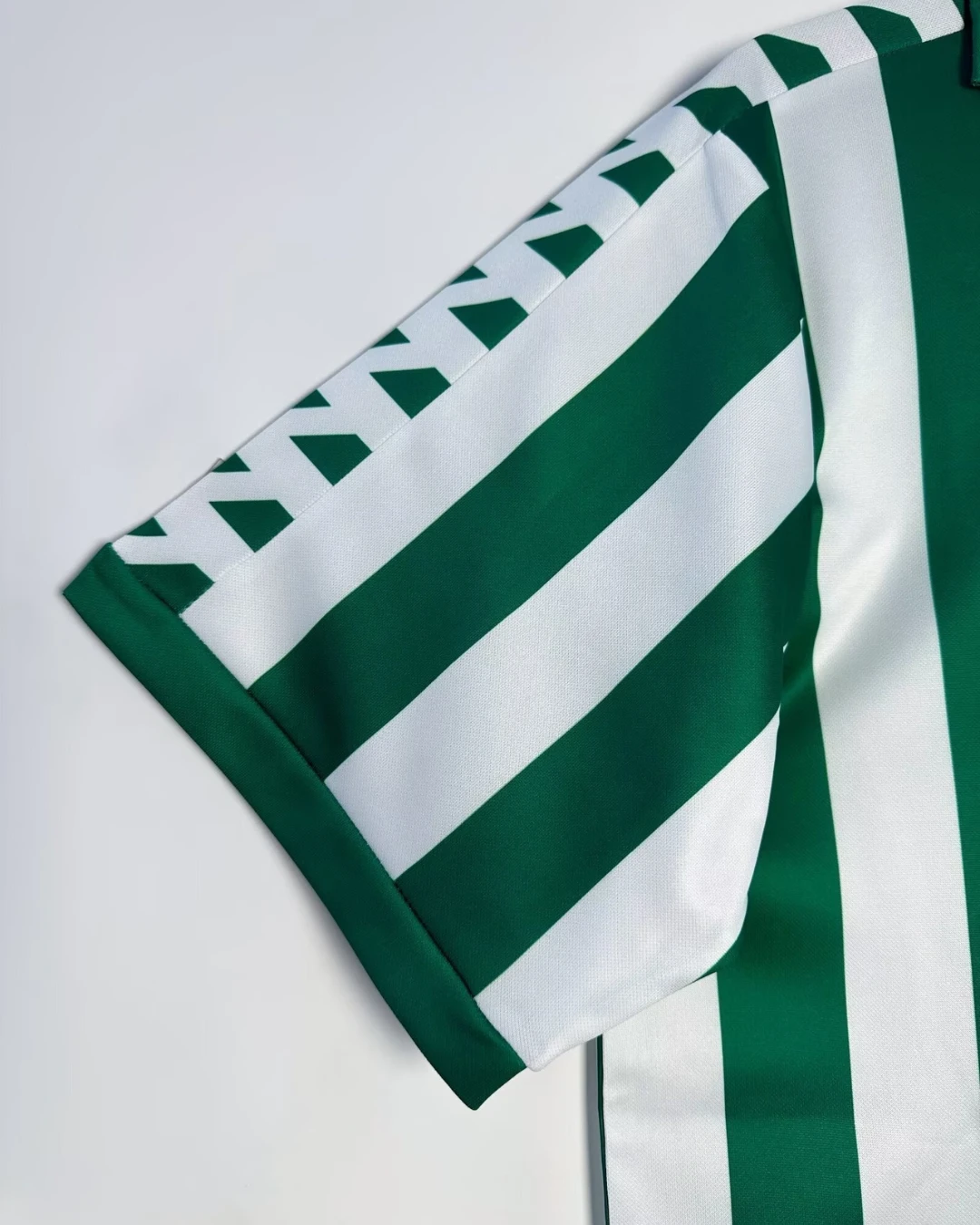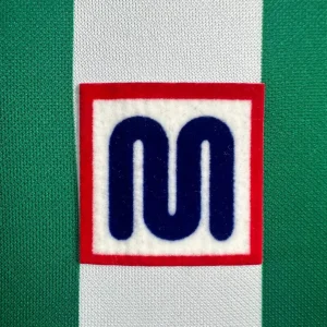 Real Betis Balompié’s classic 1982/85 Home Jersey embodies their passionate La Liga campaigns at the Estadio Benito Villamarín during a transformative era for the Verdiblancos, featuring the traditional green and white vertical stripes that define Andalusian football heritage. This iconic design showcases the embroidered Bético crest on the left chest, simple V-neck collar typical of early 1980s construction, and clean sponsor-free purity across the chest, quintessential pattern celebrating Seville’s thirteen-stripe tradition before heavy commercialization.