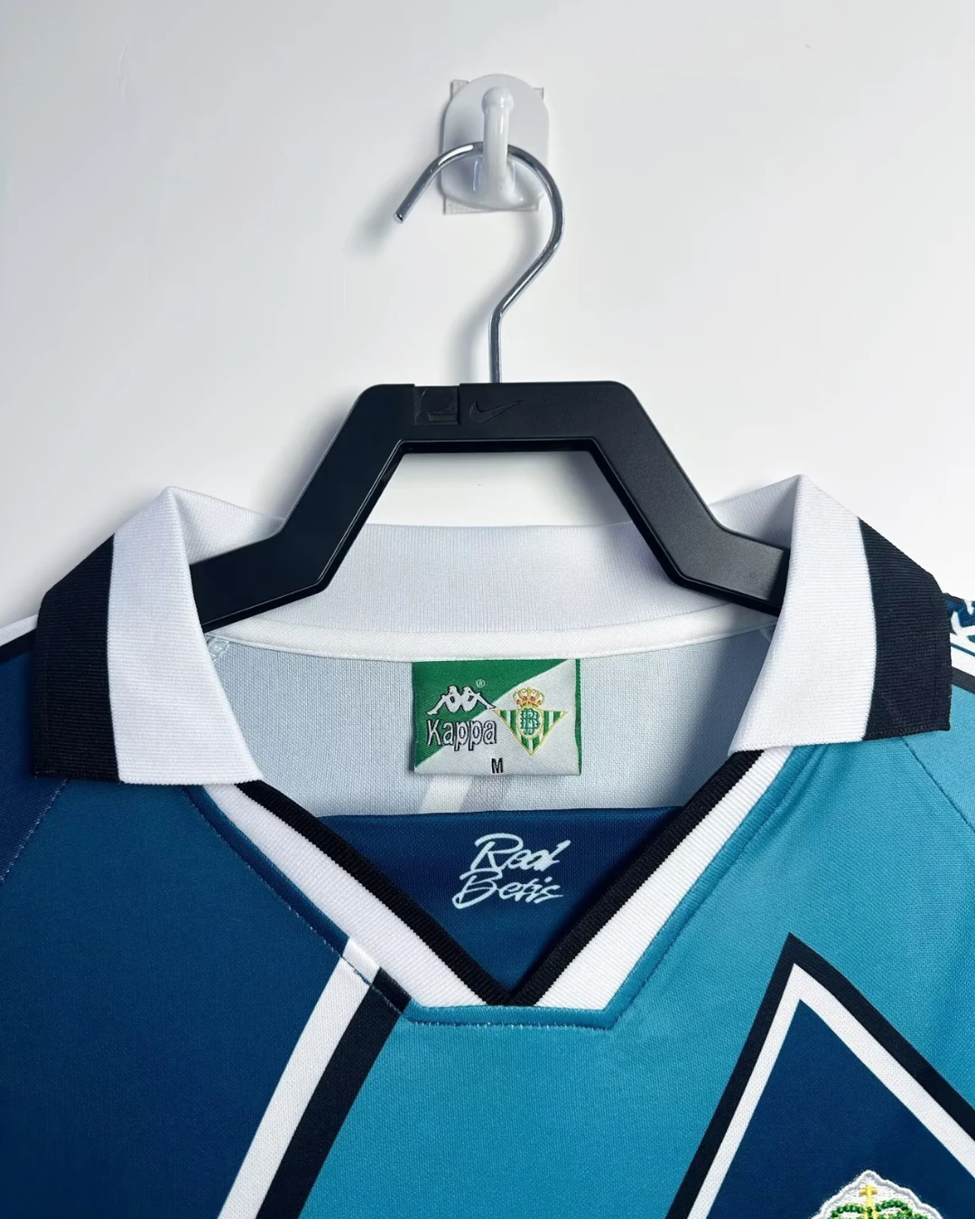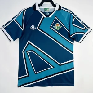 Real Betis Balompié’s striking 1995/96 Away Jersey from Kappa powered their passionate La Liga campaigns during gritty mid-90s battles at the Estadio Benito Villamarín, worn by stars Alfonso Pérez, Finidi George, and Alexis Trujillo. The bold blue-turquoise base features innovative geometric black and white line patterns across the chest, black and white V-neck collar for sophisticated contrast, embroidered Bético crest on left chest, Kappa logo opposite, and prominent sponsor detailing, avant-garde design breaking from traditional stripes to deliver 90s cutting-edge style.