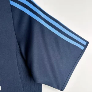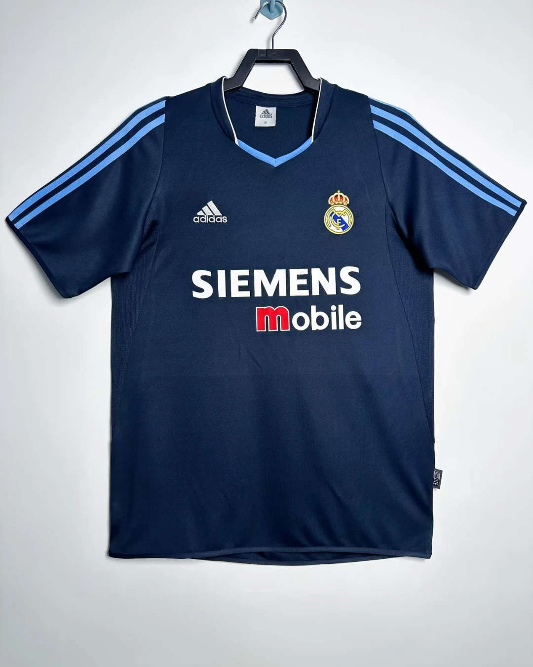 Real Madrid’s 2003/04 Away Jersey from Adidas marked David Beckham’s debut season under Carlos Queiroz at the Santiago Bernabéu, powering their Supercopa de España victory and Copa del Rey final run with stars like Ronaldo, Raúl, Zinedine Zidane, and Roberto Carlos. The sleek navy blue base with sky blue accents features a clean V-neck collar, embroidered club crest on left chest, white Adidas logo on the right, and prominent “Siemens Mobile” sponsor across the front, sophisticated design blending Madridista elegance with early-2000s athletic innovation.