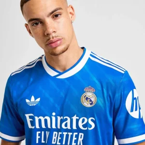 The Real Madrid 25/26 Third Stadium Jersey by Adidas features a striking royal blue base inspired by the blue seats of Santiago Bernabéu stadium. The jersey incorporates a subtle diagonal zigzag embossed pattern on the fabric that adds texture and depth, reflecting the contours of the stadium’s seating. White serrated Adidas three-stripes run along the shoulders and sleeves, complementing the retro style with the vintage Adidas Trefoil logo and the classic Real Madrid crest on the chest, fusing heritage with modern fashion culture.