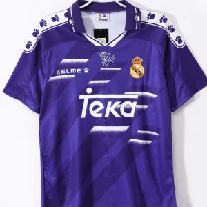 Step back into the mid-90s with the Real Madrid 1994-1996 Away Jersey, a classic piece from an era dominated by football legends such as Raúl, Redondo, Mijatović, and Luis Enrique. Manufactured by Kelme, this iconic away kit features a striking violet base, setting it apart from the traditional white home colors and adding a bold splash to your football collection.
