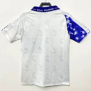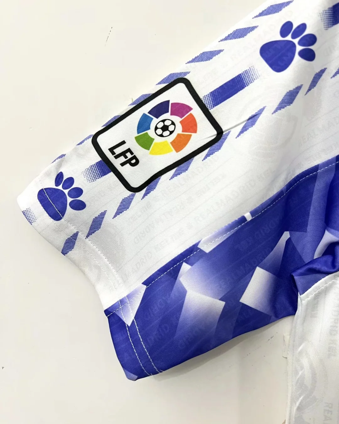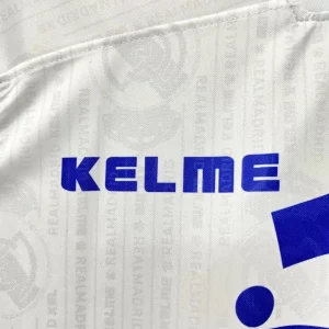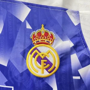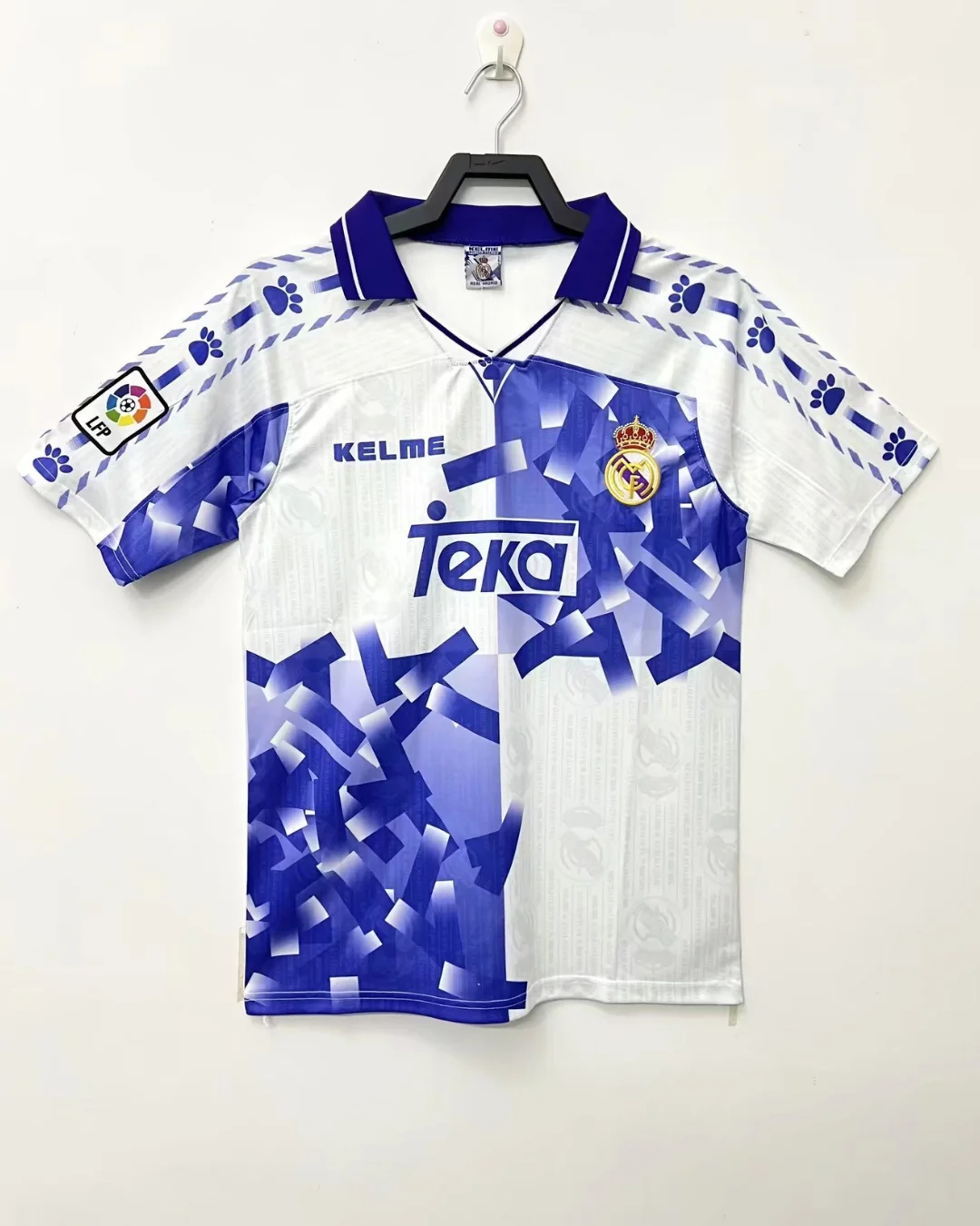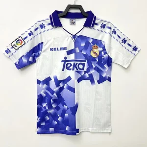 Relive one of Real Madrid’s most distinctive 1990s shirts with the Real Madrid 96/97 Third Jersey, a bold Kelme design worn during the club’s memorable 1996/97 La Liga-winning season. The jersey is instantly recognisable for its white base, purple geometric graphic panels, and all-over paw-print trim, with the Teka sponsor and club crest completing the classic mid-90s look. Its unusual colorway and striking pattern make it a true collector’s piece for Madridistas and retro football fans alike.