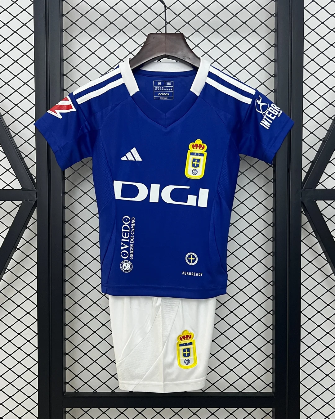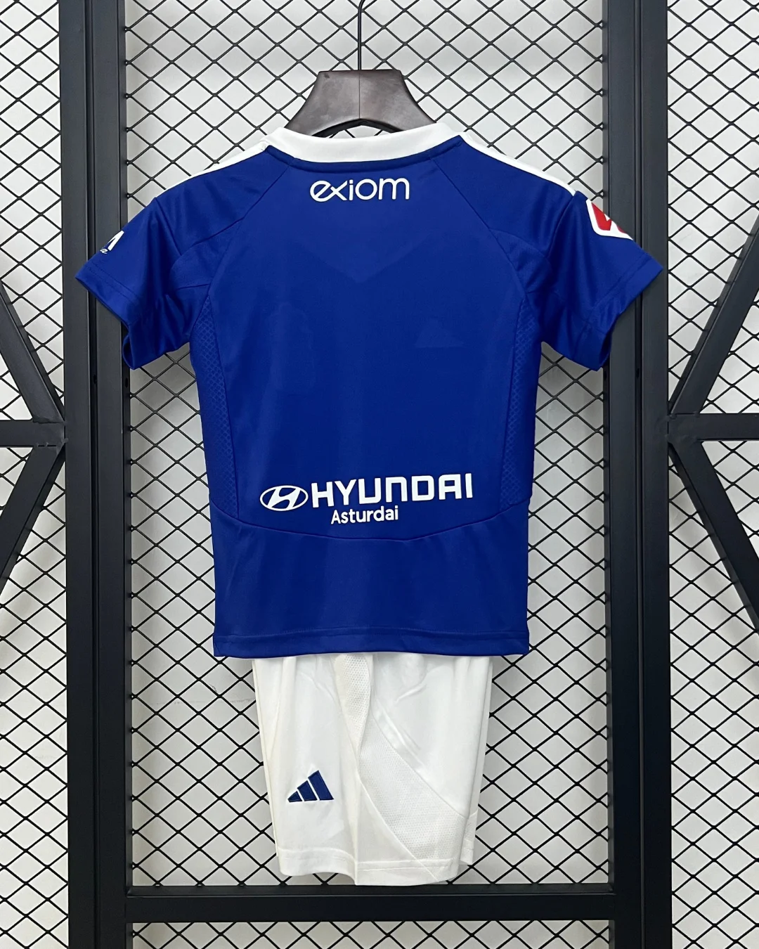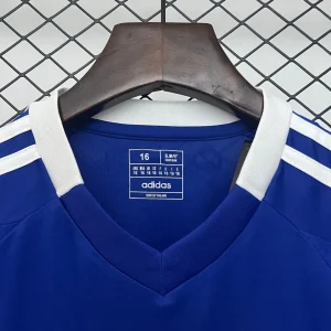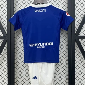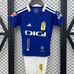 The adidas Real Oviedo Kids 24/25 Home Kit features a classic royal blue design with a V-neck collar alternating between blue and white, highlighting the traditional club colors for young fans. The shirt incorporates adidas signature stripes on the shoulders and is crafted with AEROREADY fabric technology for enhanced breathability and sweat evaporation, keeping kids comfortable during play or cheering.