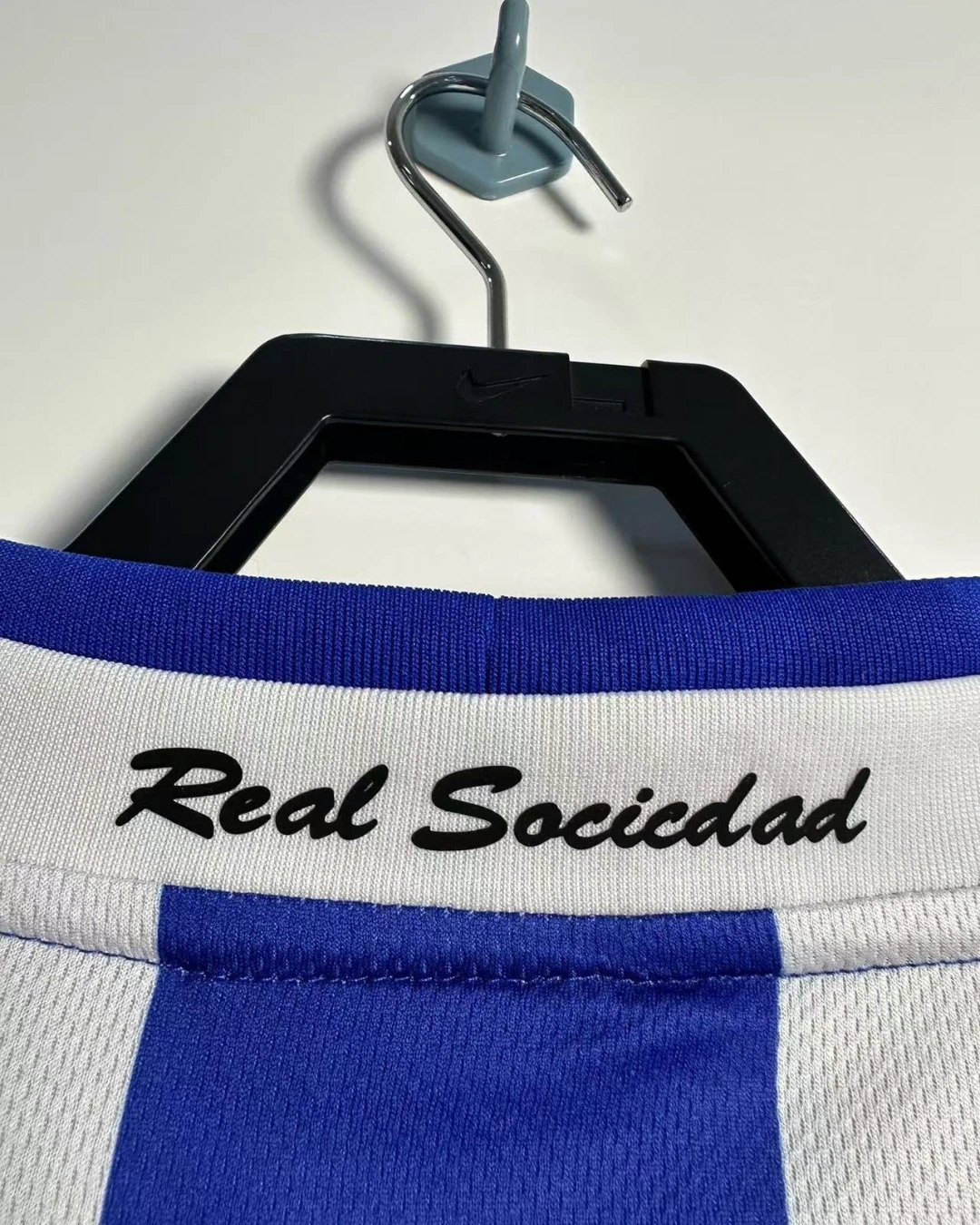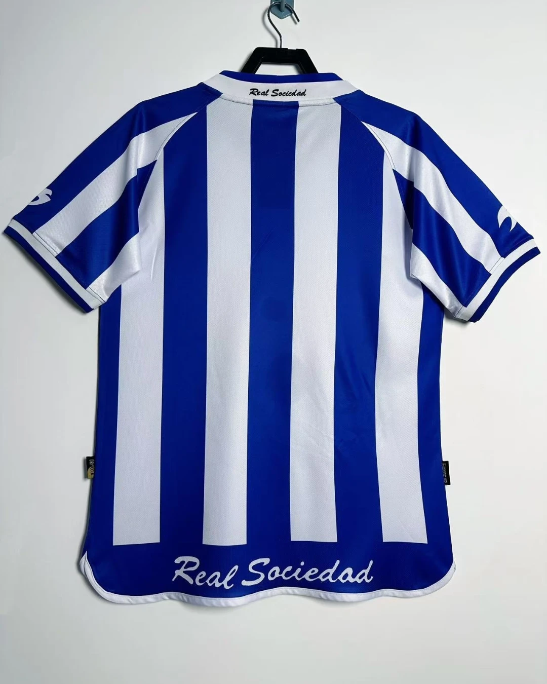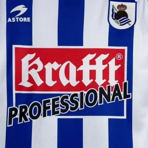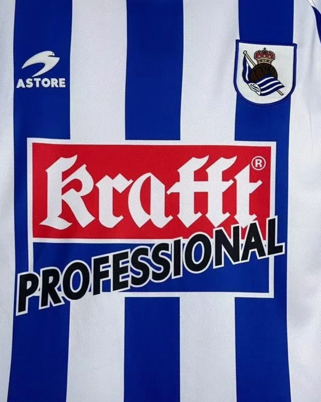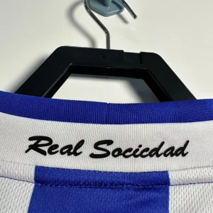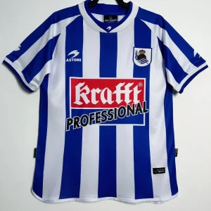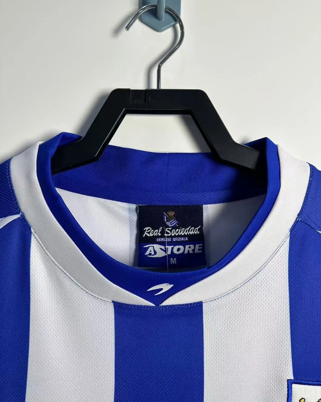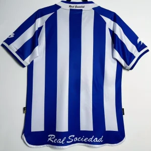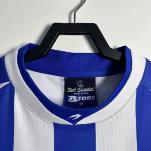 Real Sociedad’s 2002/03 Home Jersey from Astore powered their astonishing La Liga runner-up finish, the club’s best in 25 years at Anoeta Stadium, worn by Xabi Alonso, Nihat Kahveci, Darko Kovačević, and Javi Noya during John Toshack’s dream campaign just two points behind Real Madrid. The iconic blue and white vertical stripes feature a clean crew neck collar, embroidered Basque crest on left chest and Astore logo opposite, quintessential Txuri-Urdin design celebrating San Sebastián’s footballing golden generation.