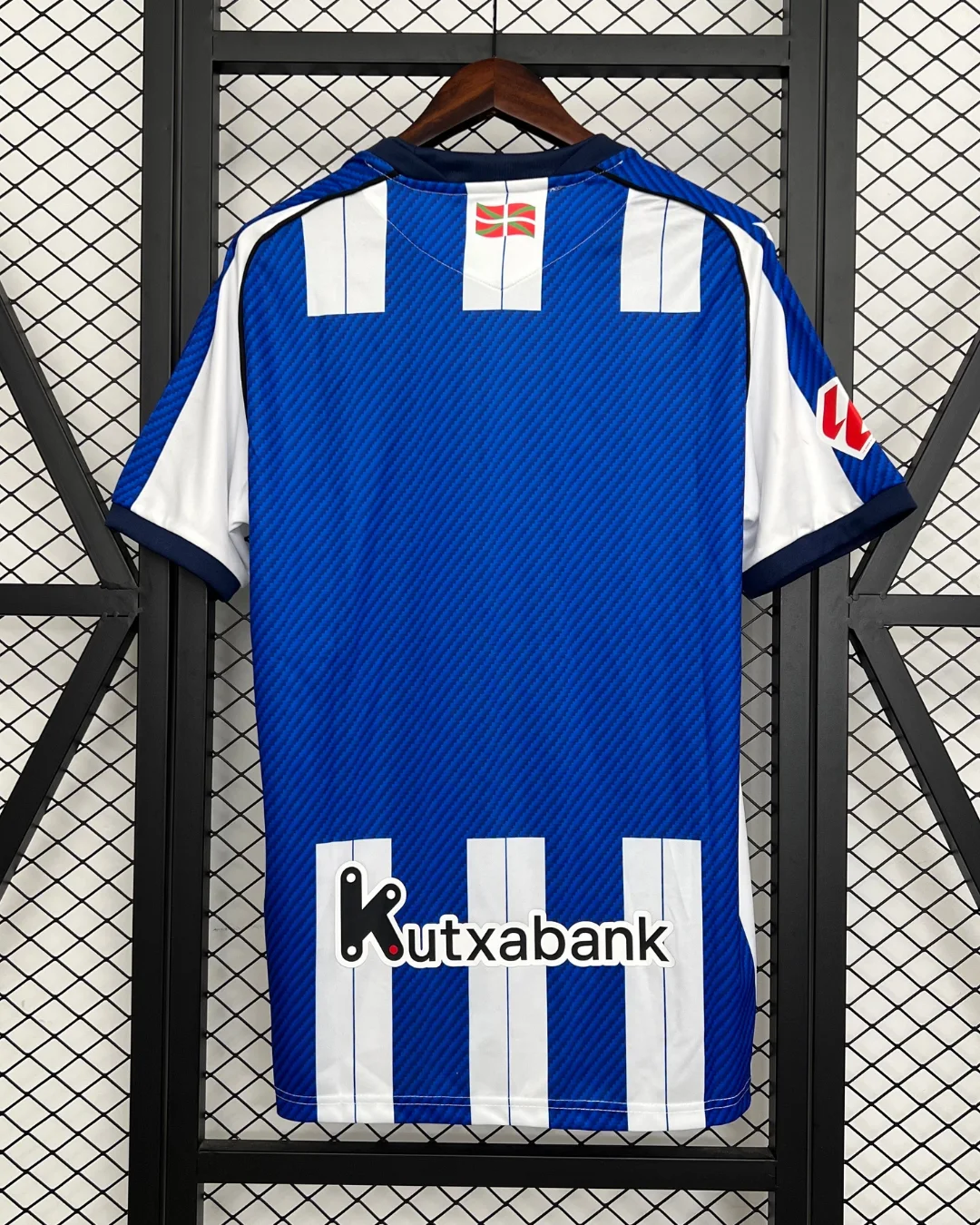 Embroidered Real Sociedad crest and Basque flag on upper back