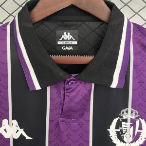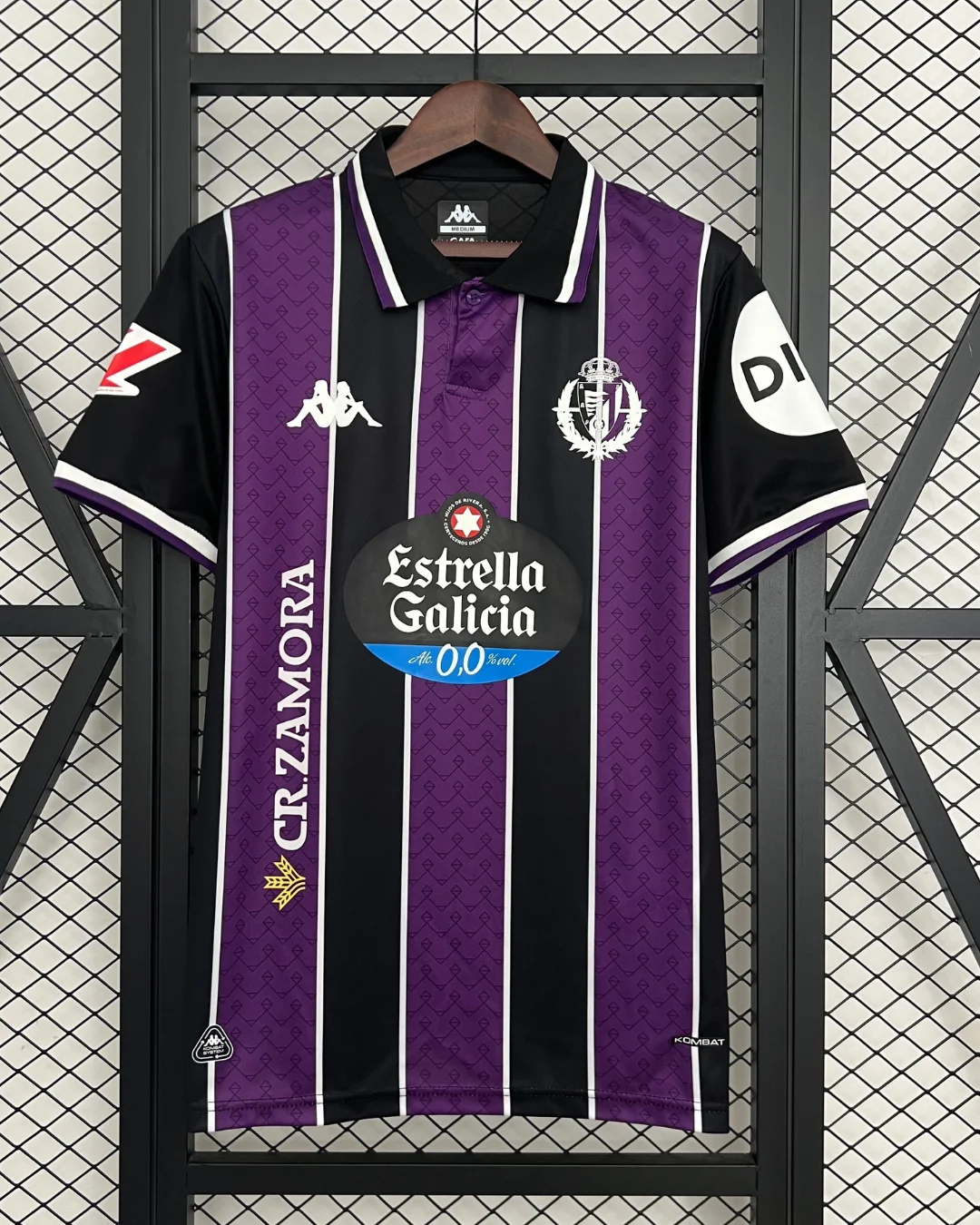 Show your support for the historic and resilient Real Valladolid with the Kappa 25/26 Away Stadium Jersey, inspired by the club’s proud identity and vibrant colors. This season’s away kit is a modern reinterpretation of the club’s iconic violet and white vertical stripes, with a fresh, bold look that pays homage to the club’s storied past. The jersey features a bold black base with violet vertical stripes outlined by thin white stripes and subtle, textured geometric patterns within the stripes, adding depth and sophistication.