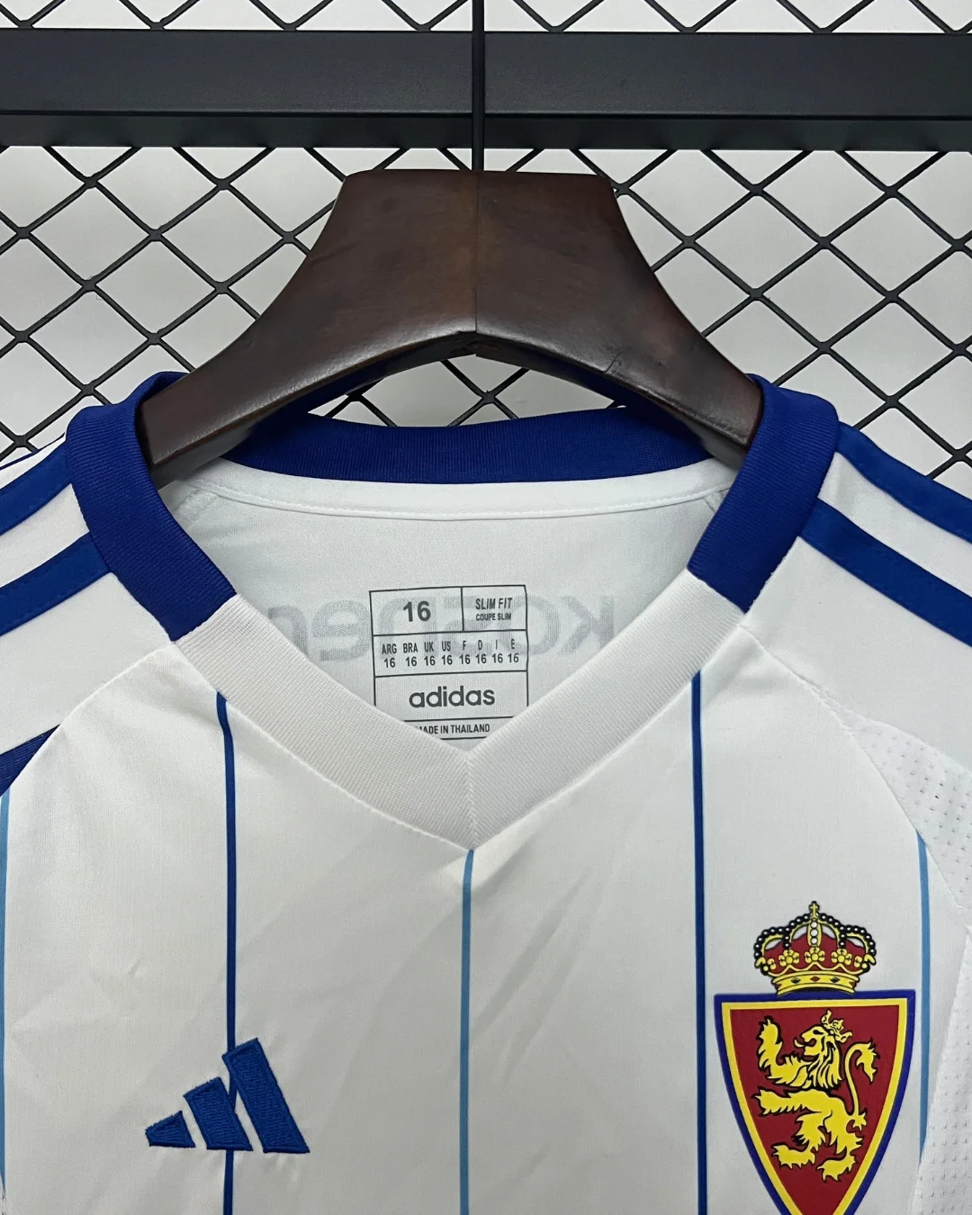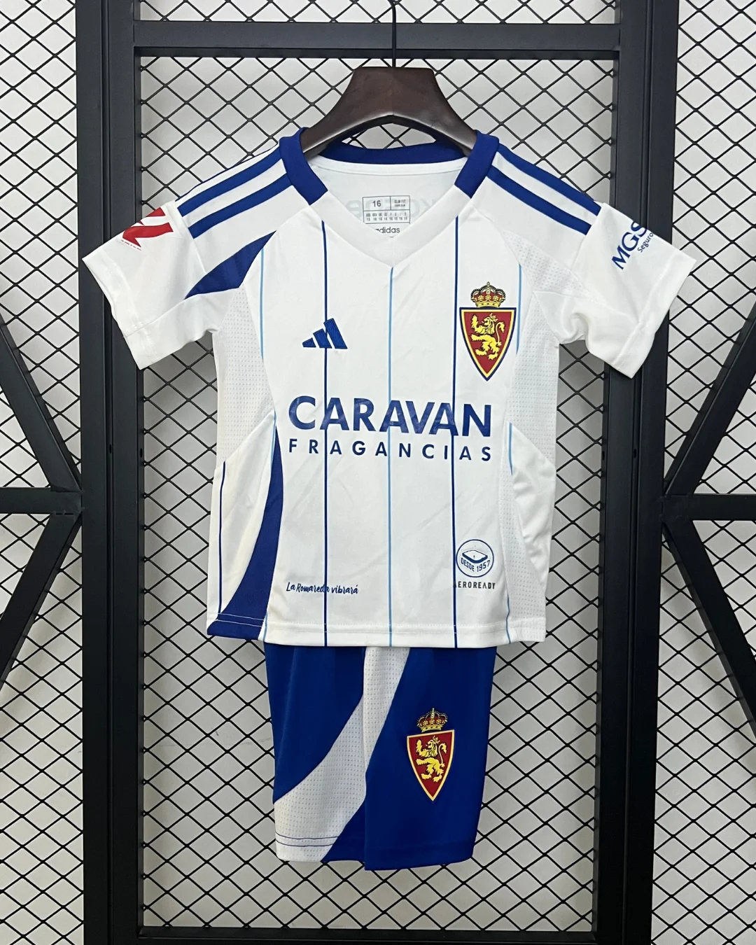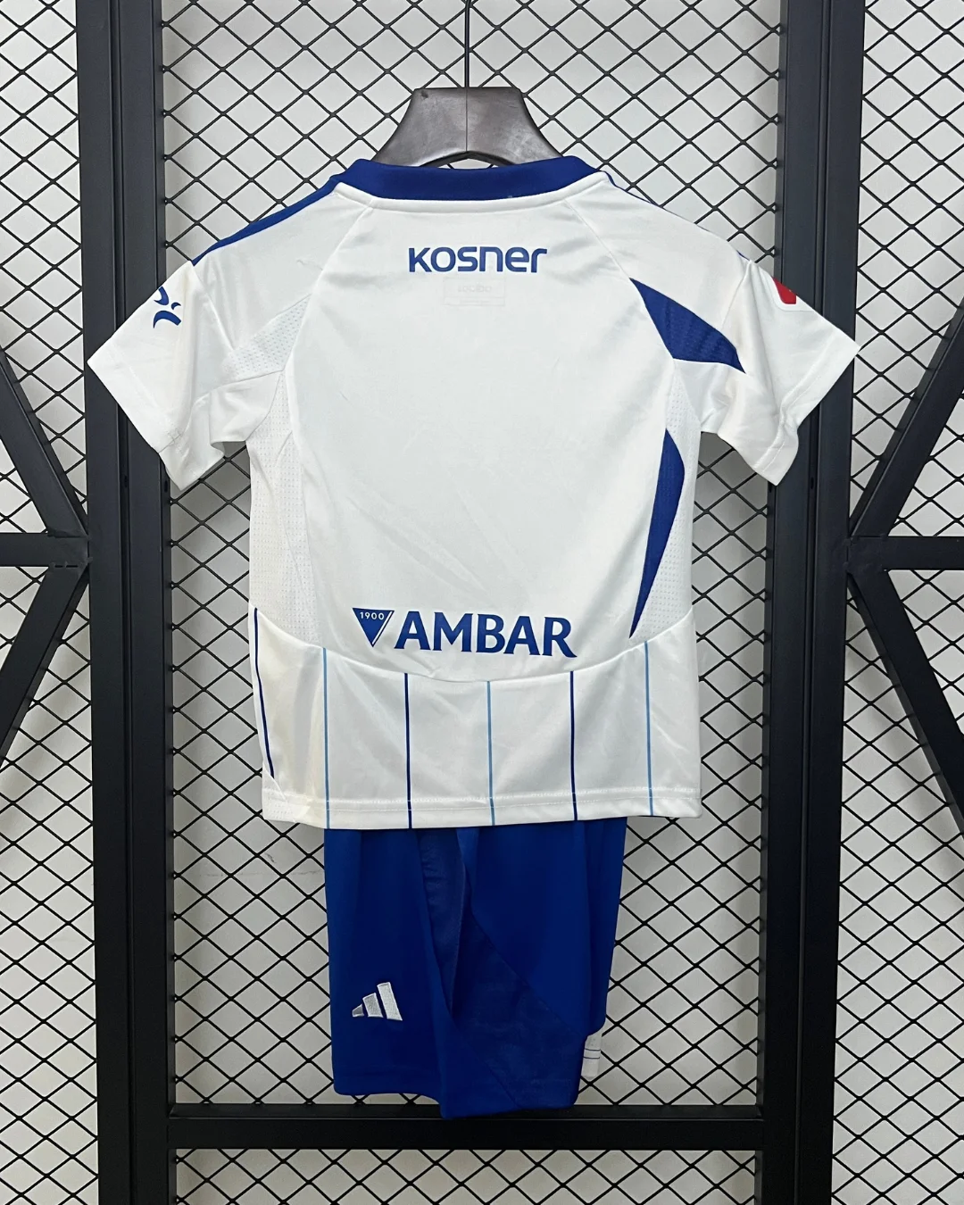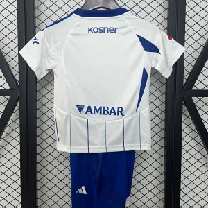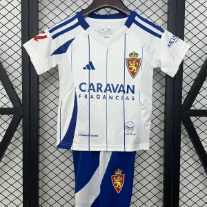 The adidas Real Zaragoza Kids 24/25 Home Kit features white base with blue pinstripes and accents, crafted with AEROREADY technology for superior moisture-wicking and breathability to keep young fans comfortable during matches or play. This home jersey includes an embroidered lion crest, flocked numbering options, and authentic sponsor details, paired with matching shorts featuring mesh ventilation panels on the back.