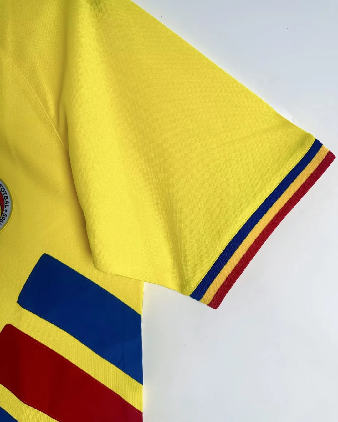 Romania’s legendary 1994 World Cup Home Jersey from Adidas powered Anghel Iordănescu’s golden generation to their best-ever tournament finish, reaching the quarterfinals after topping Group D and stunning Argentina 3-2 in the Round of 16, worn by Gheorghe Hagi, Dan Petrescu, Ilie Dumitrescu, and Florin Răducioiu during their USA ’94 heroics. The iconic yellow base with red and blue accents features V-neck collar, embroidered Romanian tricolor shield crest on left chest, Adidas logo on the center, and sponsor-free purity across the chest, timeless Tricolor design embodying Eastern Europe’s football renaissance.