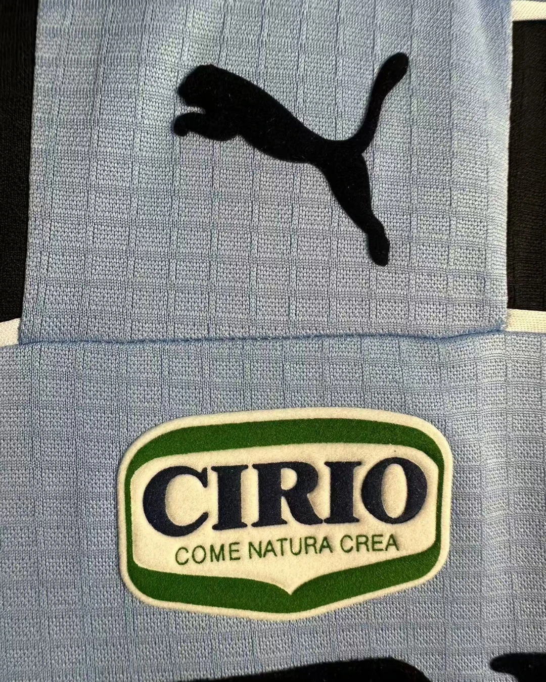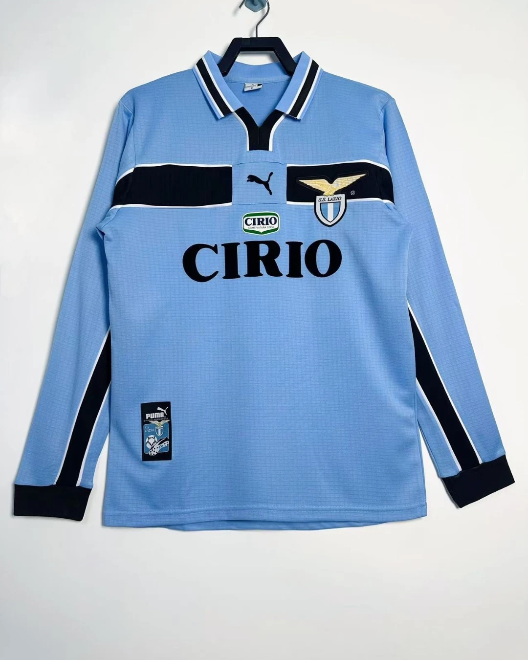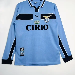 S.S. Lazio’s classic 1998/00 Long Sleeve Home Jersey from Puma fueled their UEFA Cup Winners’ Cup triumph and strong Serie A campaign under Sven-Göran Eriksson, worn by stars like Alessandro Nesta, Pavel Nedvěd, and Marcelo Salas during European glory at the Olimpico. The iconic sky blue base with subtle black chest band detailing features the embroidered eagle crest on the left chest, Puma cat logo, V-neck collar, and prominent “CIRIO” sponsor across the front, capturing quintessential Biancocelesti elegance from Eriksson’s rising dynasty.