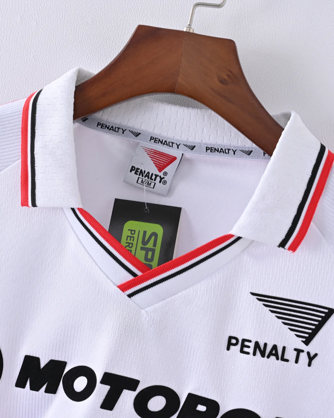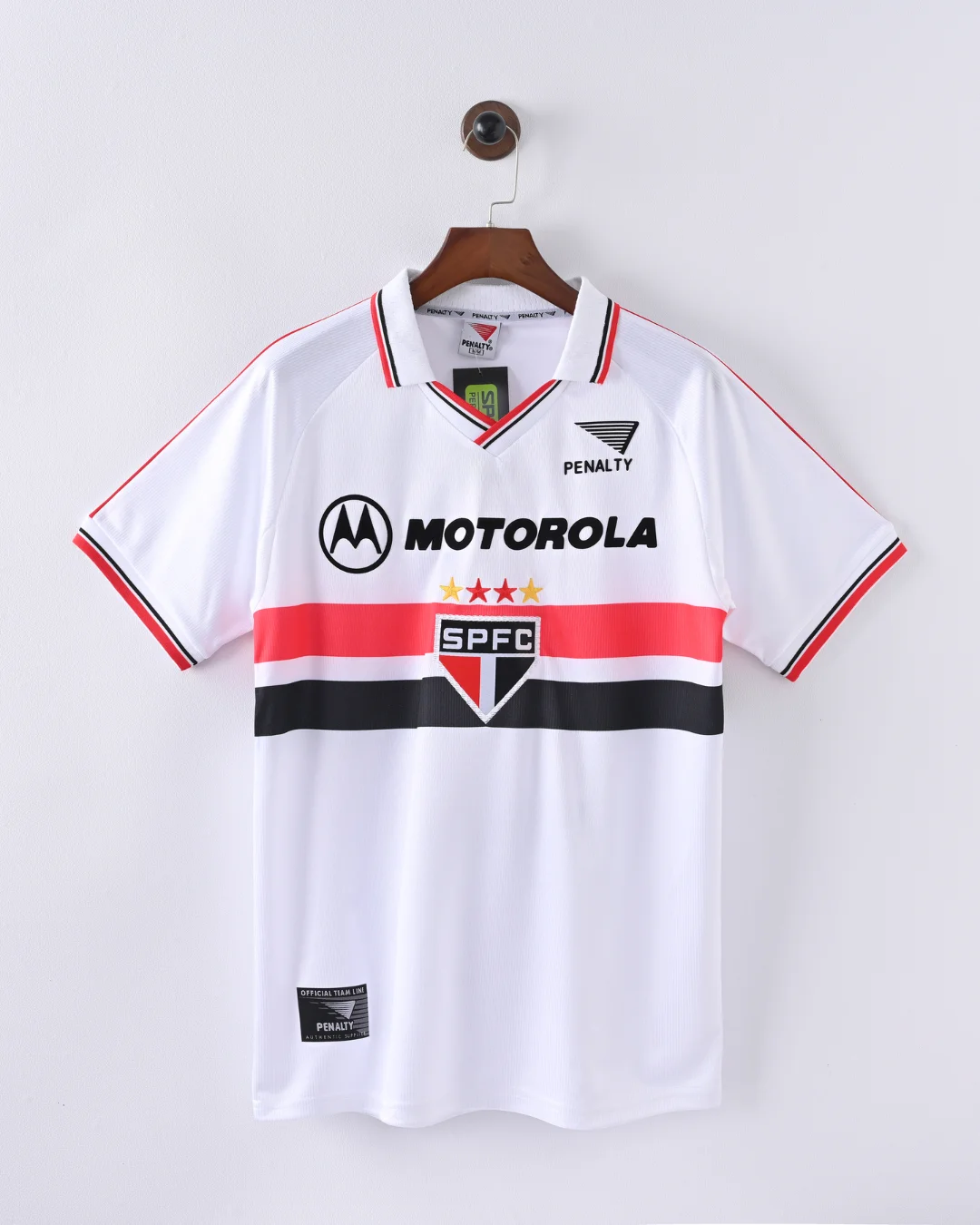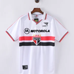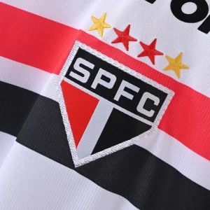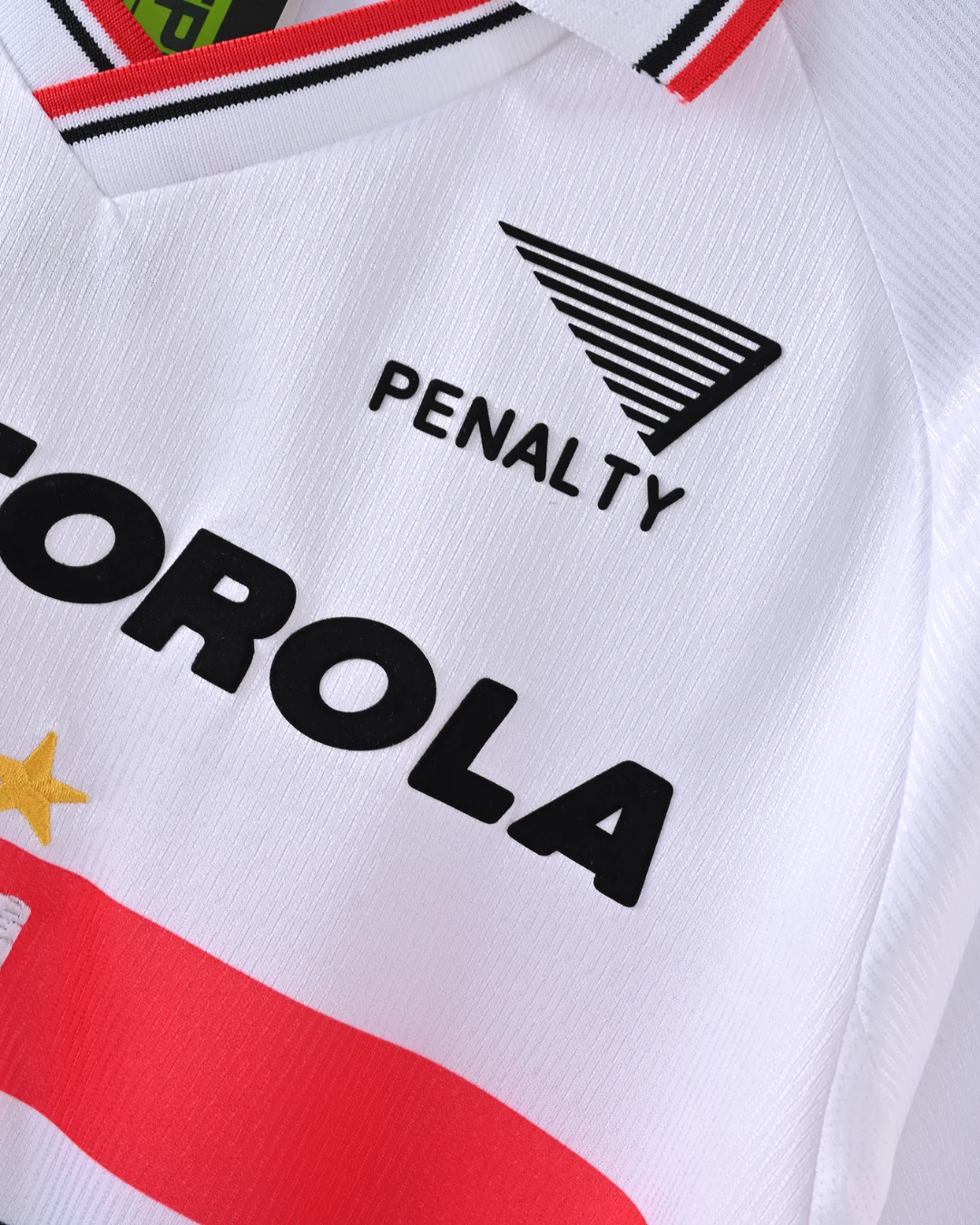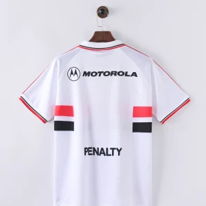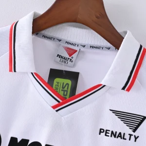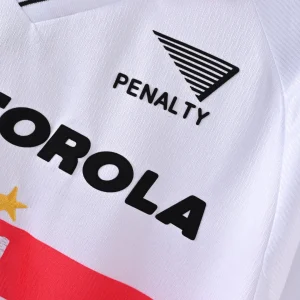 The São Paulo FC 2000 Home Jersey is a rare and iconic retro football shirt, worn during a significant period when São Paulo won the Campeonato Paulista and competed strongly in the Brazilian Serie A. Manufactured by Penalty, this classic jersey features the club’s traditional white base accented with the distinctive red, black, and white stripes that represent São Paulo’s rich heritage. A key design highlight is the elegant collar style, complemented by subtle yellow details that frame the embroidered club crest, adding a fresh contrast to the traditional colors.
