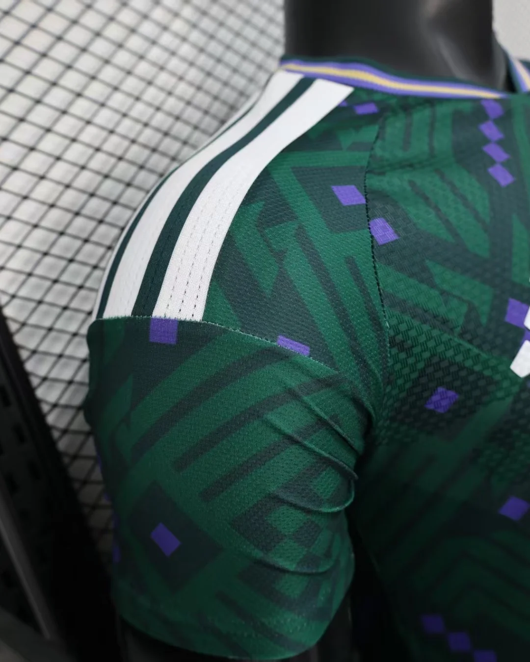Celebrate the rich cultural heritage and football pride of Saudi Arabia with the Adidas 2026 World Cup Home Authentic Jersey, designed to inspire both players and fans on the global stage. This jersey features a dark green base, symbolizing the nation’s deeply rooted traditions and the lush landscapes of Saudi Arabia. Accents of purple and gold elevate the design, adding a sophisticated and contemporary edge that reflects the country’s blend of modernity and heritage. Inspired by traditional Saudi Arabian doorway art and accented with lilac hues reminiscent of lavender fields, a subtle geometric pattern runs across the fabric, creating depth and visual interest while connecting to the nation’s artistic legacy.