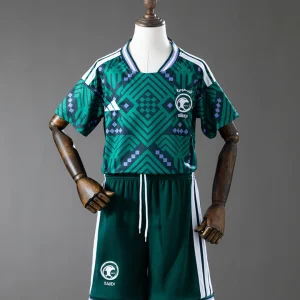 The Saudi Arabia Kids 2026 WC Home jersey is a fresh youth version of adidas’ 2026 home kit, built in a deep green color with modern purple and white accents inspired by Saudi artistic heritage. The design draws on the intricate door art of Saudi homes, giving the shirt a bold national identity that feels both traditional and contemporary. Made for comfort and active wear, this kids’ jersey uses adidas CLIMACOOL technology with fast-drying fibers to help keep young fans cool and dry during training, match play, or everyday use.