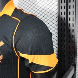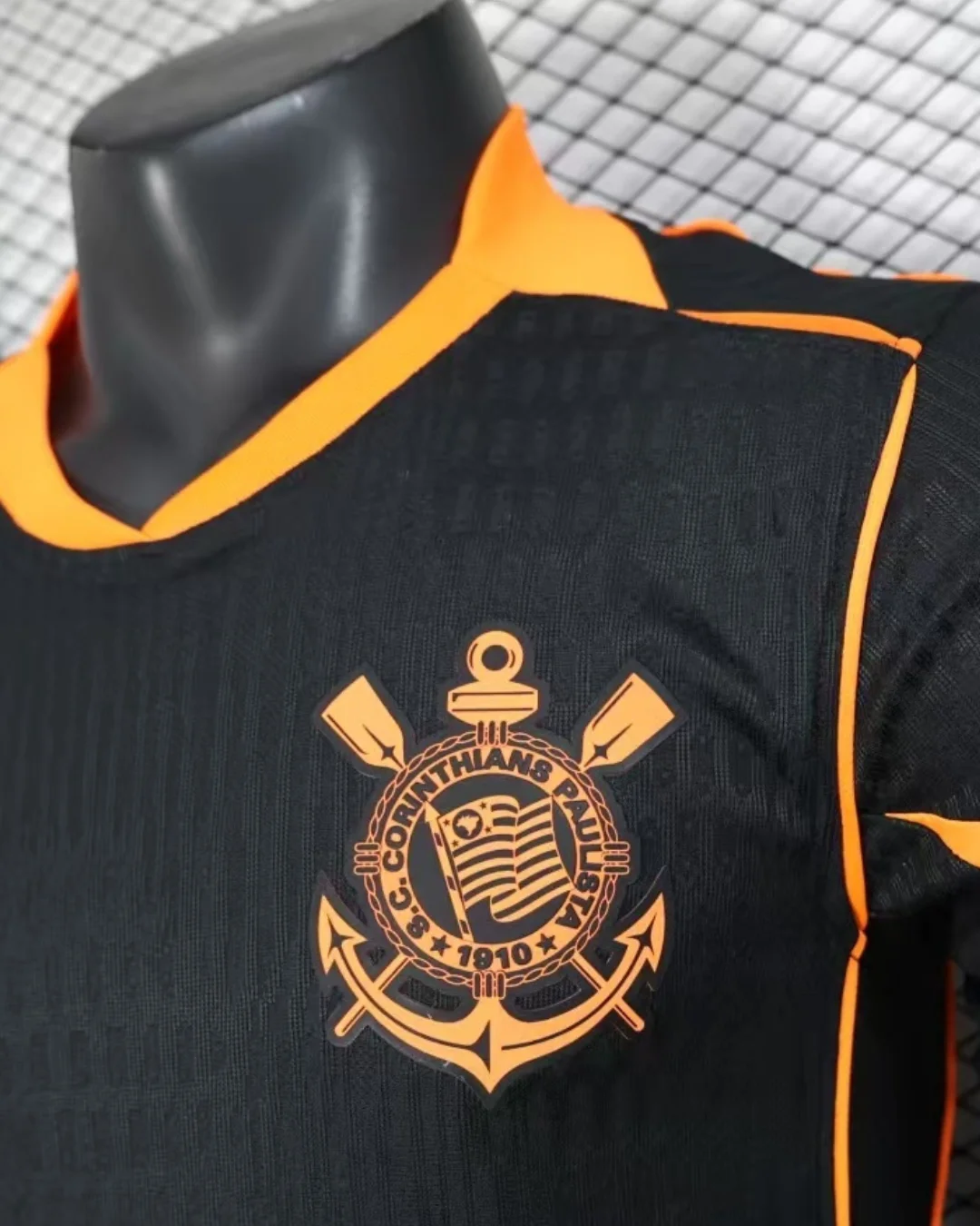 Celebrate the bold spirit of the SC Corinthians with the 25/26 Third Authentic Jersey, crafted by Nike. This striking jersey pays homage to the iconic Total 90 era from the early 2000s, featuring a modern take on the legendary look. The jersey is predominantly black with vibrant orange detailing, including the Nike Swoosh, piping, and club crest, which create a powerful and dynamic aesthetic.