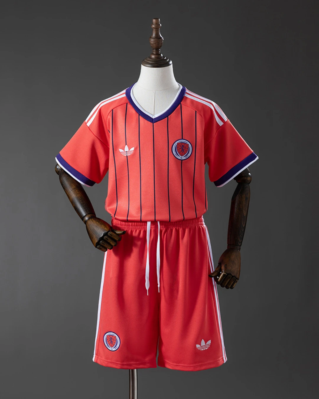 The Scotland Kids 2026 WC Away kit arrives in a vibrant Trace Scarlet base with navy pinstripes, giving young Tartan Army fans a bold modern look with a touch of retro inspiration. The shirt features a V-neckline, short sleeves, and the Scotland crest, plus adidas 3-Stripes and Trefoil branding for an authentic national-team finish. Designed for comfort on and off the pitch, this kids away kit uses CLIMACOOL technology to help keep kids cool, dry, and focused during play.